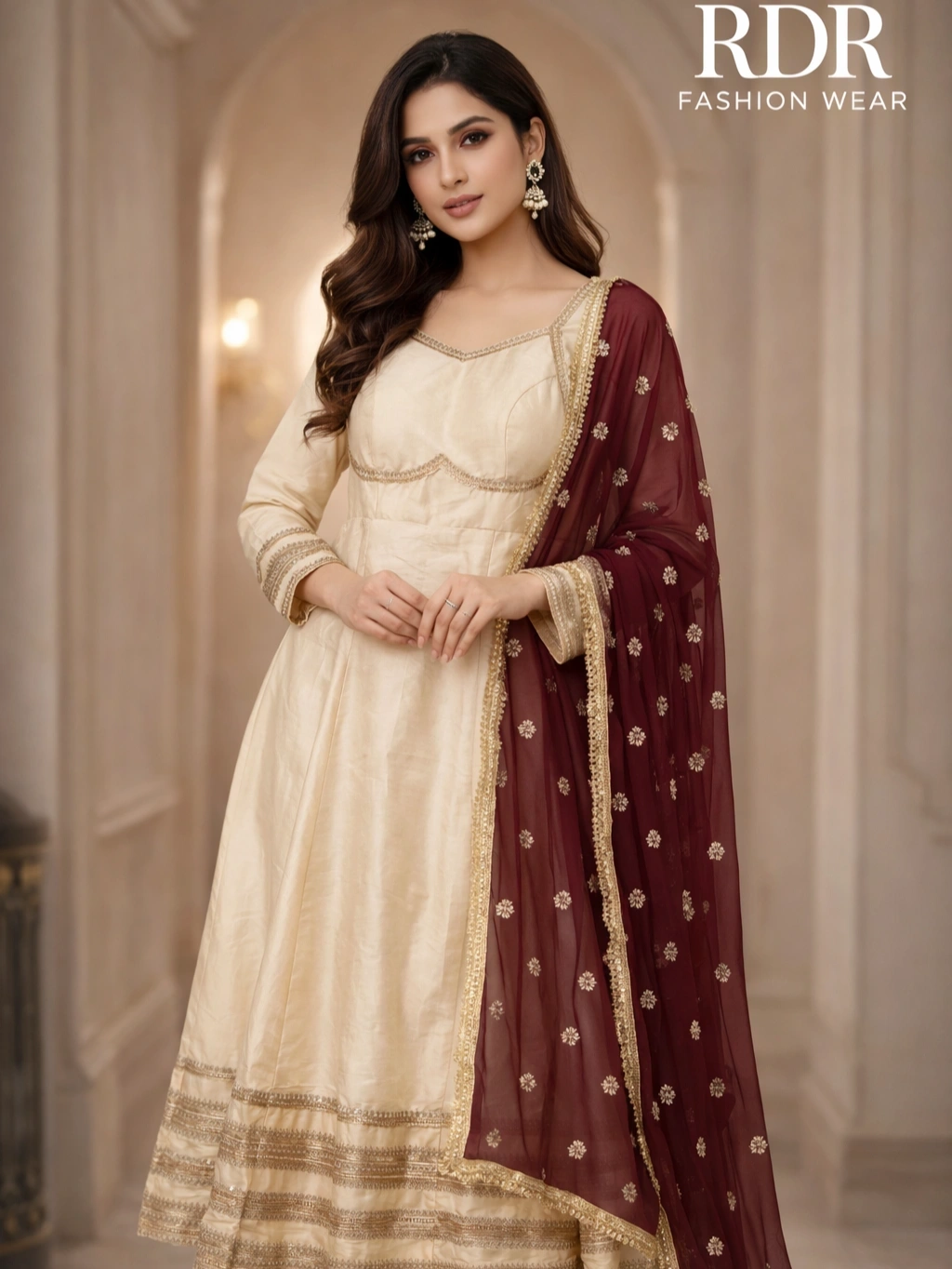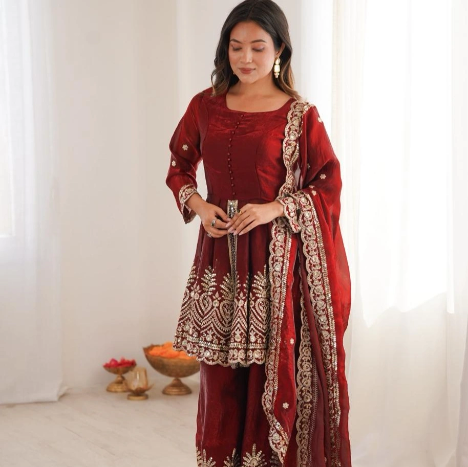 Elegant Beige & Red Embroidered Kurta Palazzo Set