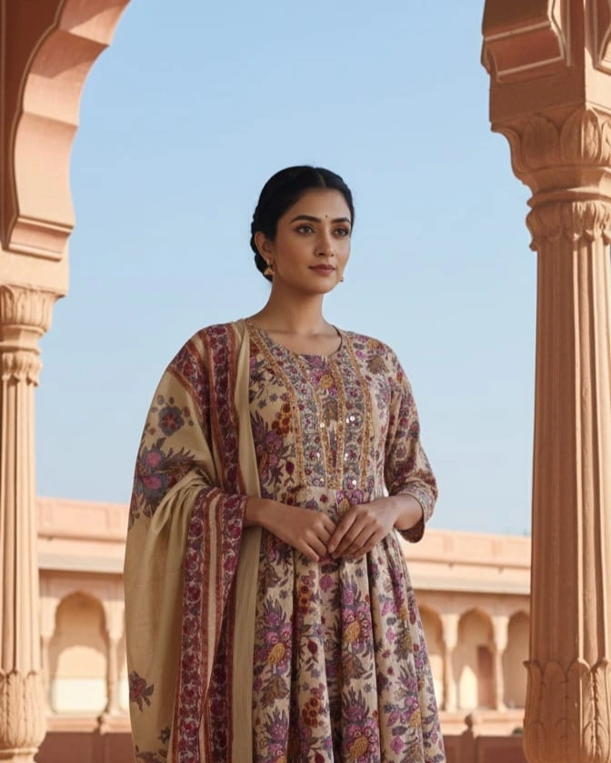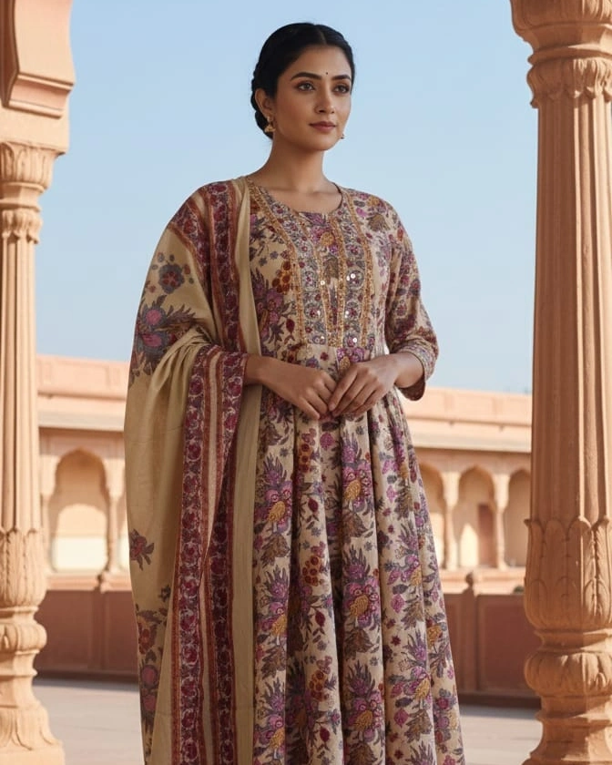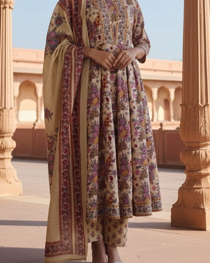 Step into timeless grace with this beautifully crafted beige Anarkali kurta set, adorned with intricate floral prints inspired by traditional artistry. The flowy silhouette, detailed neckline, and matching printed dupatta create a perfect blend of heritage charm and modern elegance. Ideal for festive occasions, cultural gatherings, and refined daywear.
