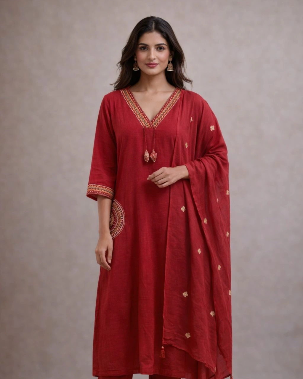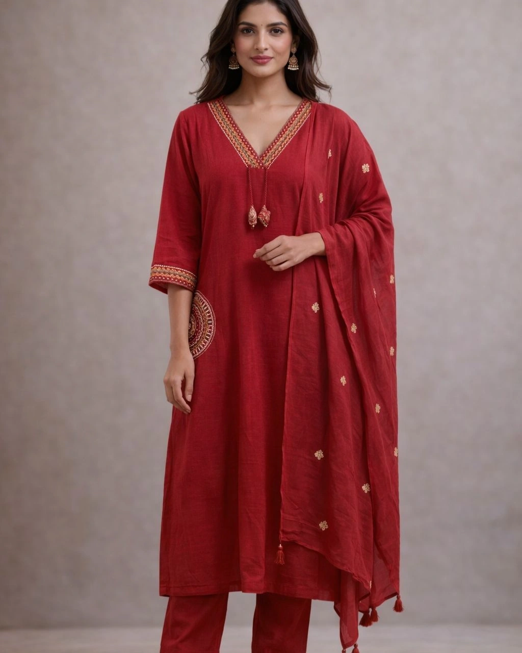 Elegant Crimson Red Embroidered Kurta Pant Set with Designer Dupatta