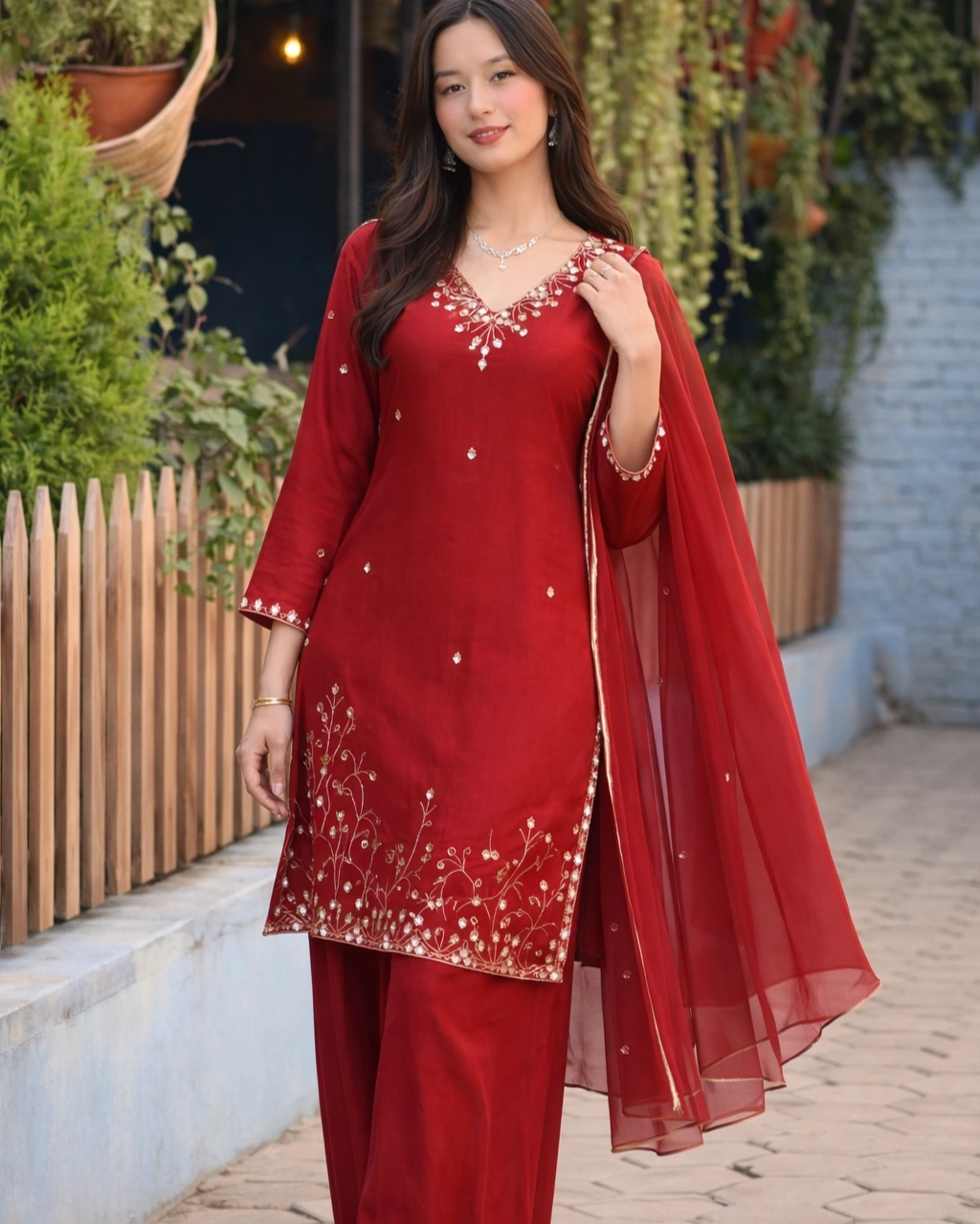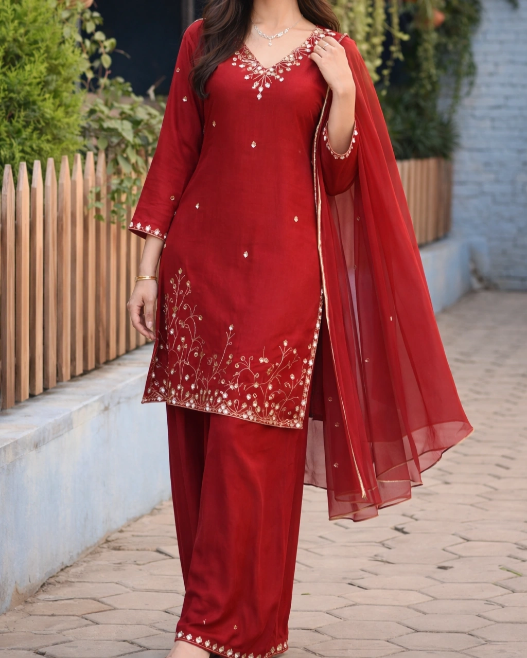 Product Name: Deep Red Embroidered Kurta Palazzo Set with Dupatta