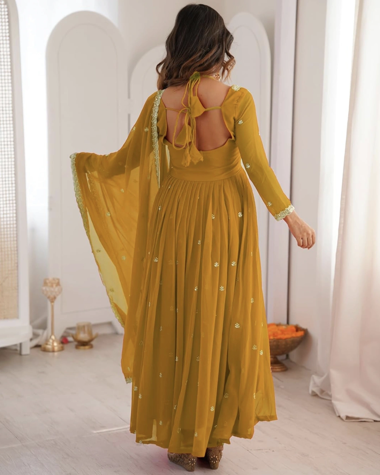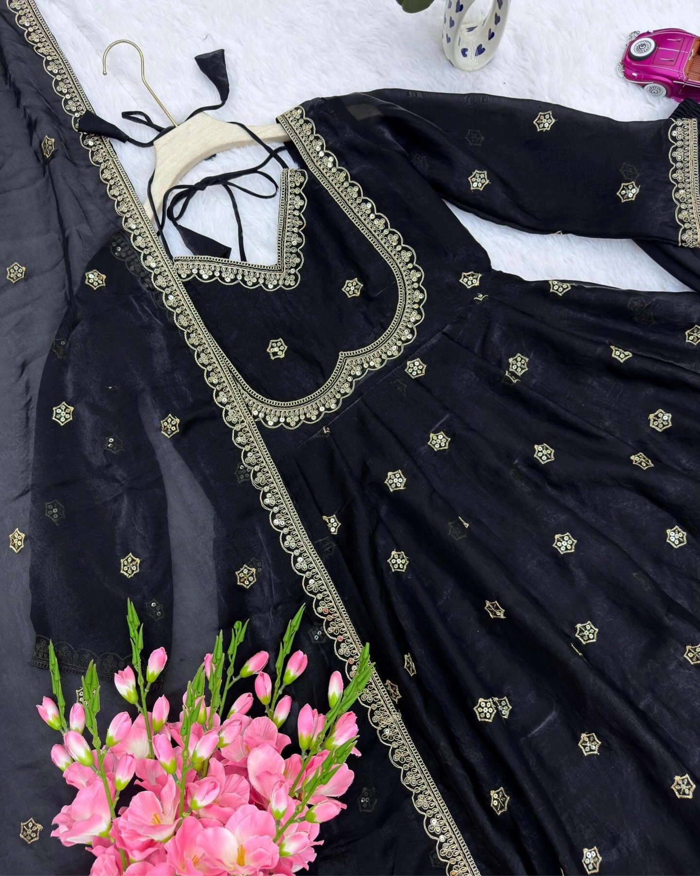 Work: Intricate Golden Zari Embroidery on the neckline and sleeves. Features heavy star-patterned butti work across the flare and a designer back-neck with adjustable Dori.