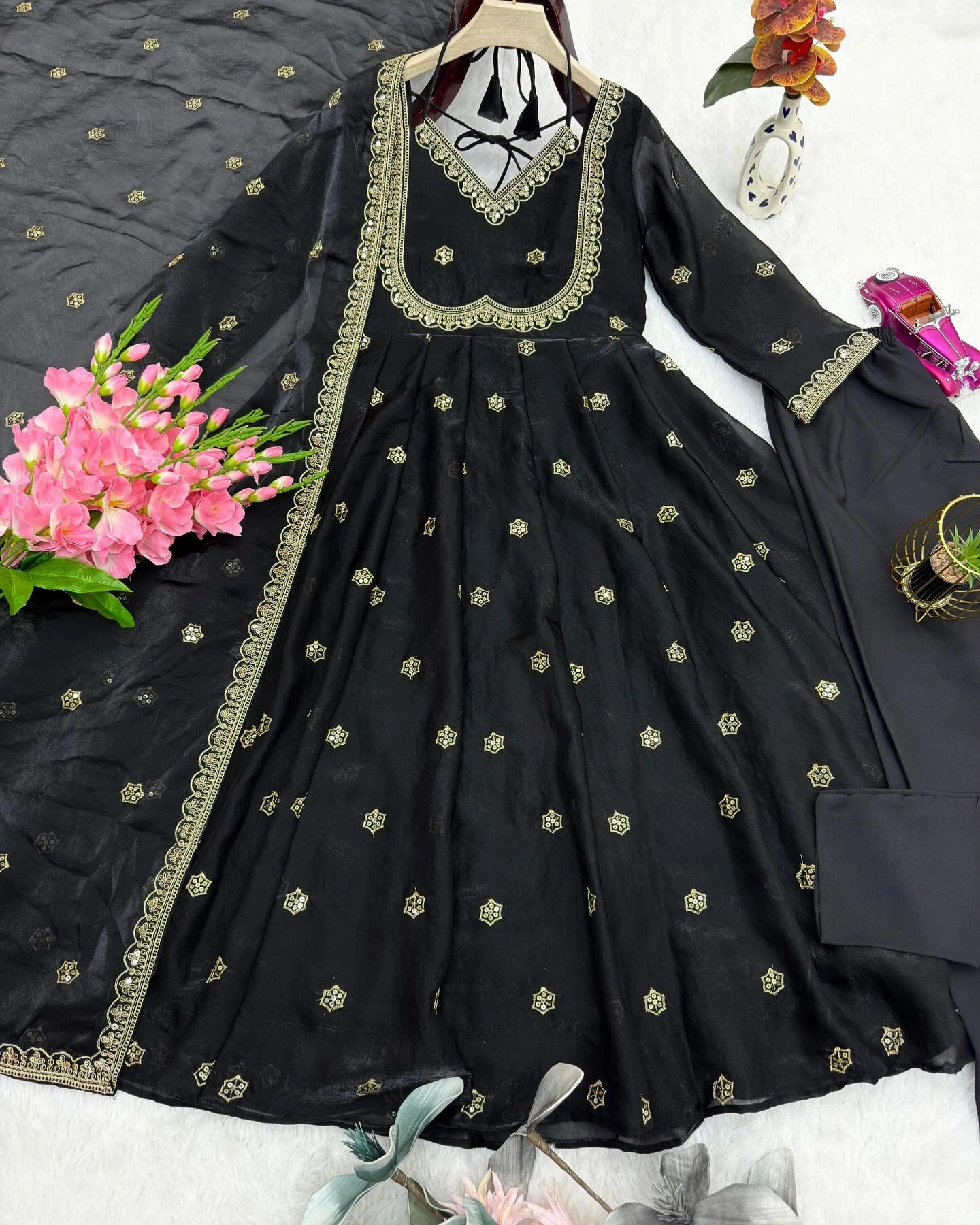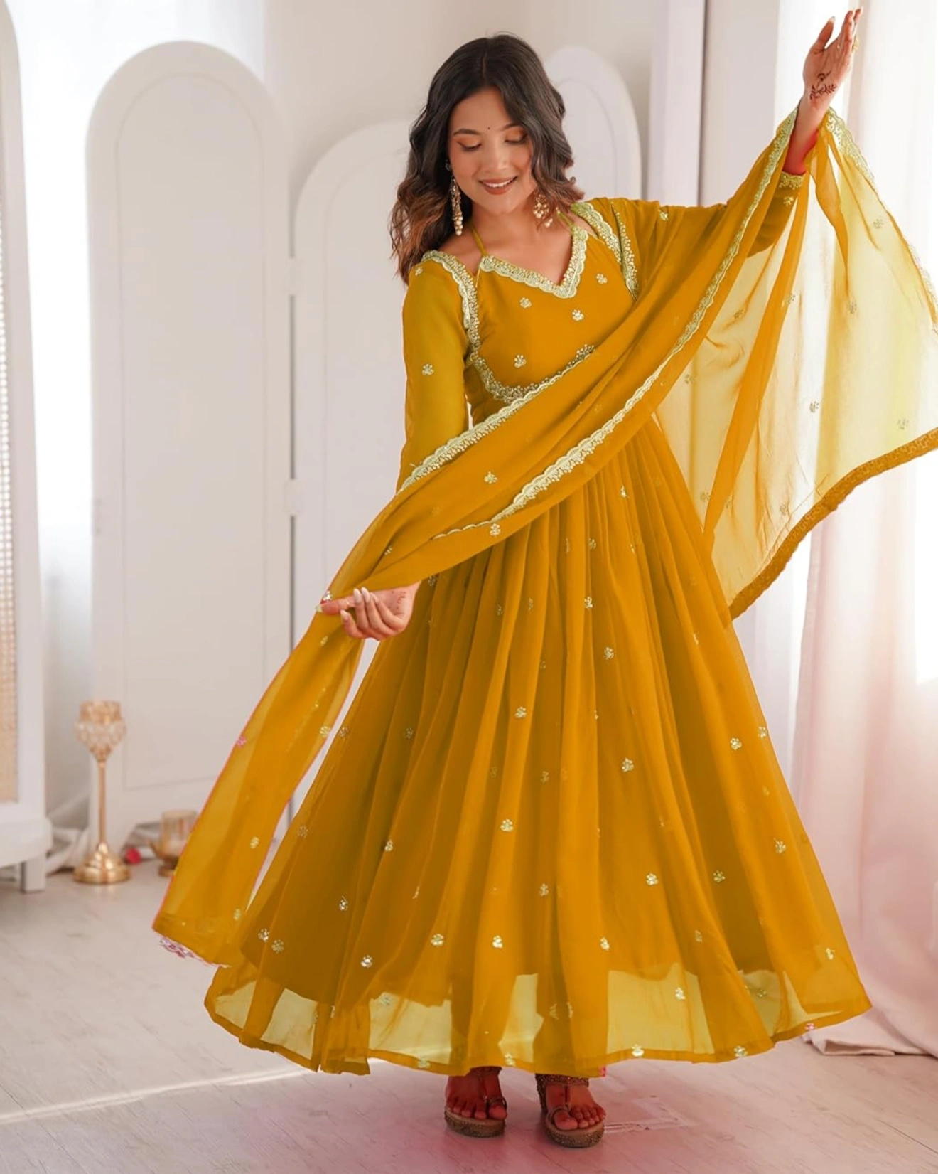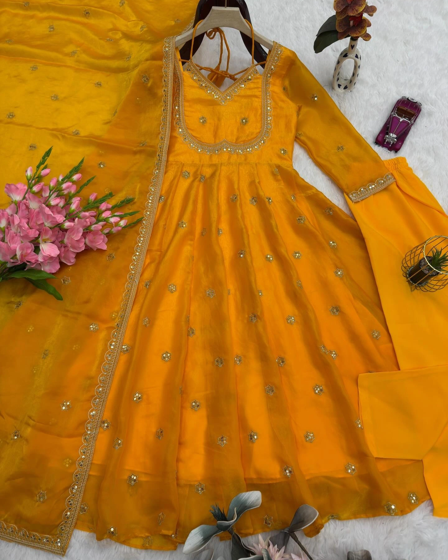 Fabric: Premium Silk / Organza Blend (Provides a luxurious shine and structured flare)