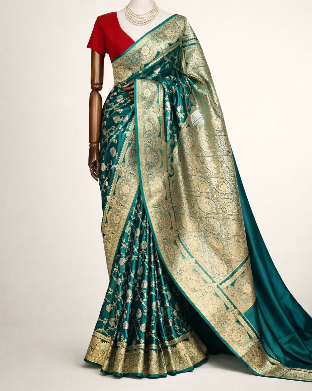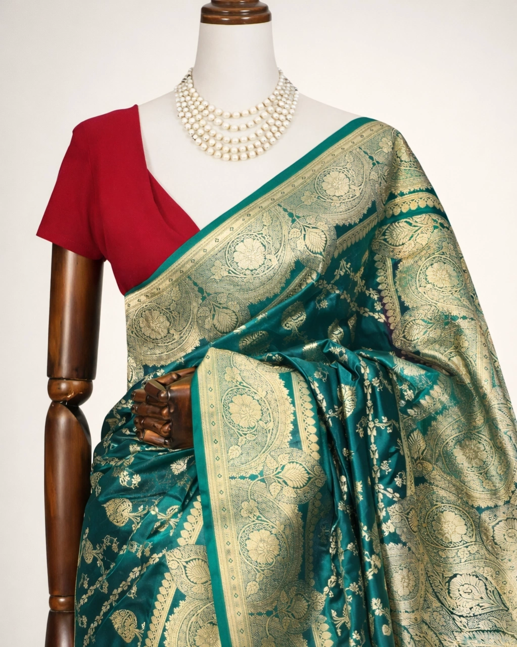 Rich Teal Green with Antique Gold Zari Border and Red Blouse Contrast