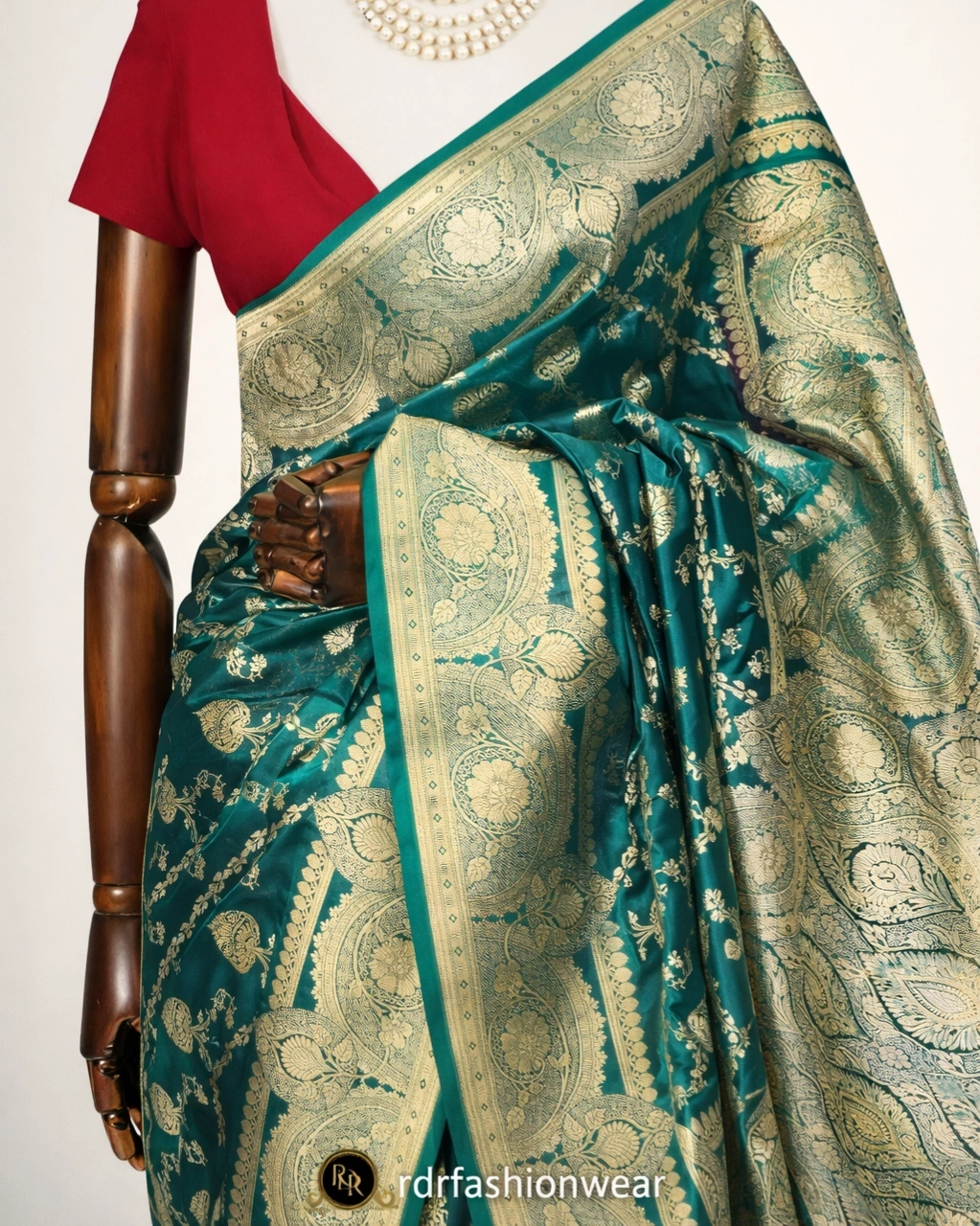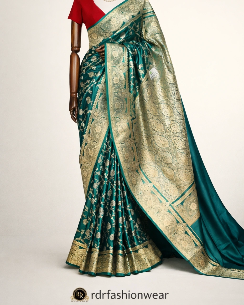 This luxurious Banarasi lehenga style saree from RDR Fashion Wear showcases timeless elegance with intricate gold zari weaving on a rich teal green base. The saree features a grand traditional border and beautifully detailed motifs across the body, giving it a royal and festive look. Paired with a contrasting red blouse, this saree is a perfect choice for weddings, Dashain, Tihar, and special celebrations.