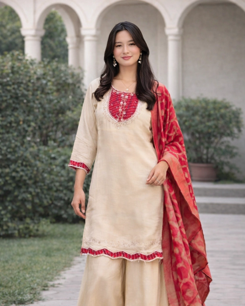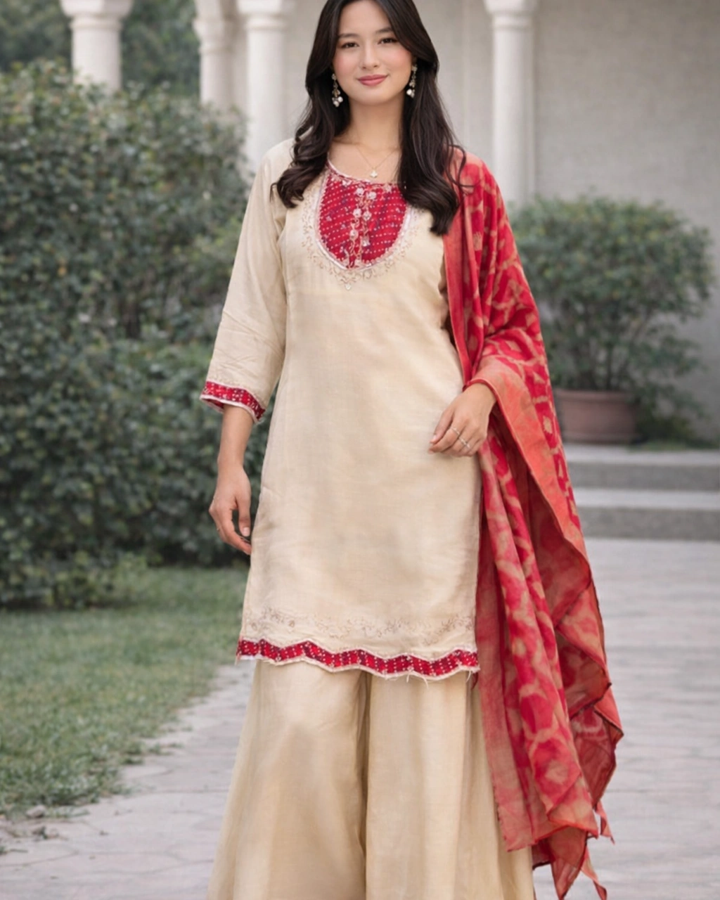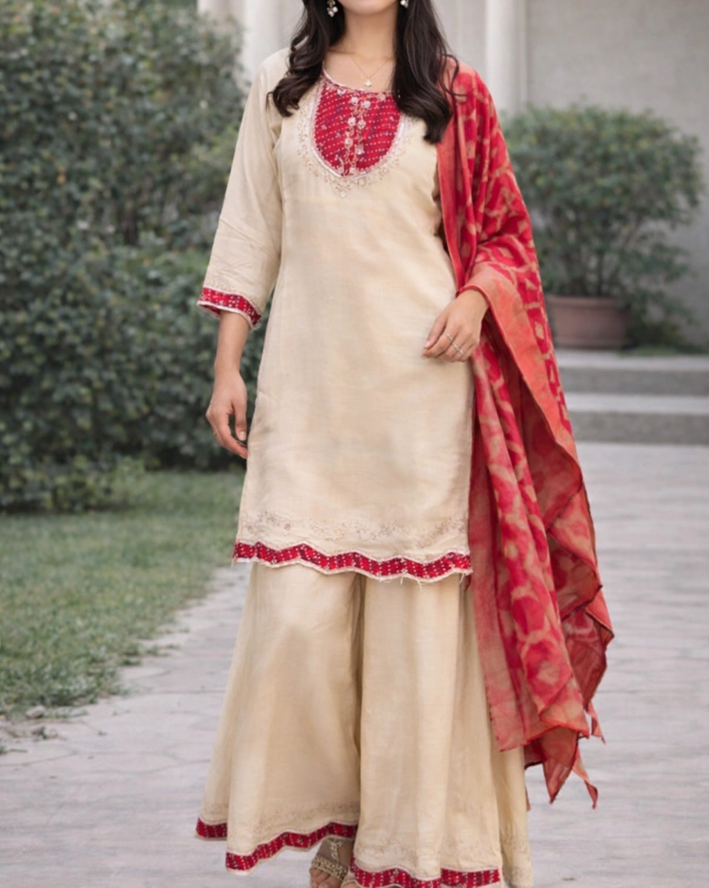 Product Name: Elegant Beige & Red Embroidered Kurta Palazzo Set