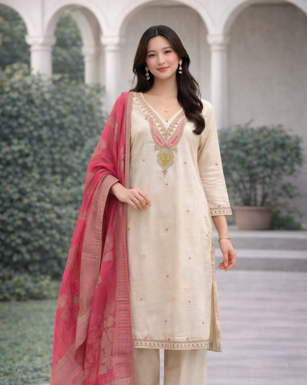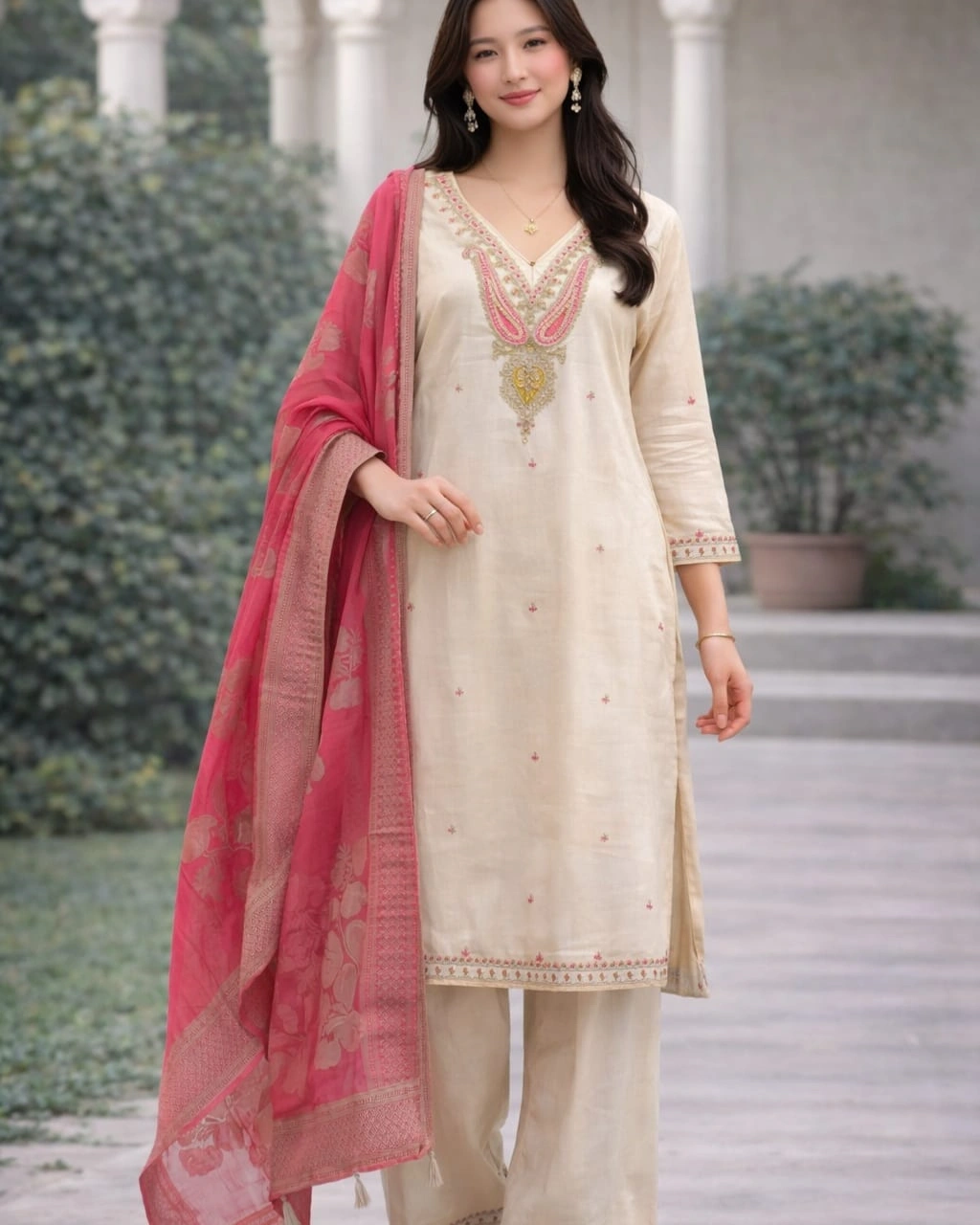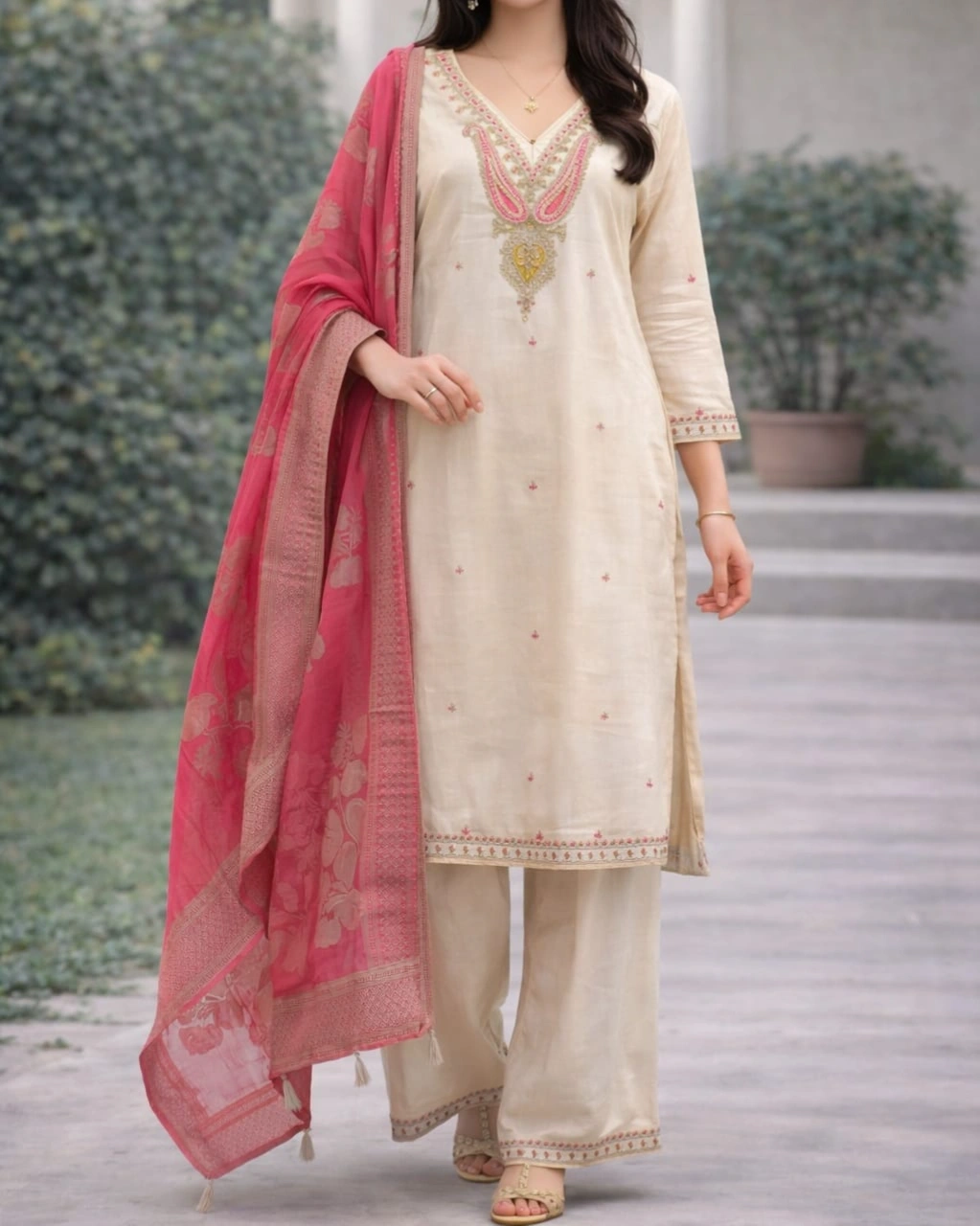 Color: Soft Beige Kurta & Bottom with Pink Designer Dupatta