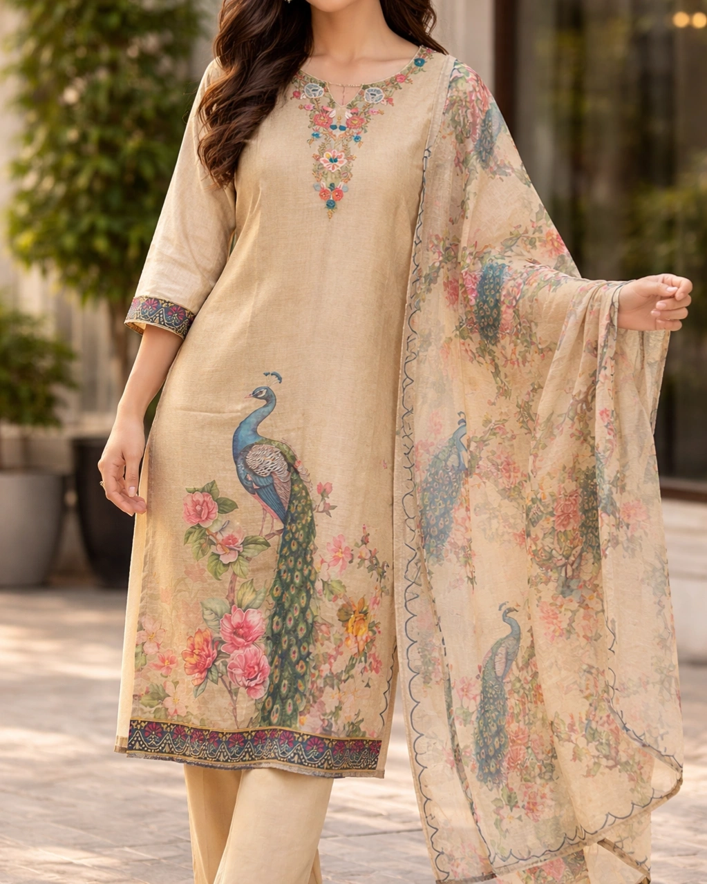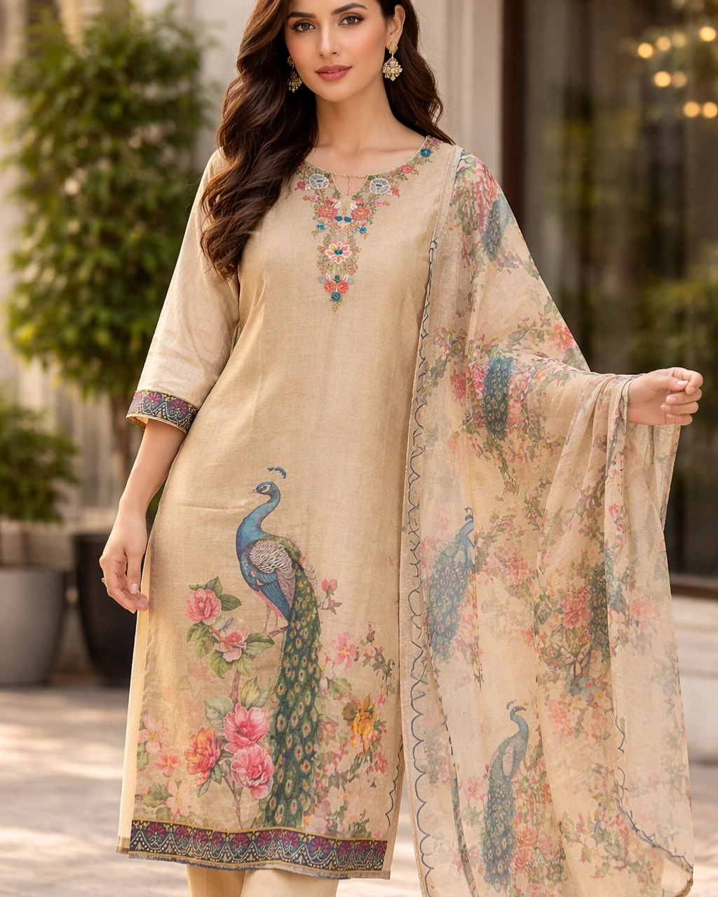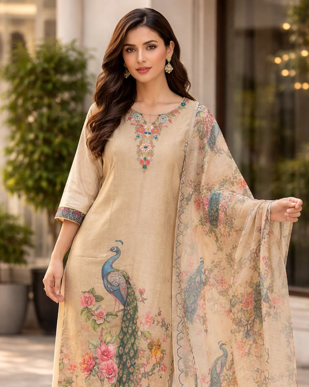 Style: Elegant ethnic outfit perfect for festive occasions, cultural gatherings, casual celebrations, and daytime events. The soft beige base combined with vibrant peacock and floral artwork gives the outfit a luxurious and unique traditional appeal.