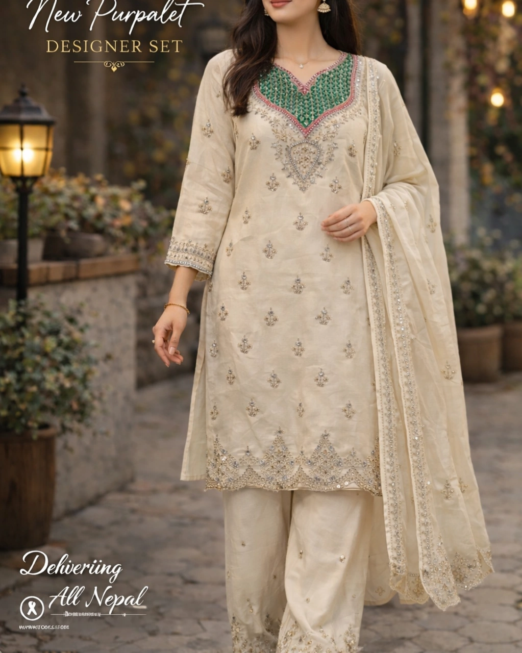 Work: Beautiful handcrafted embroidery on the neckline with elegant green thread detailing that adds a unique designer touch. The kurtha features delicate small motifs throughout with intricate embroidery on the hemline and sleeves. The dupatta is finished with stylish embroidered borders for a graceful traditional look.