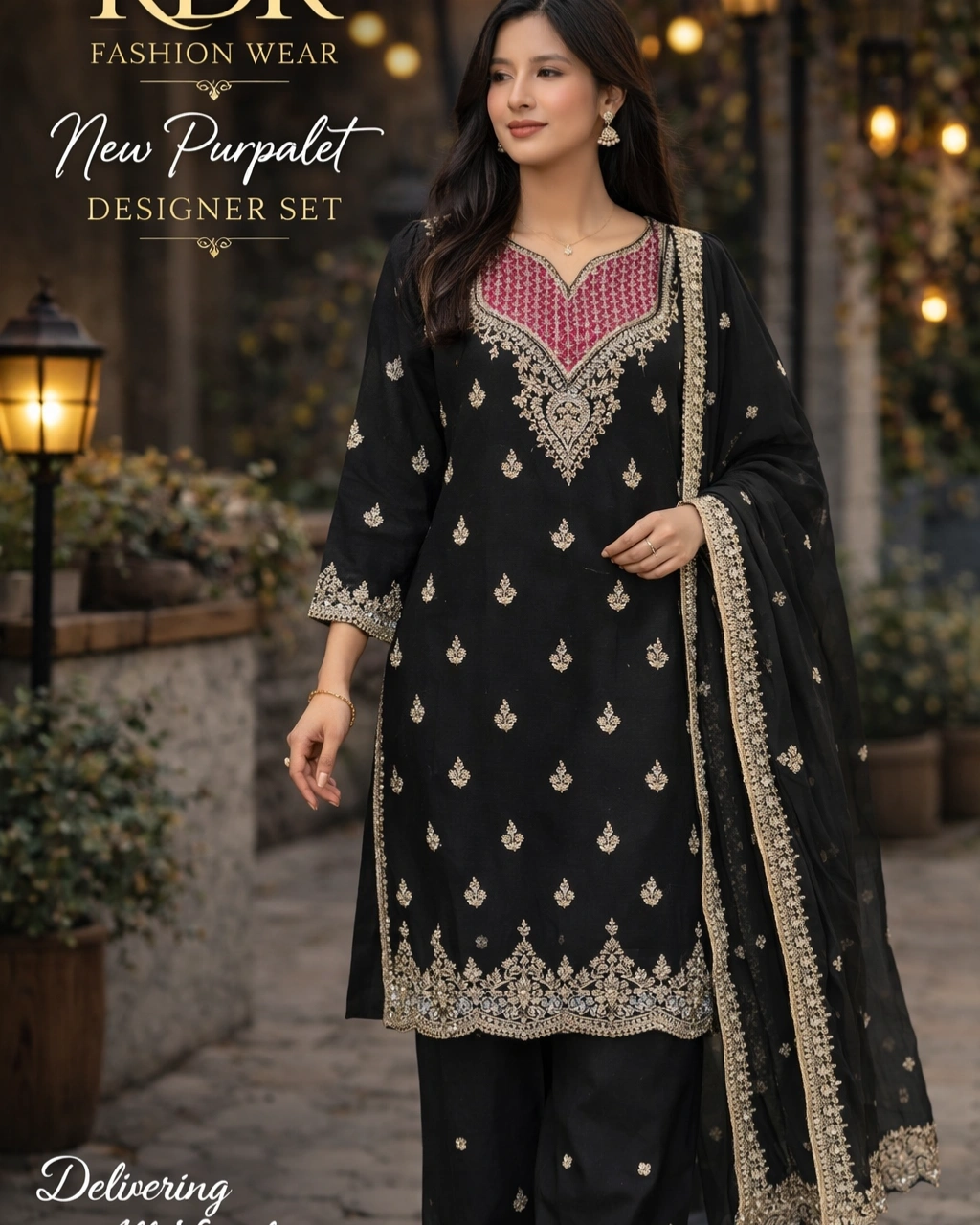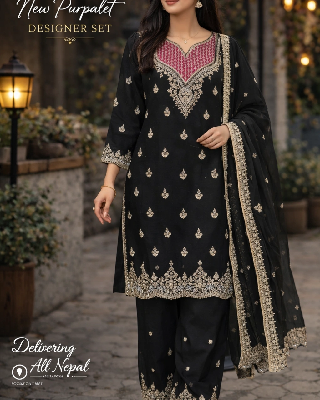 Product Name: Elegant Black Contrast Embroidered Designer Kurtha Set