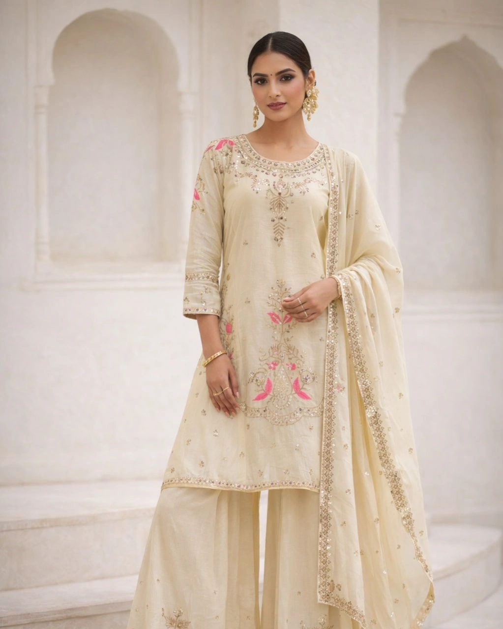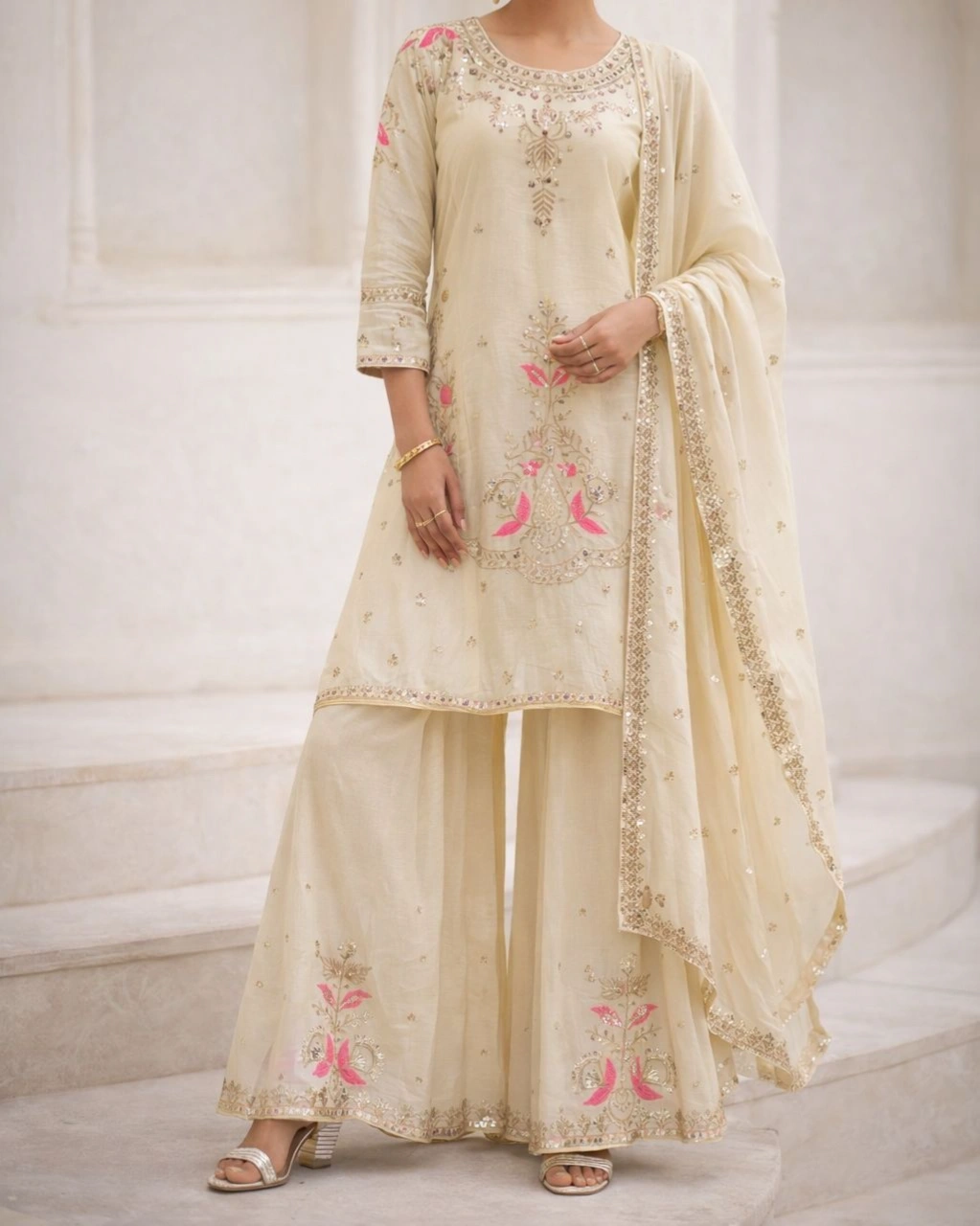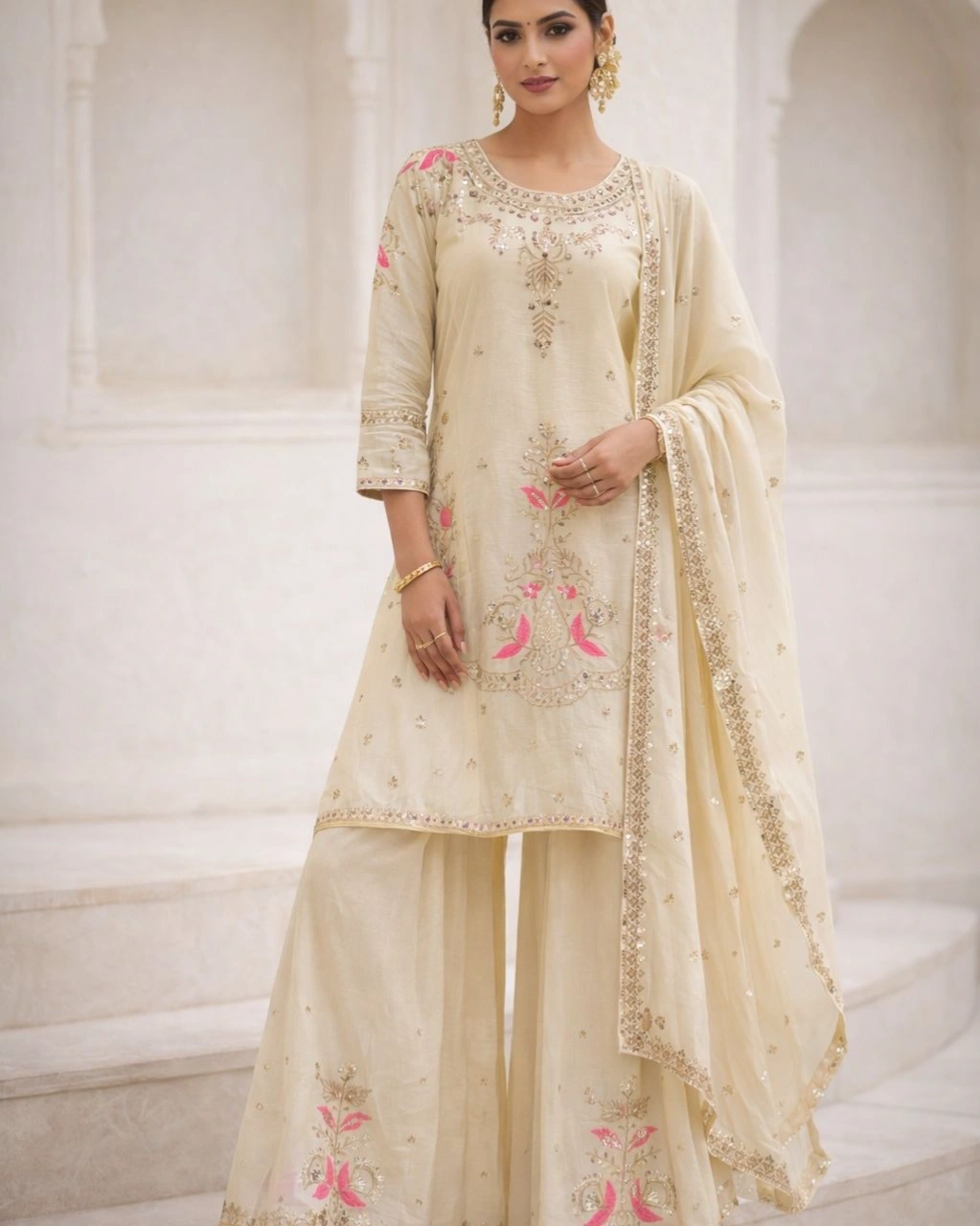 Product Name: Elegant Cream Embroidered Sharara Suit Set with Designer Dupatta