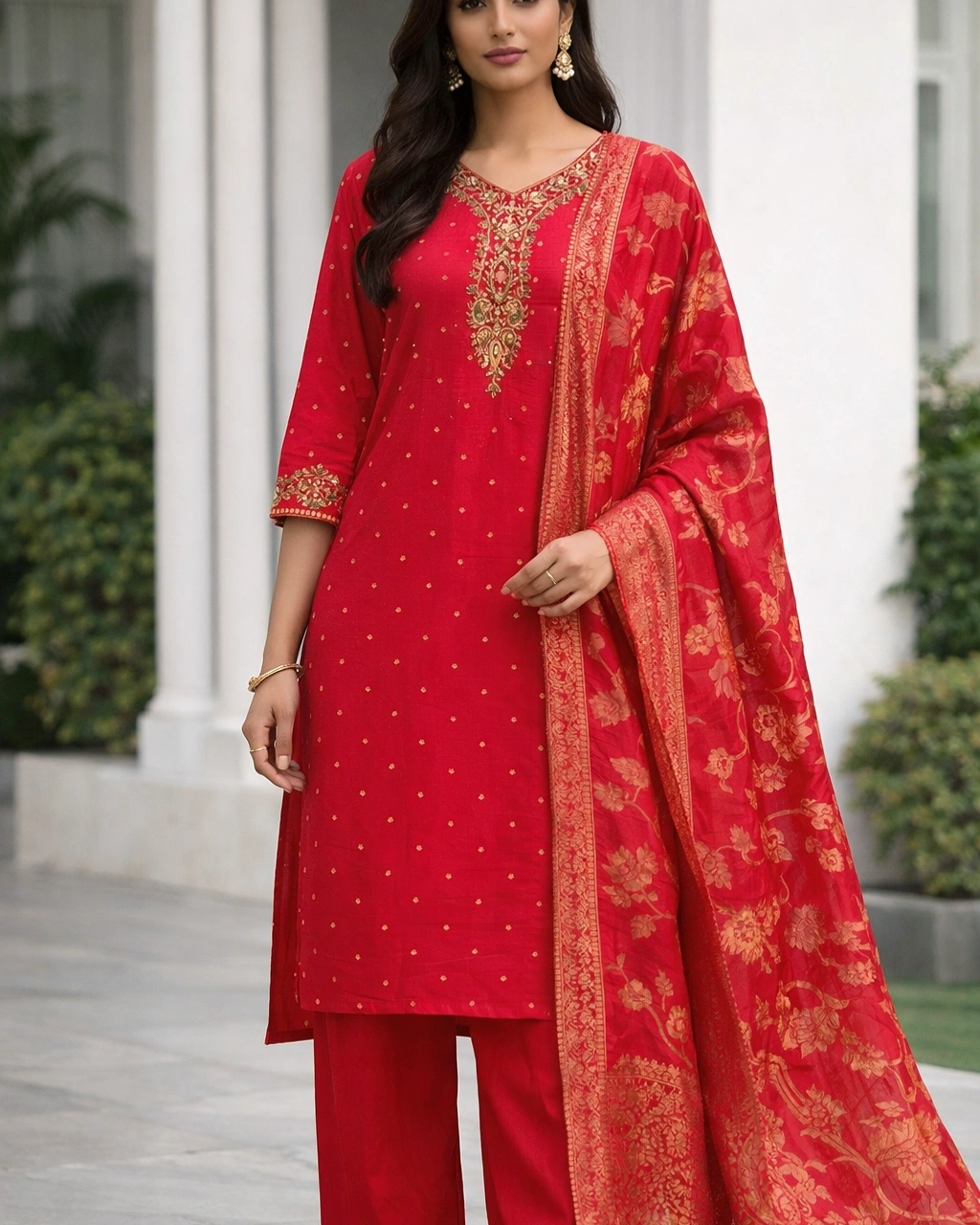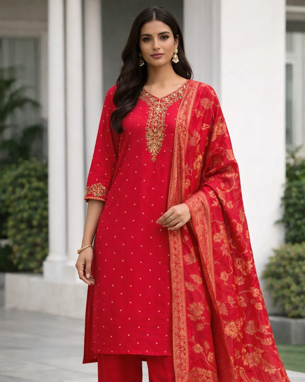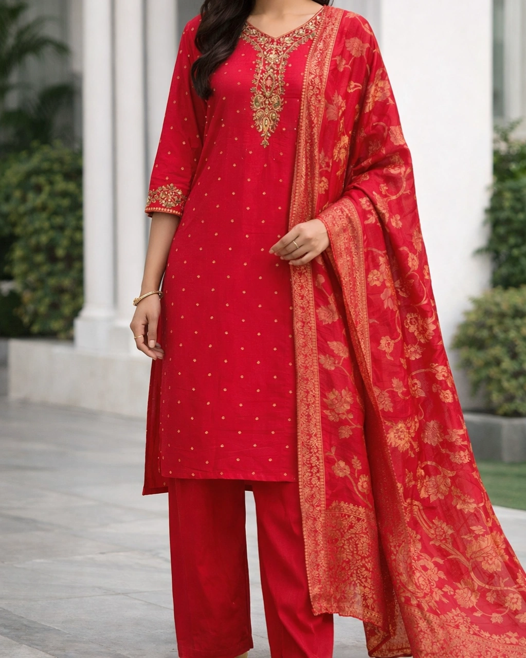 Style: Elegant ethnic outfit perfect for festive occasions, wedding functions, cultural celebrations, and special gatherings. The vibrant crimson tone combined with luxurious golden detailing creates a classic and royal traditional appearance.