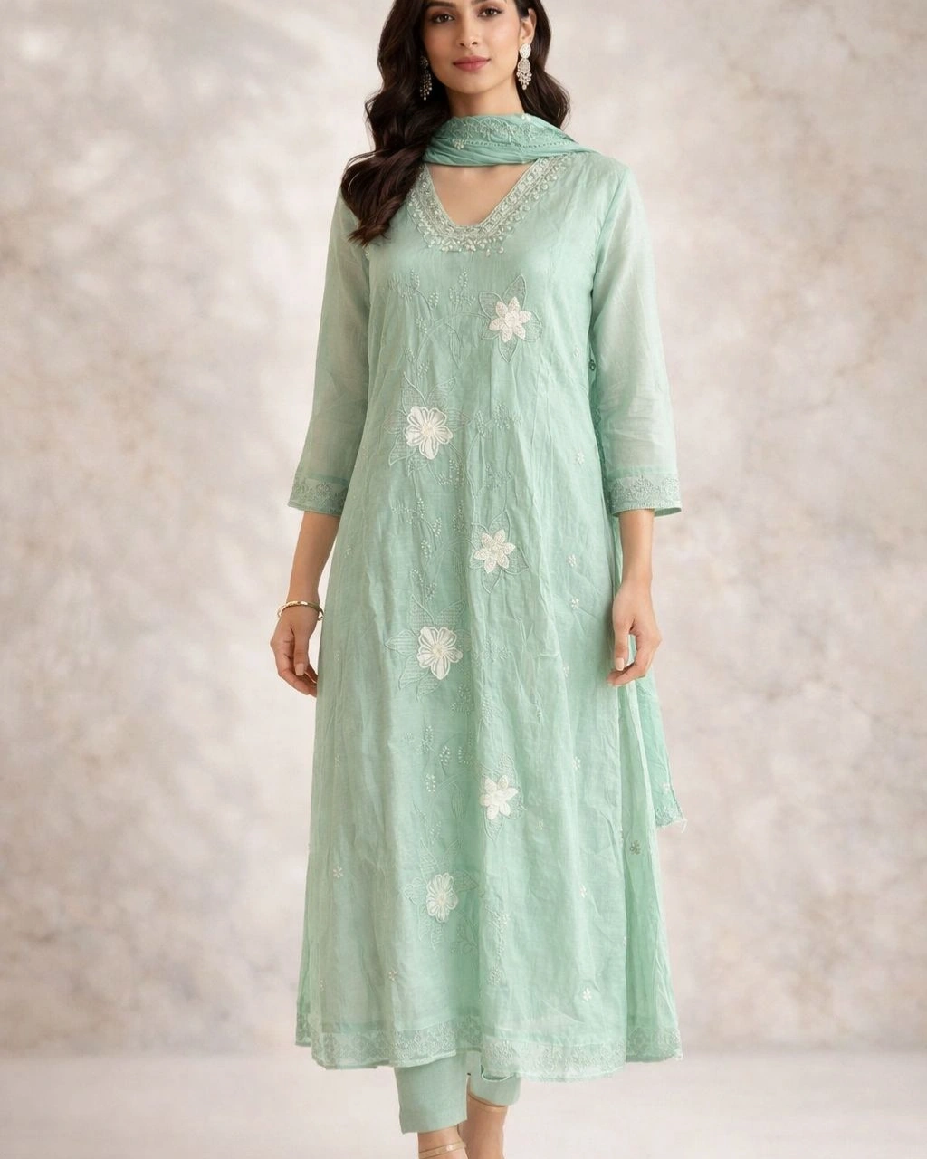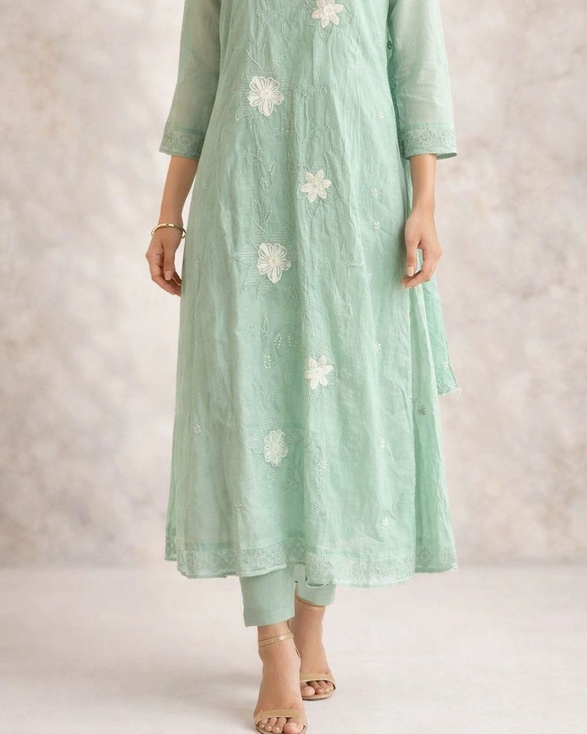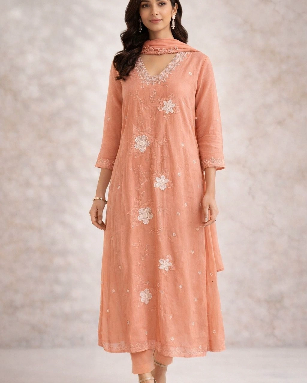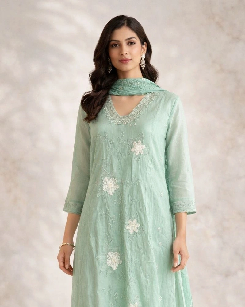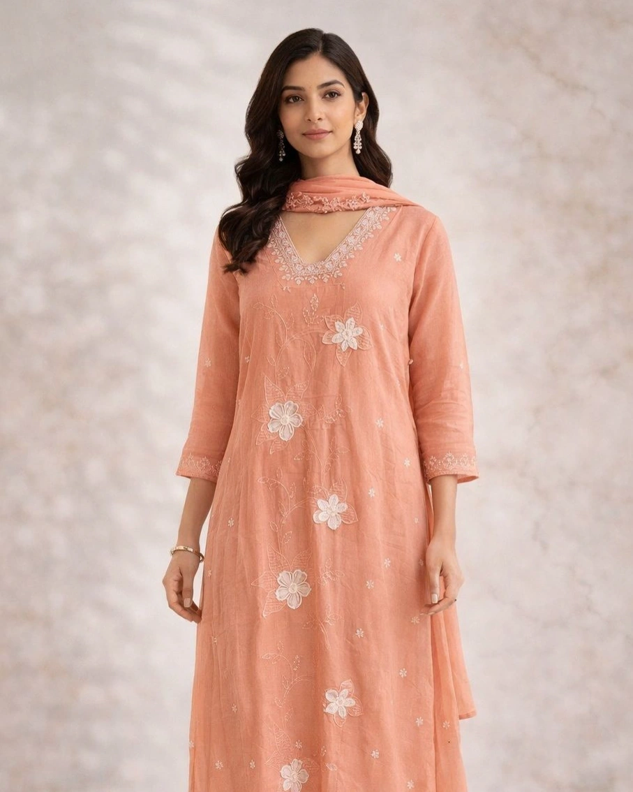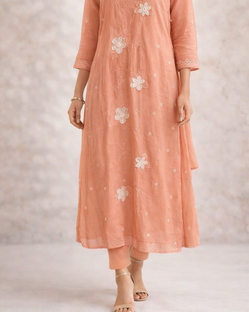 The kurta features delicate floral embroidery across the front, paired with a finely detailed V-neckline that adds a touch of elegance. Its flowy silhouette enhances your overall look while keeping it light and effortless.