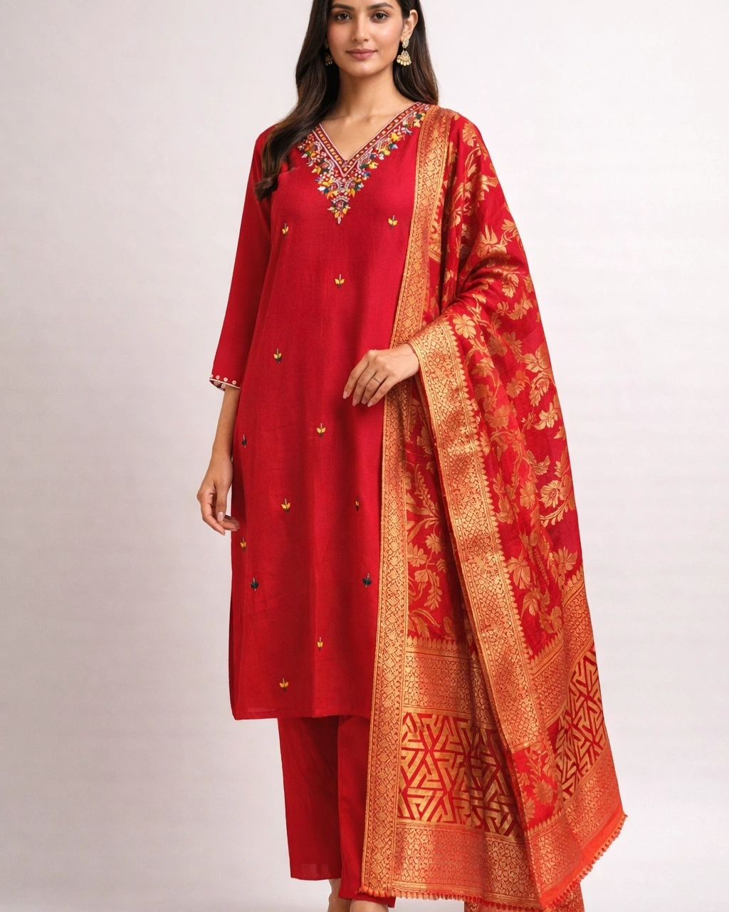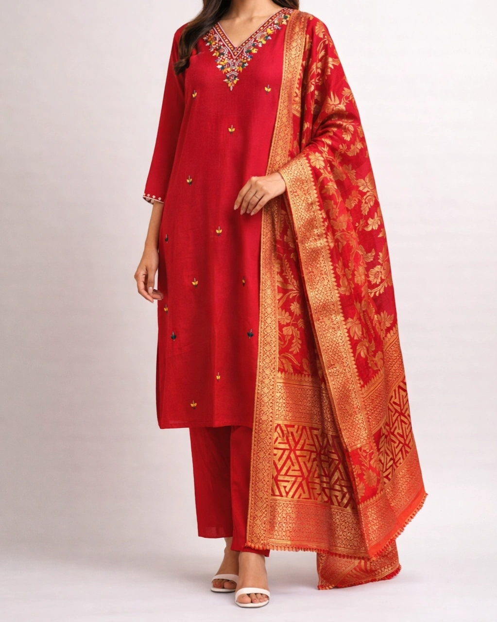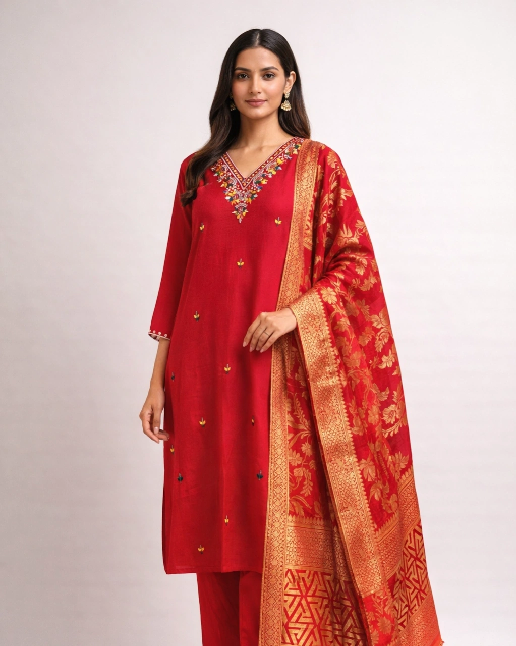 Work: Beautiful multicolor embroidery on the neckline with delicate small motifs across the kurta, adding a refined traditional touch. The outfit is paired with a luxurious jacquard dupatta featuring intricate golden floral and geometric patterns with rich borders, enhancing the festive elegance of the set.