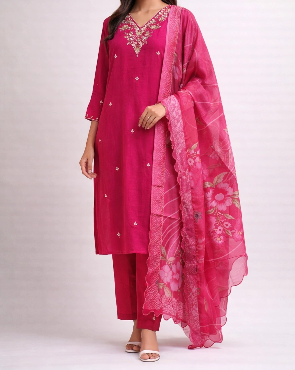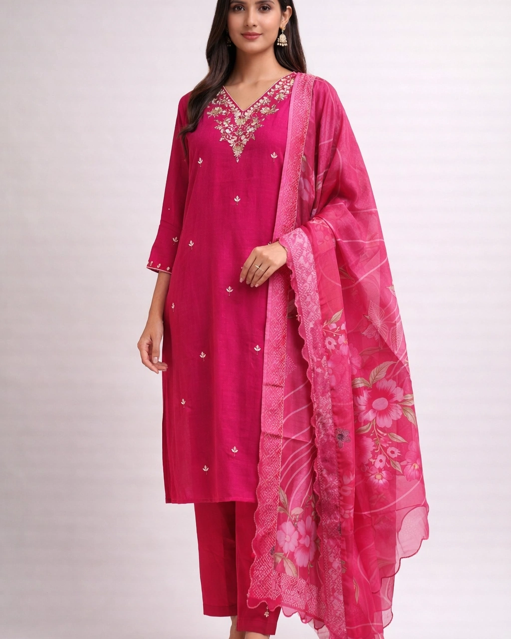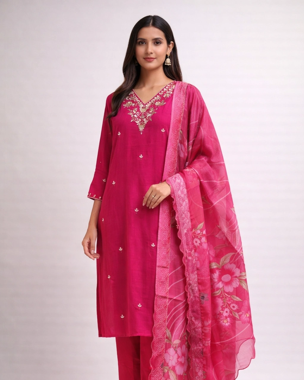 Style: Elegant ethnic outfit perfect for festive occasions, celebrations, cultural gatherings, and special daytime events. The rich fuchsia pink shade combined with subtle embroidery and floral dupatta creates a fresh and sophisticated traditional look.