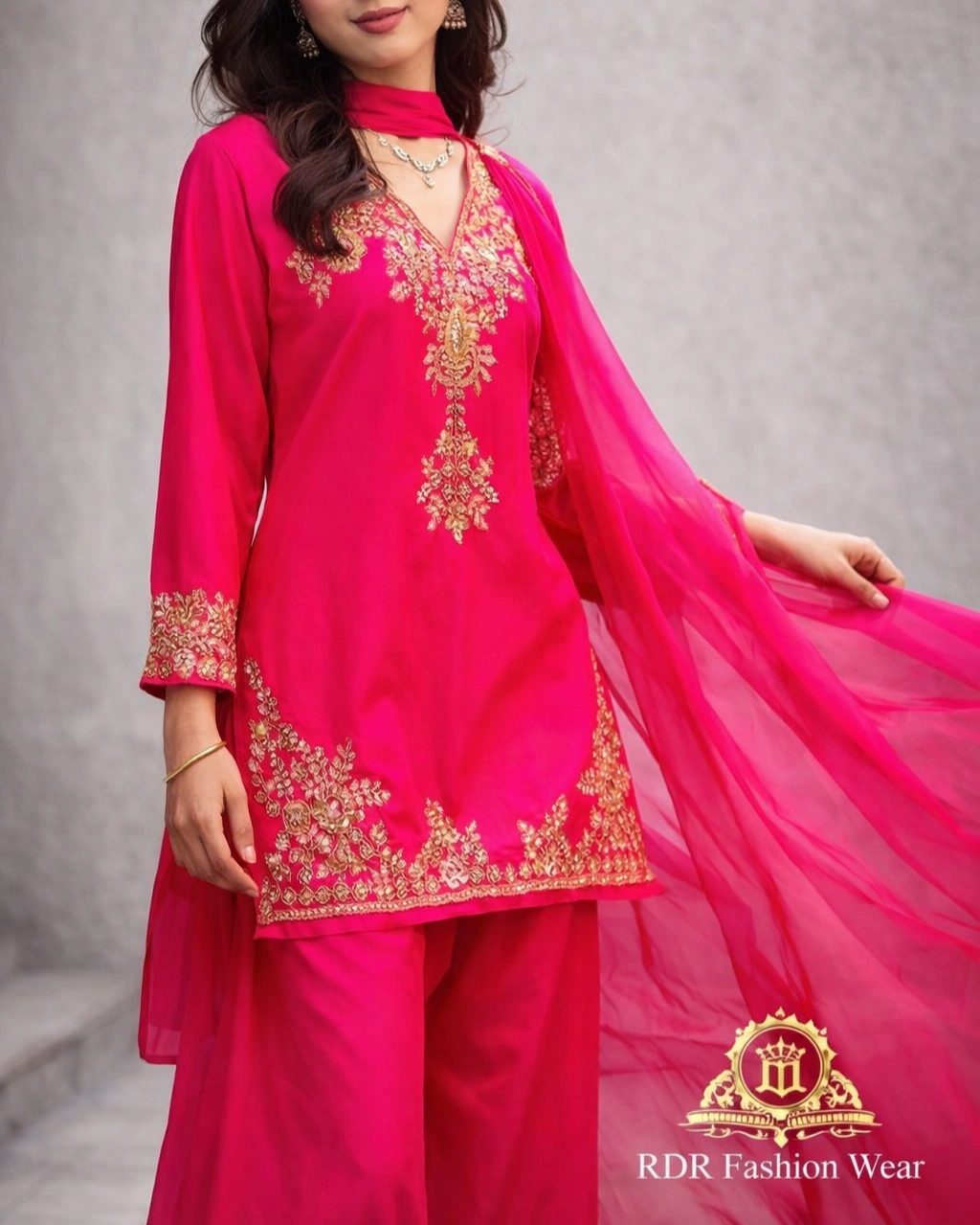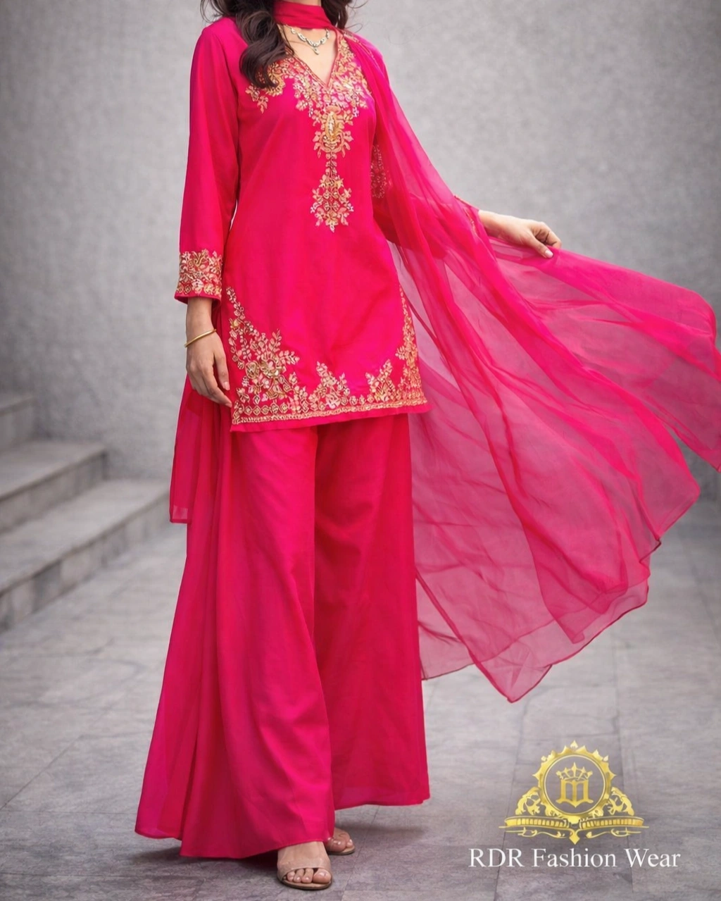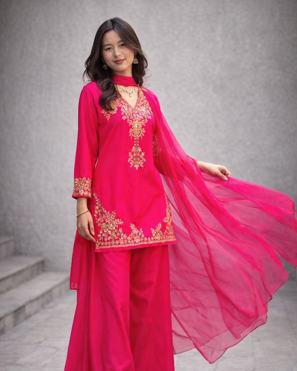 Product Name: Elegant Hot Pink Embroidered Kurta Palazzo Set with Dupatta
