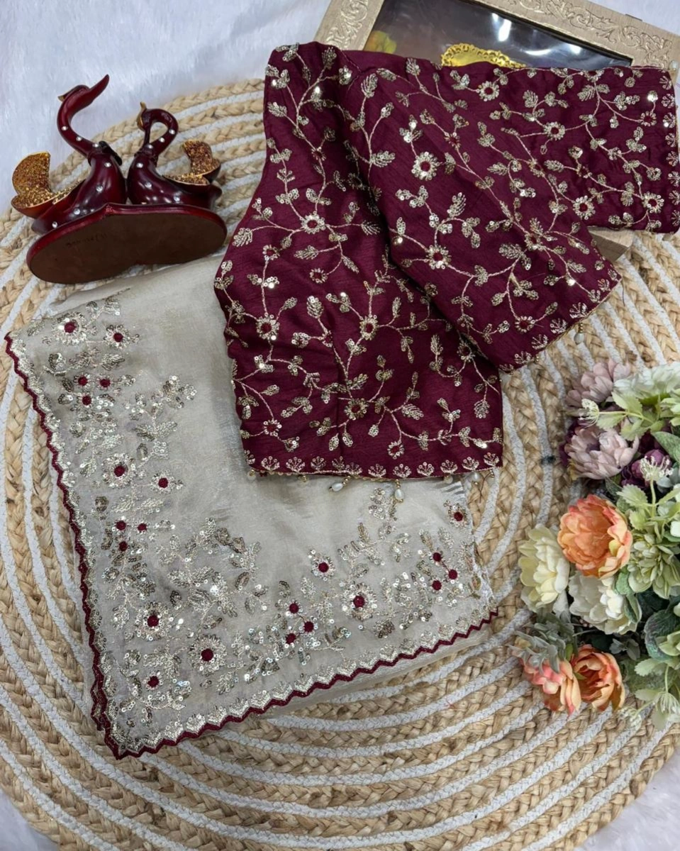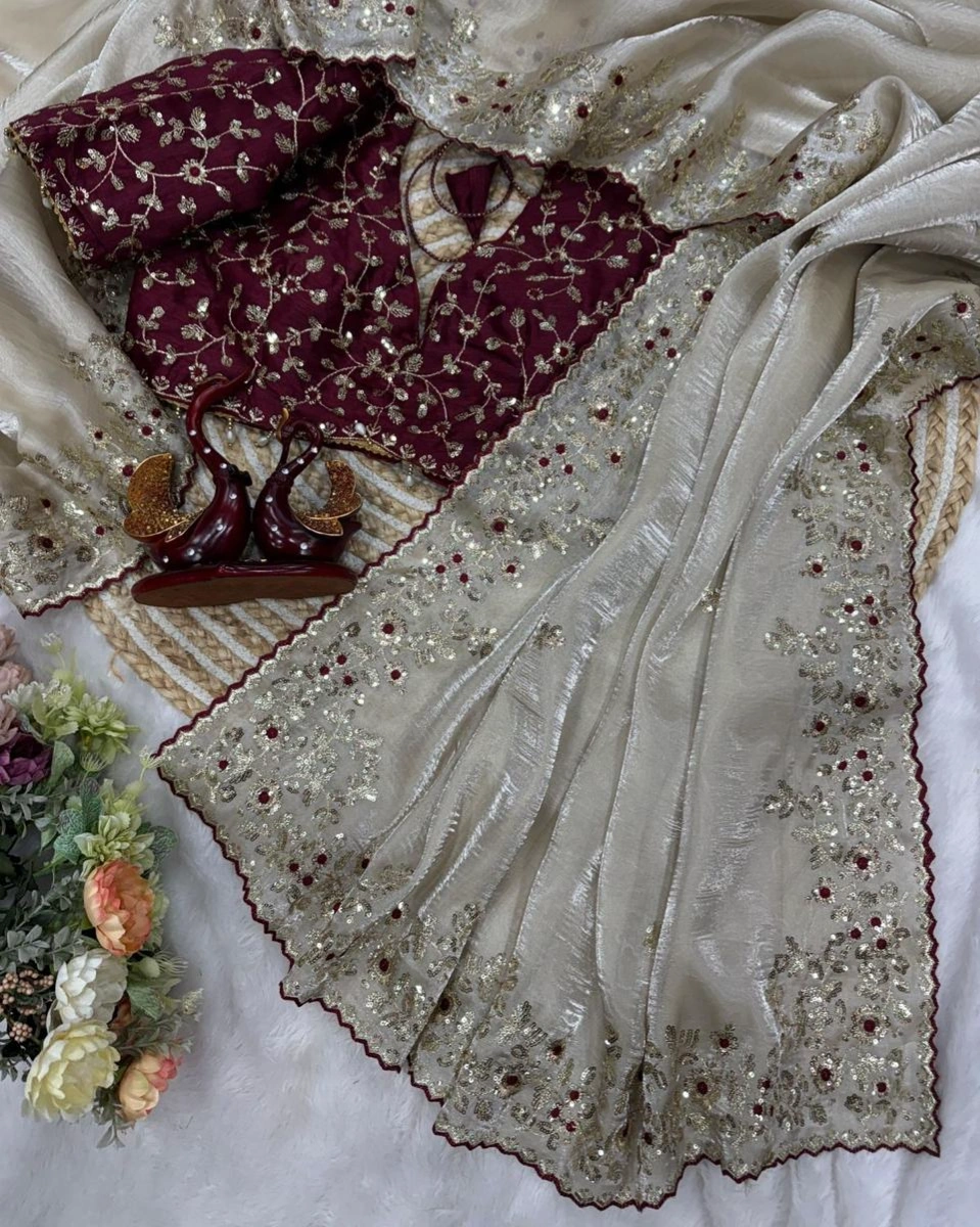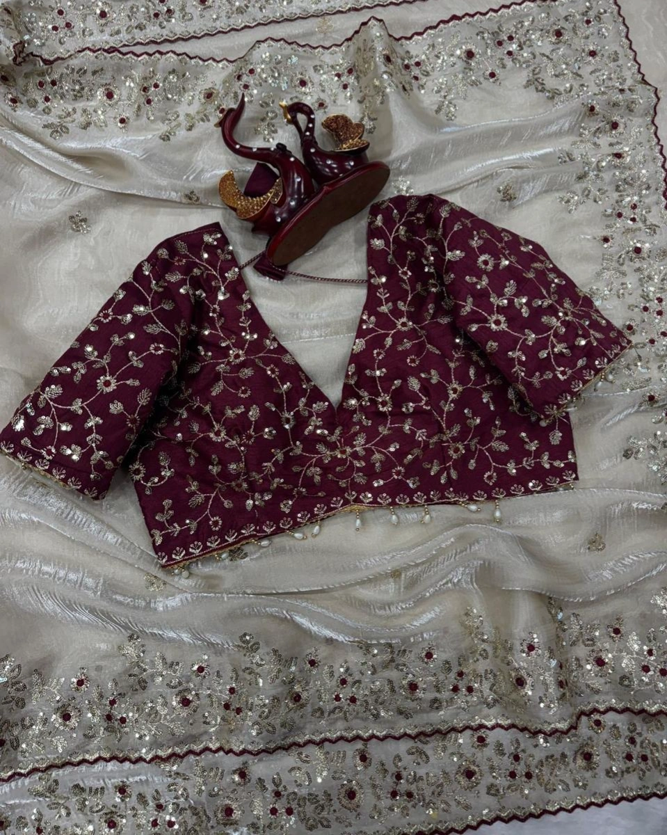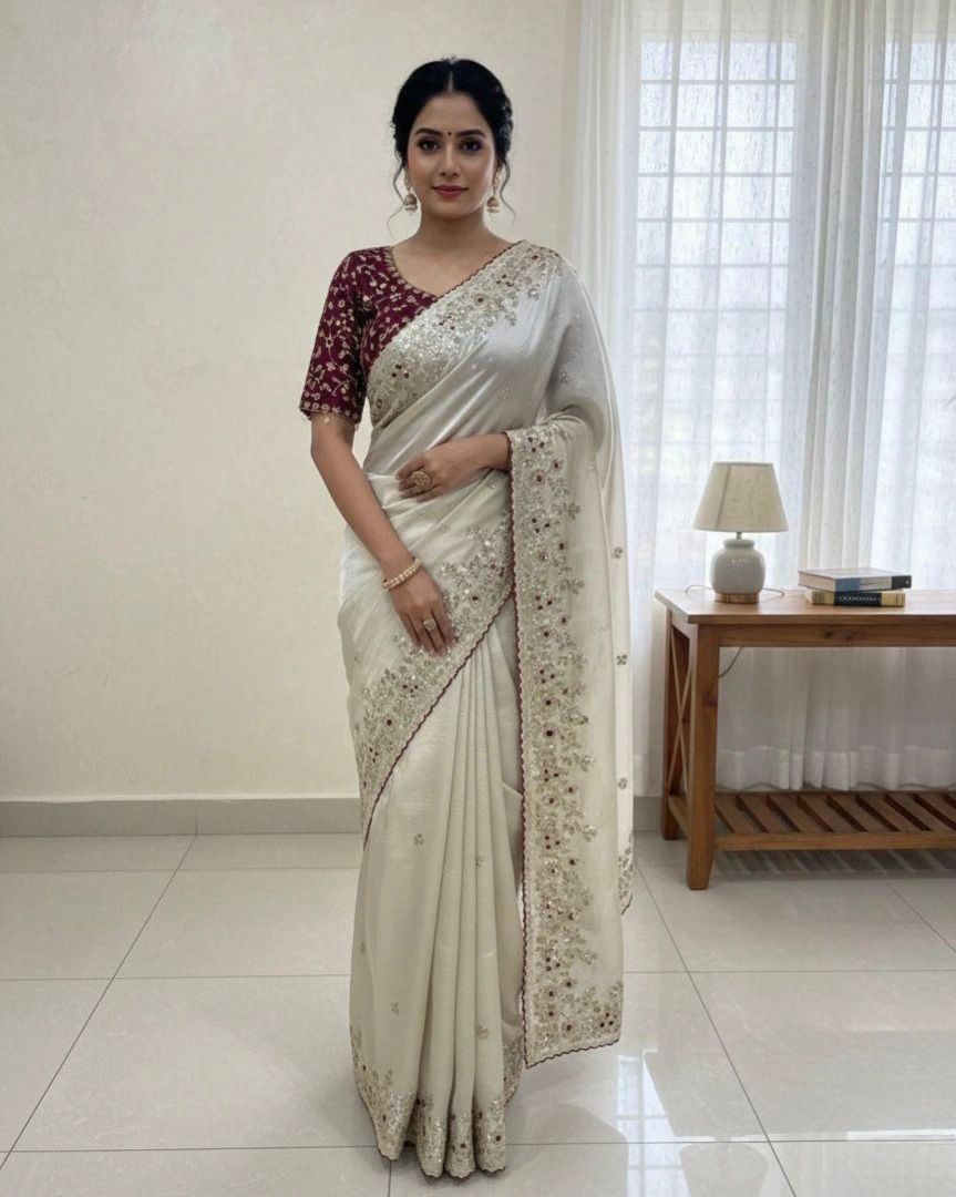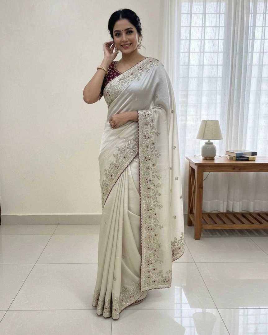 Product Name: Elegant Ivory Embroidered Ready-Made Saree with Designer Blouse