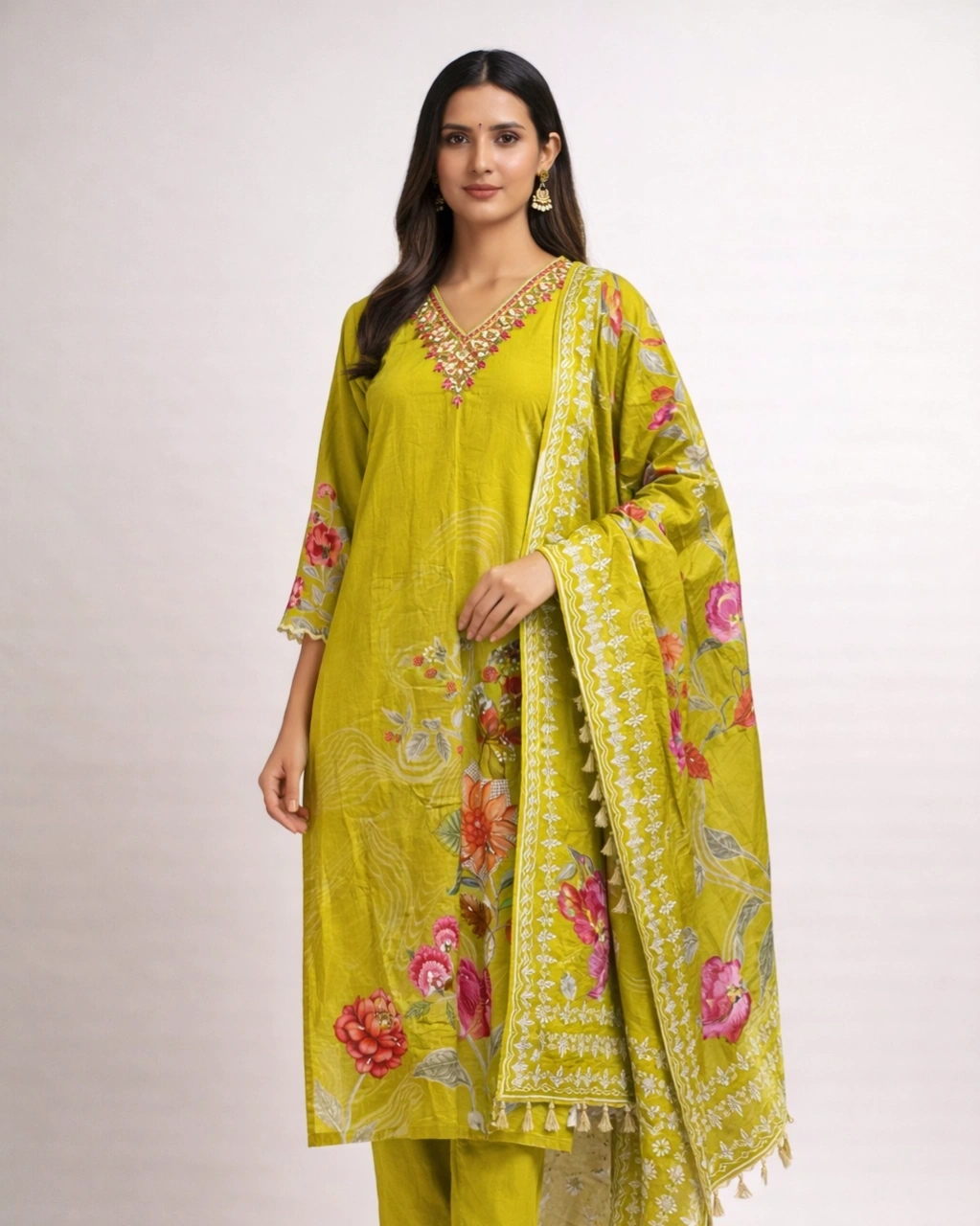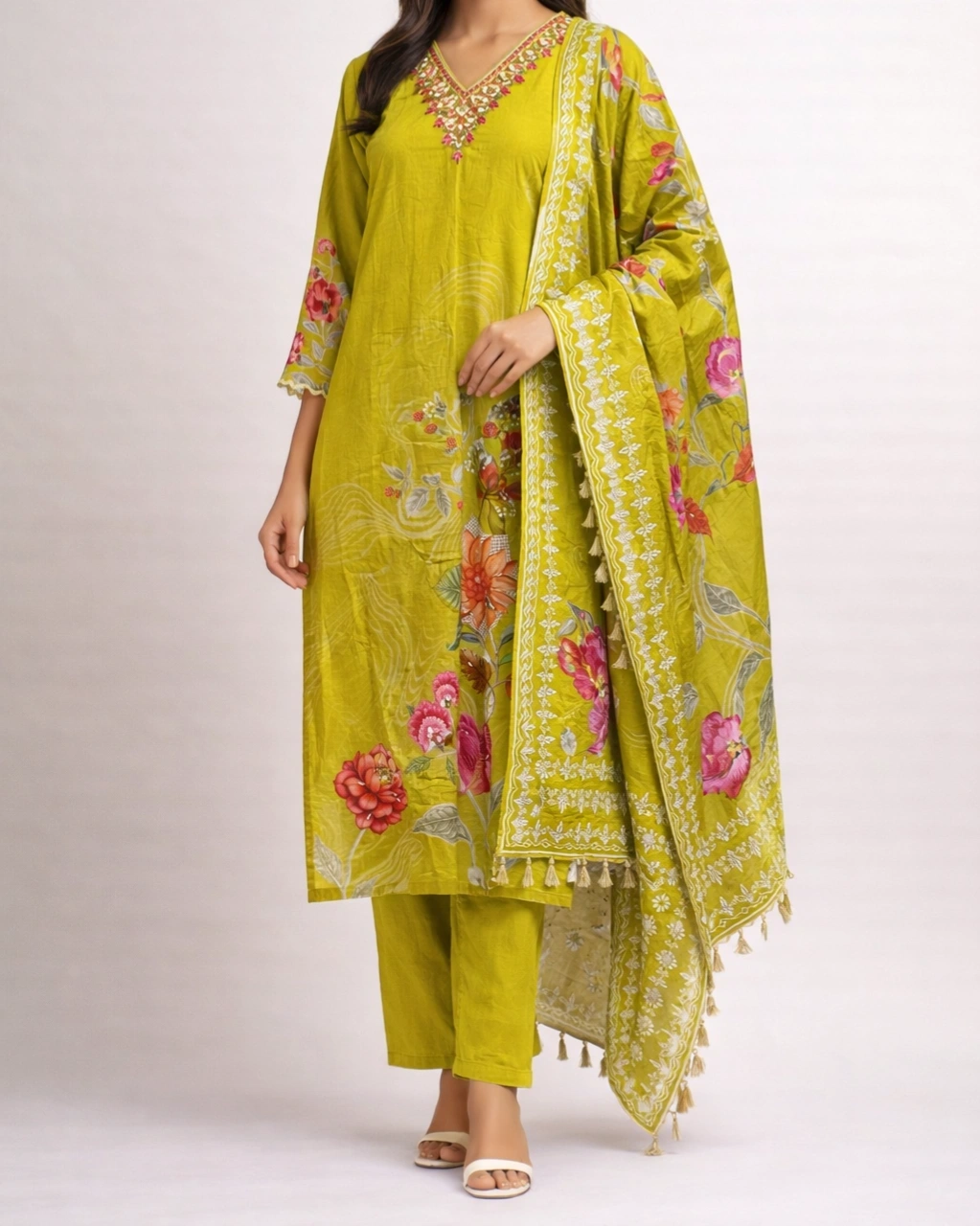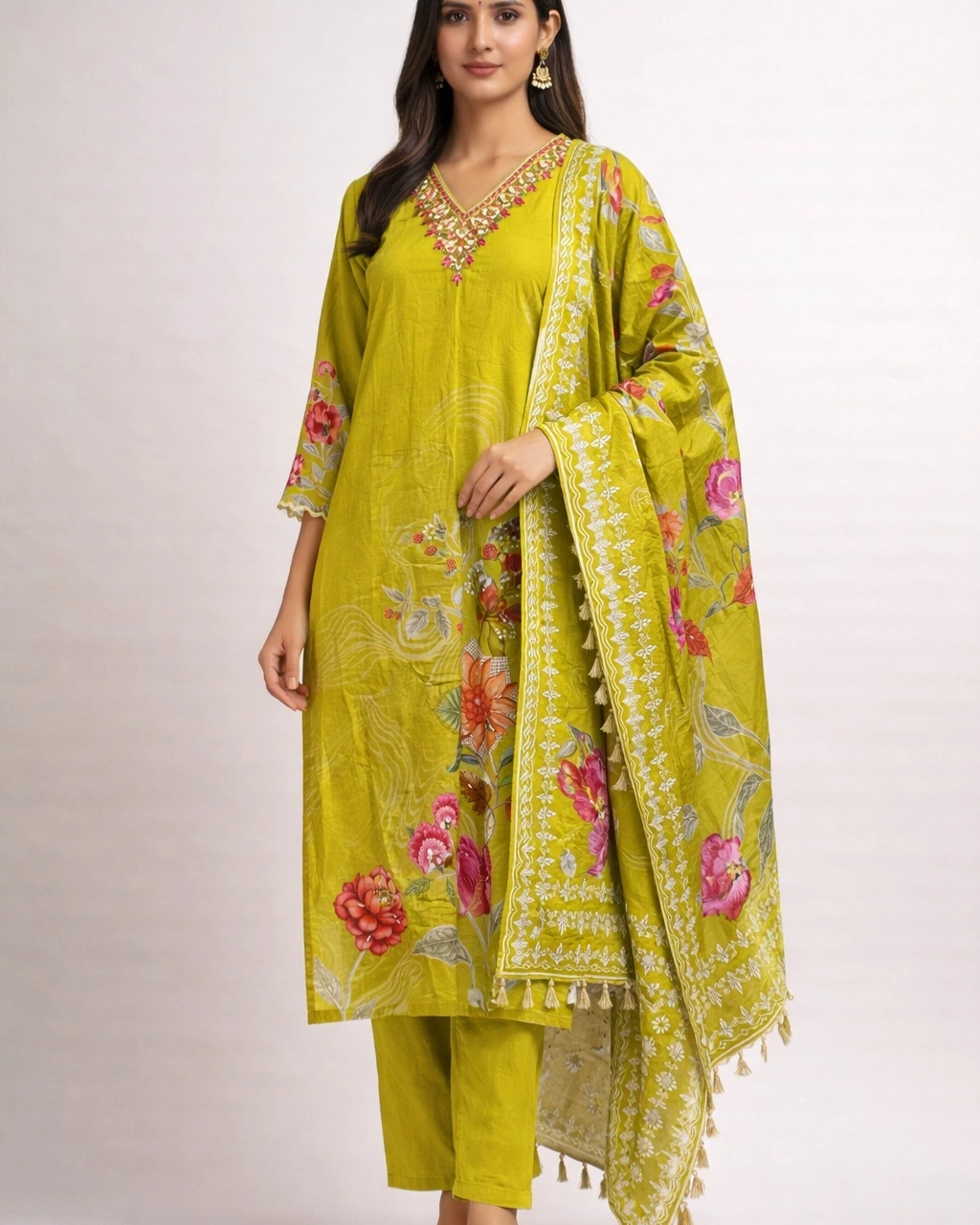 Work: Beautiful floral printed artwork across the kurta with delicate multicolor embroidery on the neckline that adds a graceful traditional touch. The outfit is paired with a stylish printed dupatta featuring floral motifs, elegant borders, and tassel detailing that enhances the overall ethnic charm.