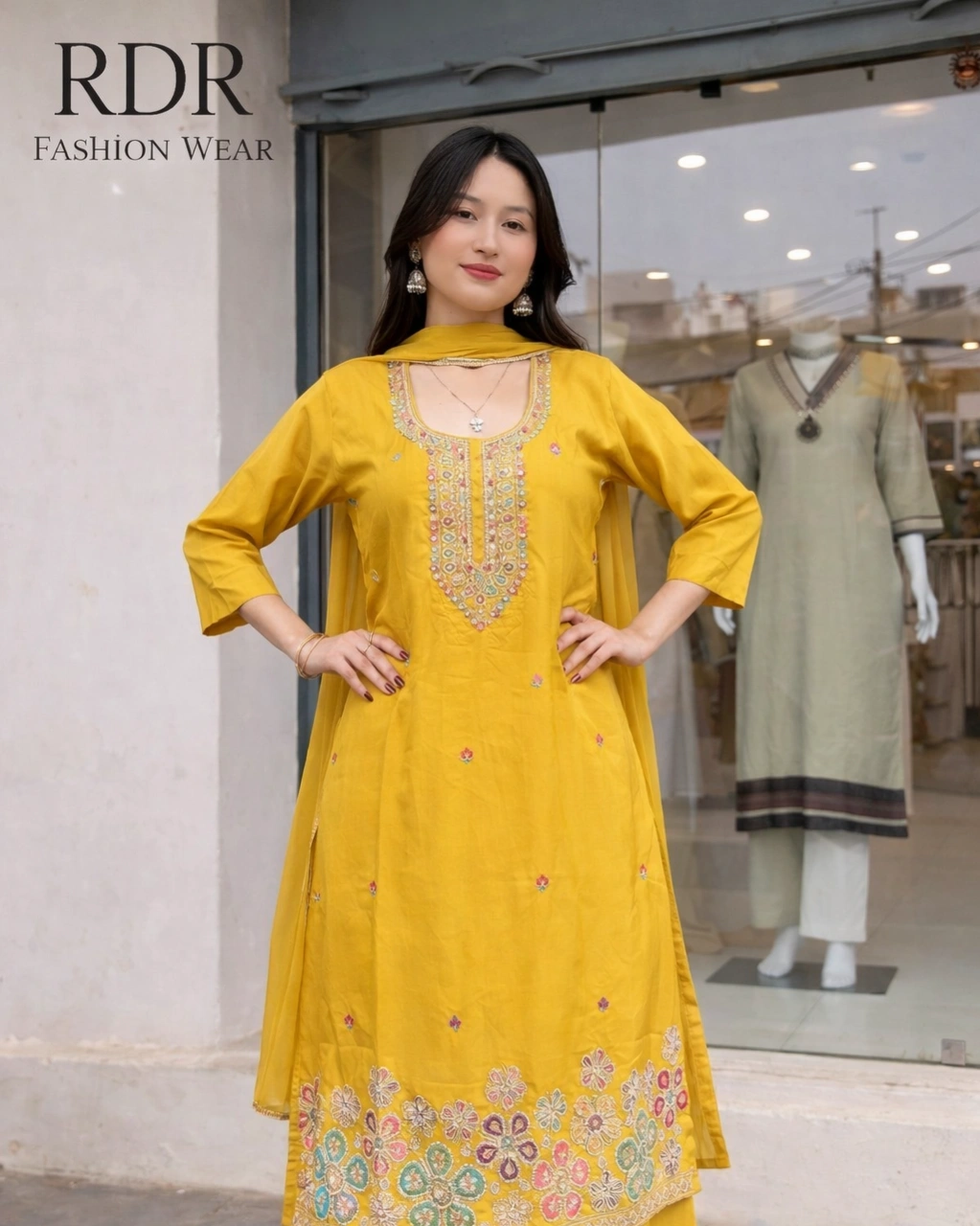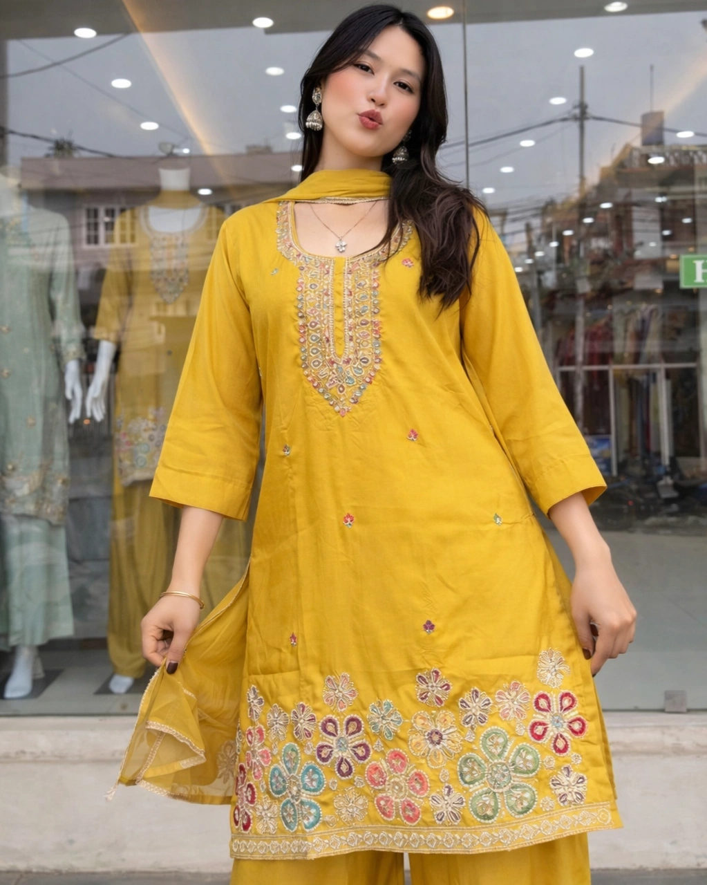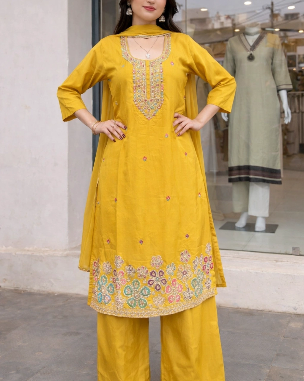 Product Name: Elegant Mustard Embroidered Kurtha Palazzo Set