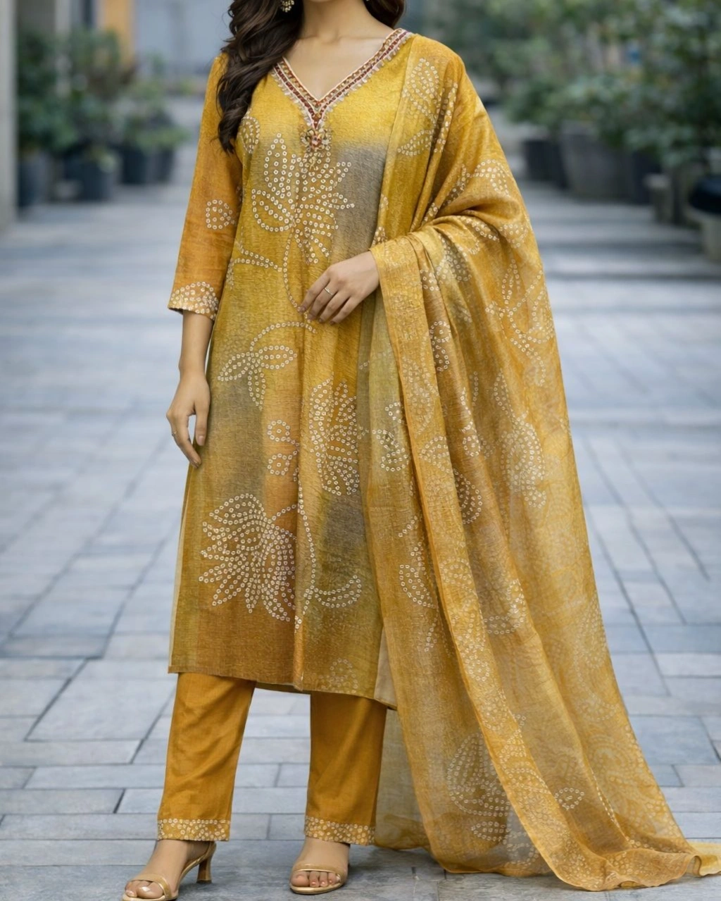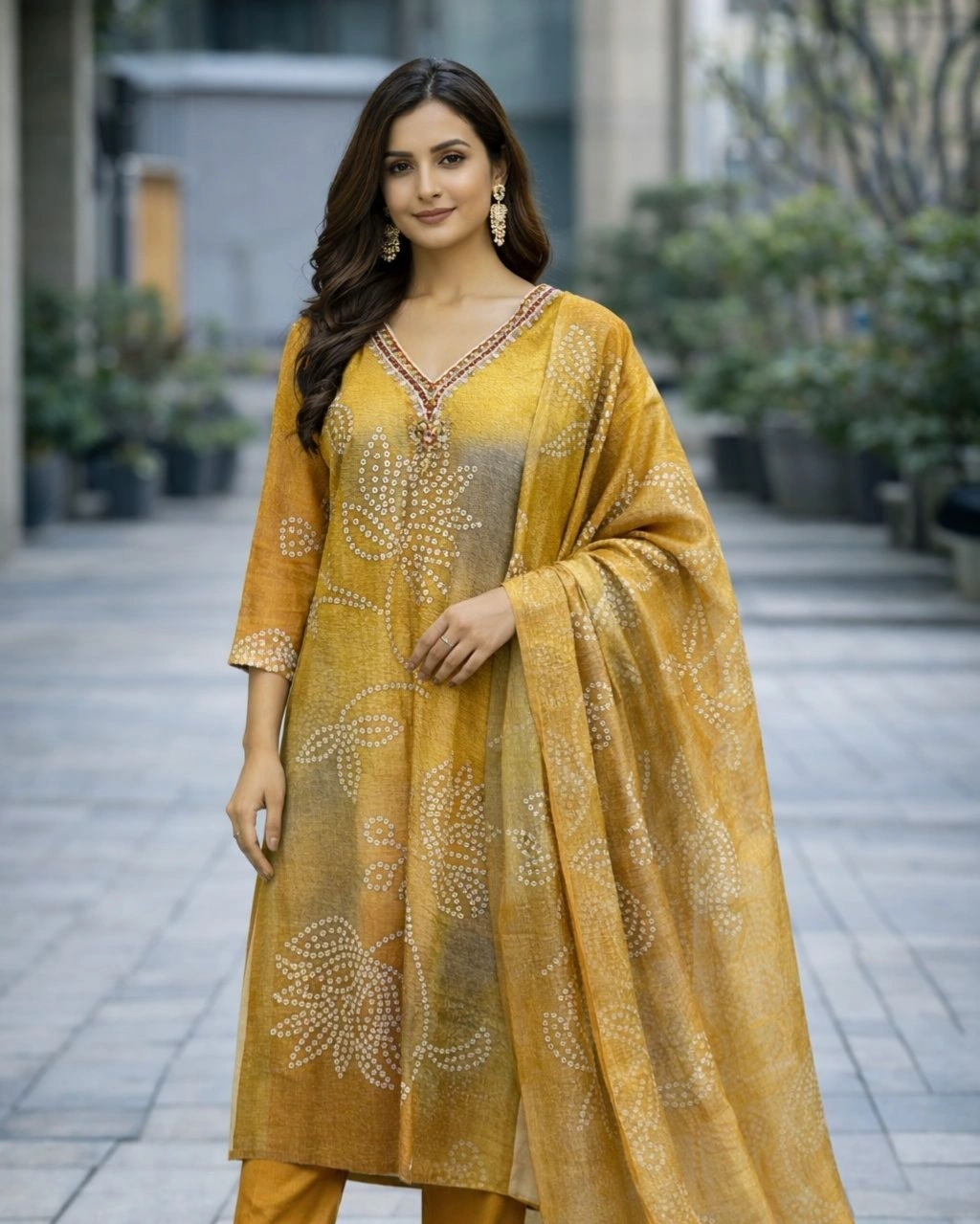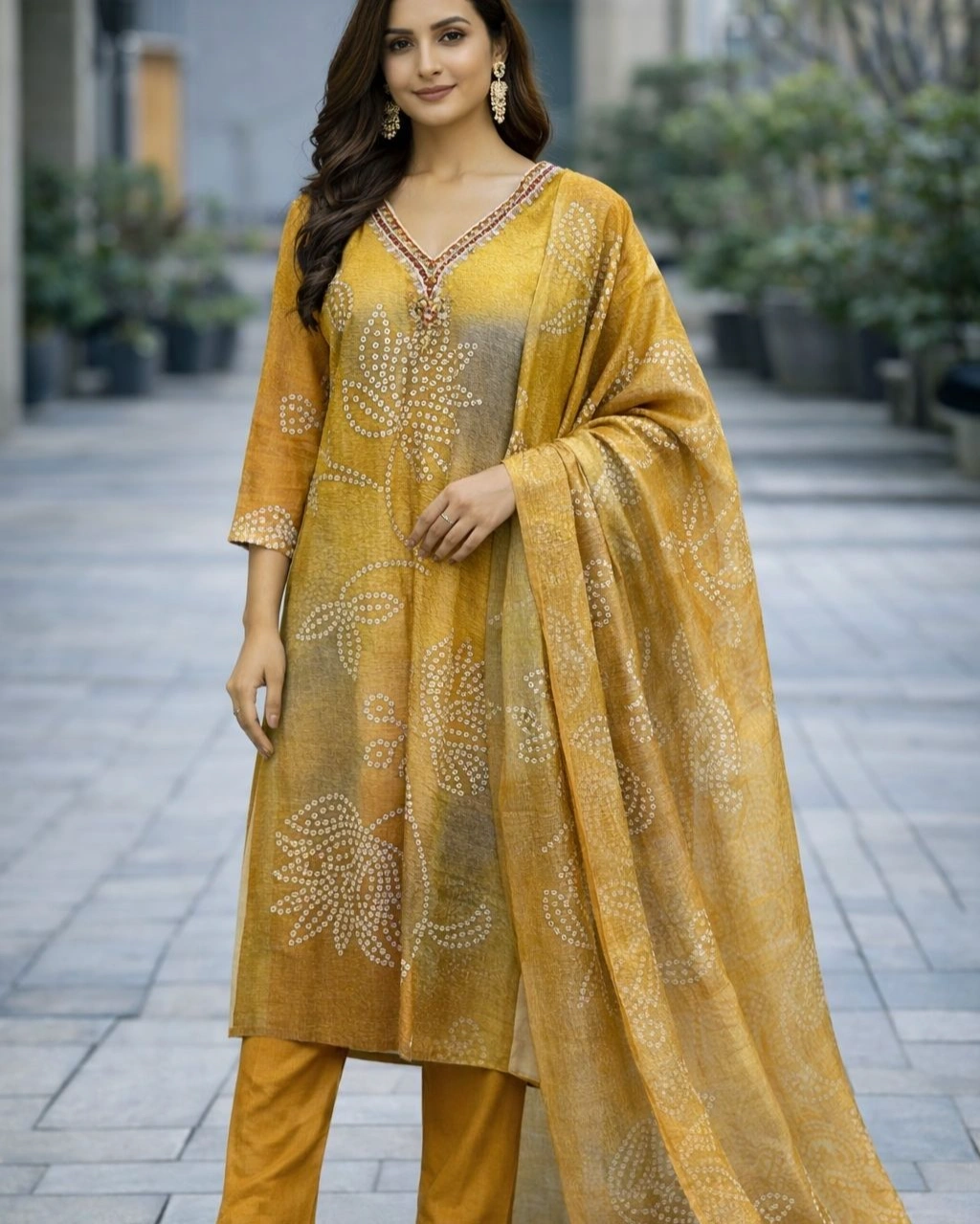 Product Name: Elegant Mustard Printed Kurta Pant Set with Designer Dupatta