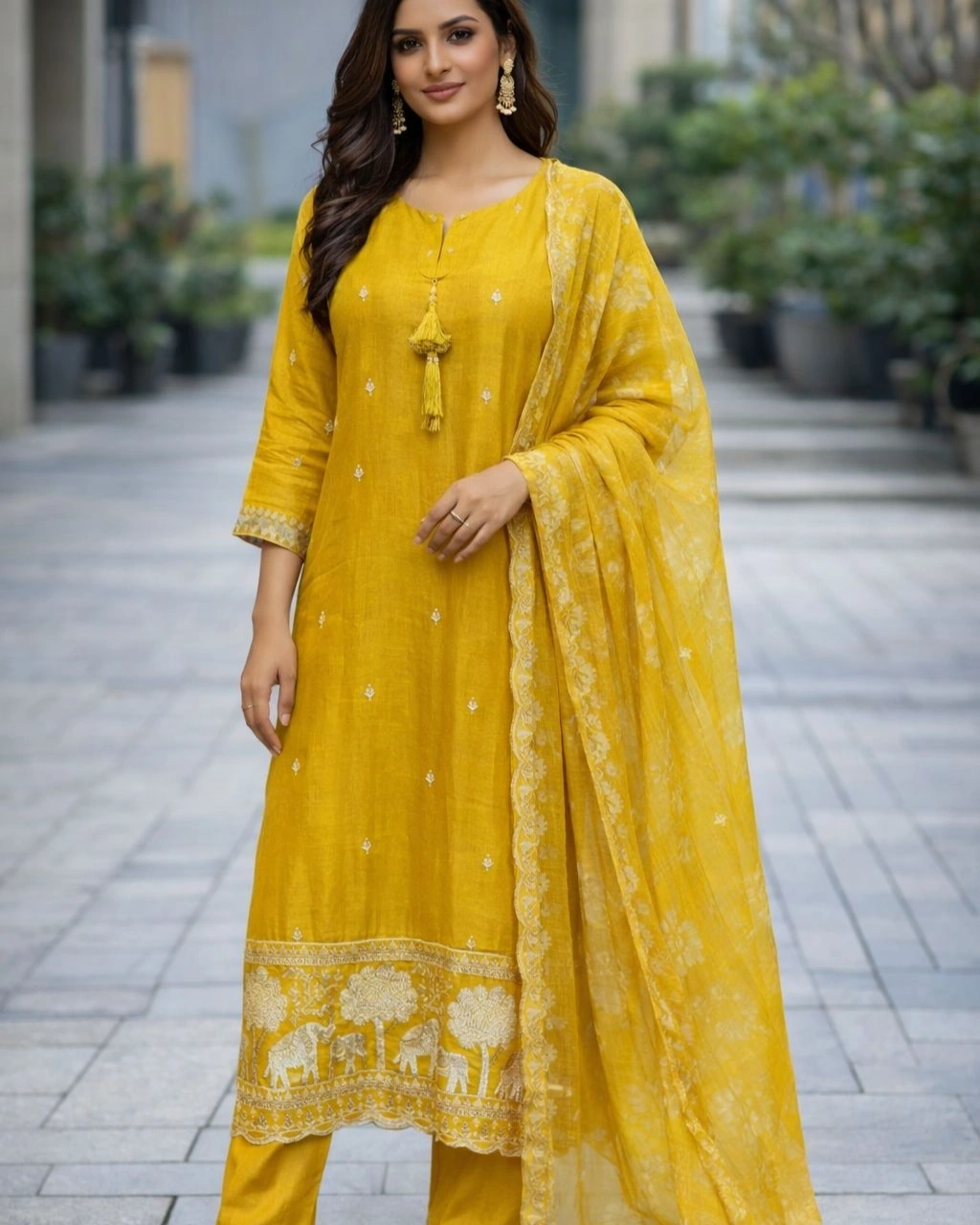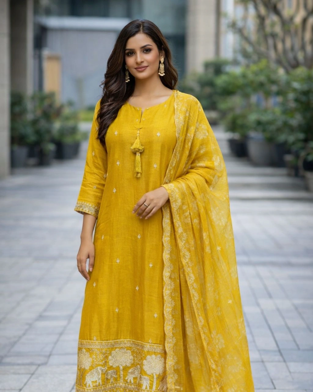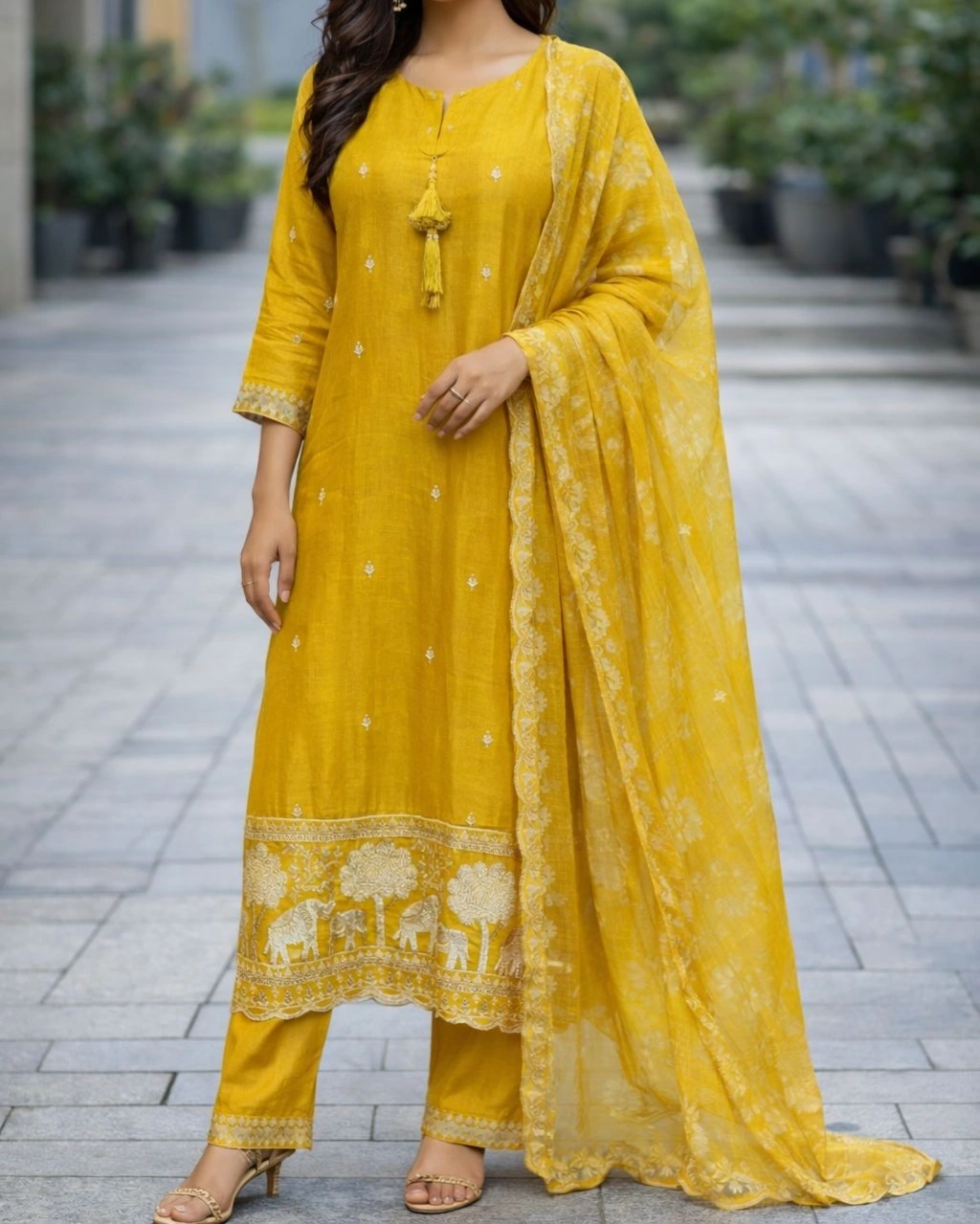 Product Name: Elegant Mustard Yellow Embroidered Kurta Pant Set with Designer Dupatta