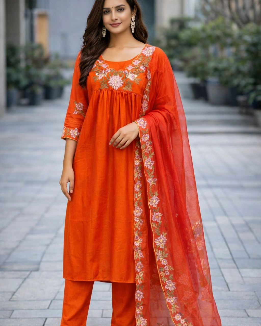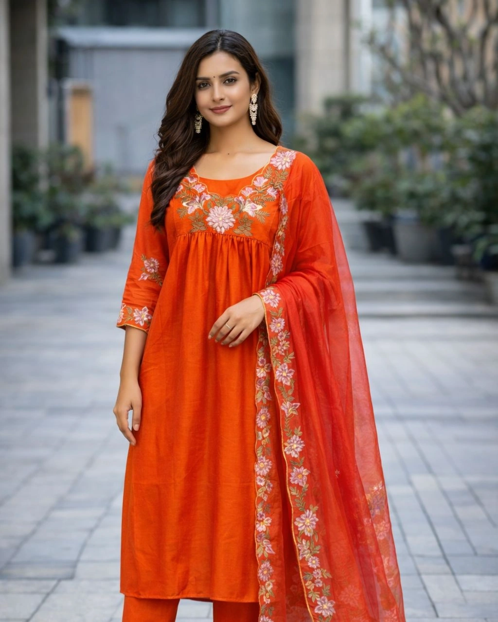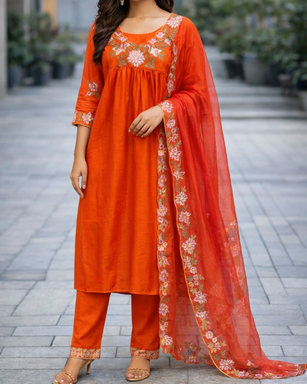 Product Name: Elegant Orange Floral Embroidered Kurta Pant Set with Designer Dupatta