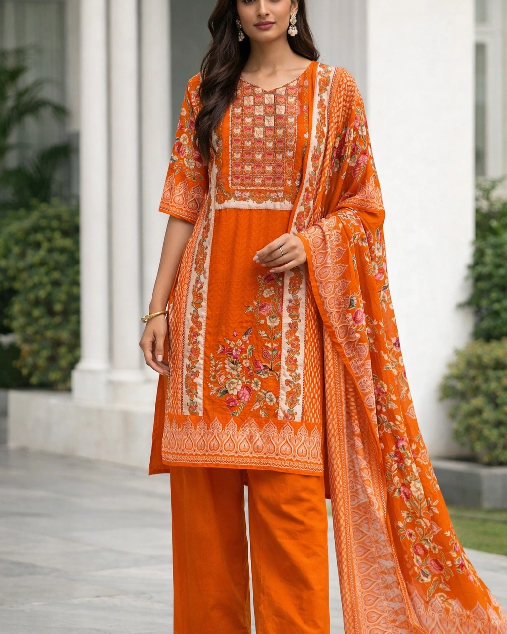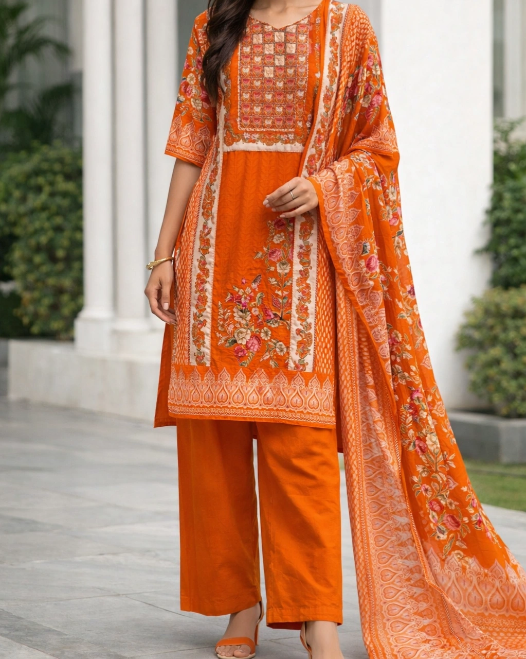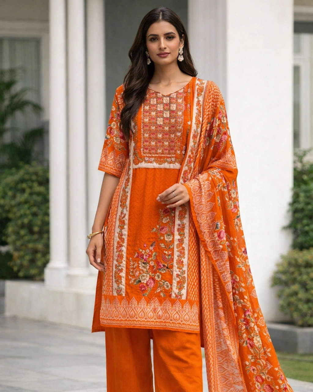 Style: Elegant ethnic outfit perfect for festive occasions, daytime celebrations, casual gatherings, and cultural events. The vibrant orange tone combined with floral prints creates a fresh and eye-catching traditional look.