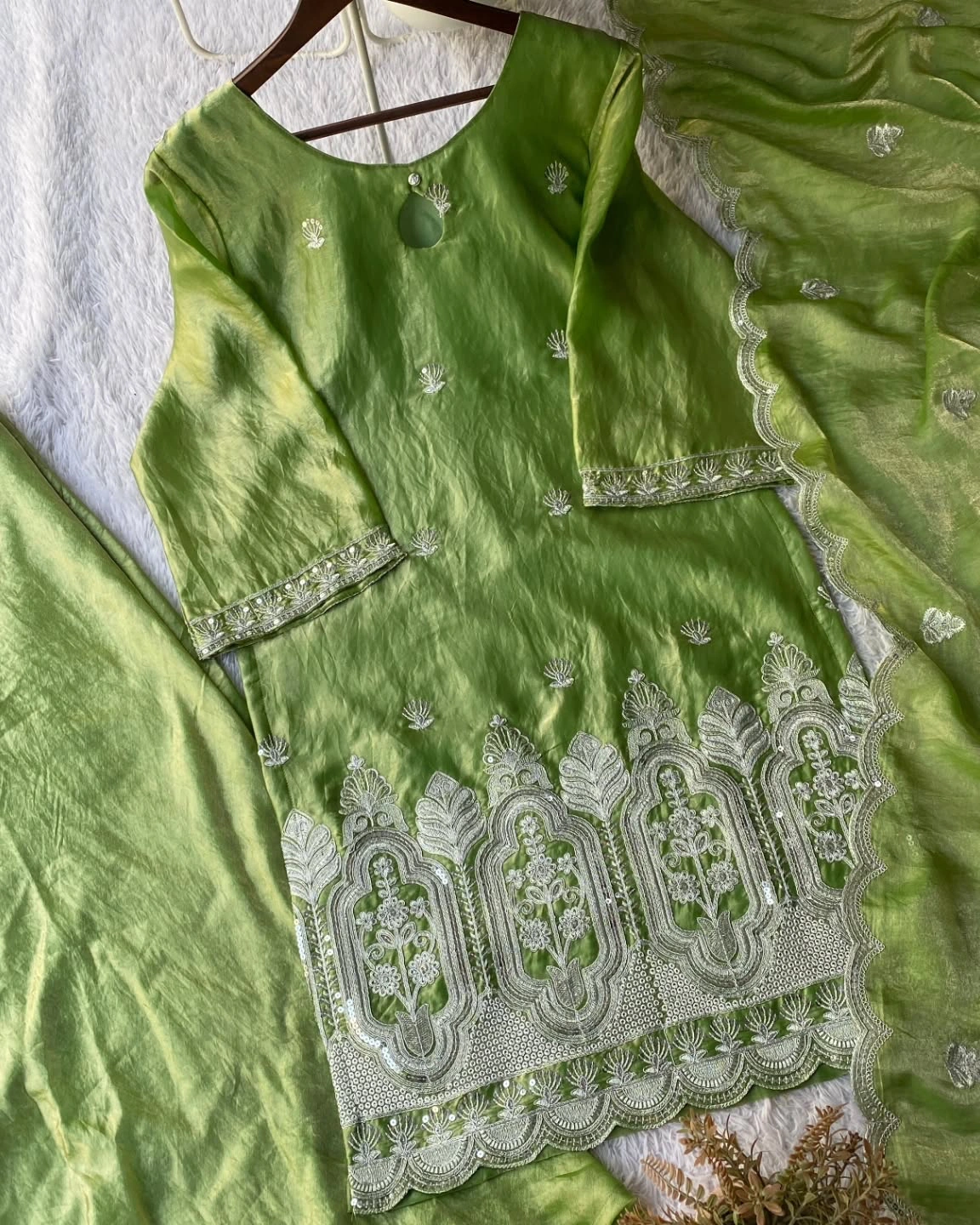 Elegant Parrot Green Embroidered Palazzo Set (3-Piece)๐งต Fabric: