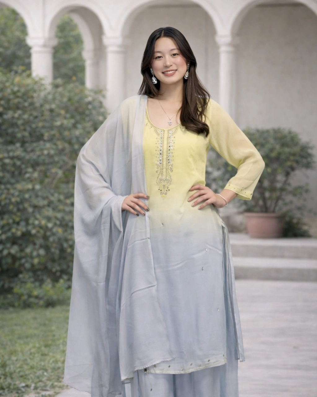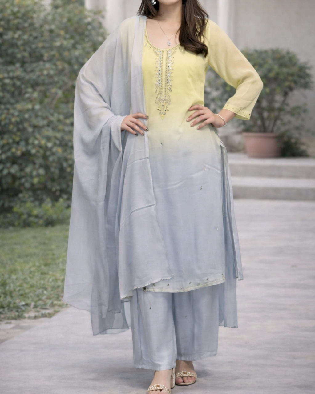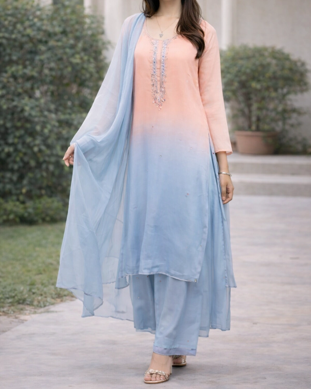 Work: Beautiful ombre color transition from soft peach to sky blue, creating a graceful and modern look. The neckline is enhanced with delicate embroidery and bead detailing, while the lightweight dupatta adds elegance with its soft flow and subtle embellishments.