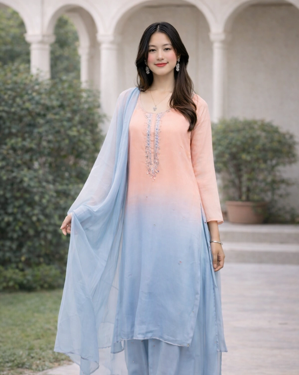 Product Name: Elegant Peach & Sky Blue Ombre Kurta Set with Dupatta