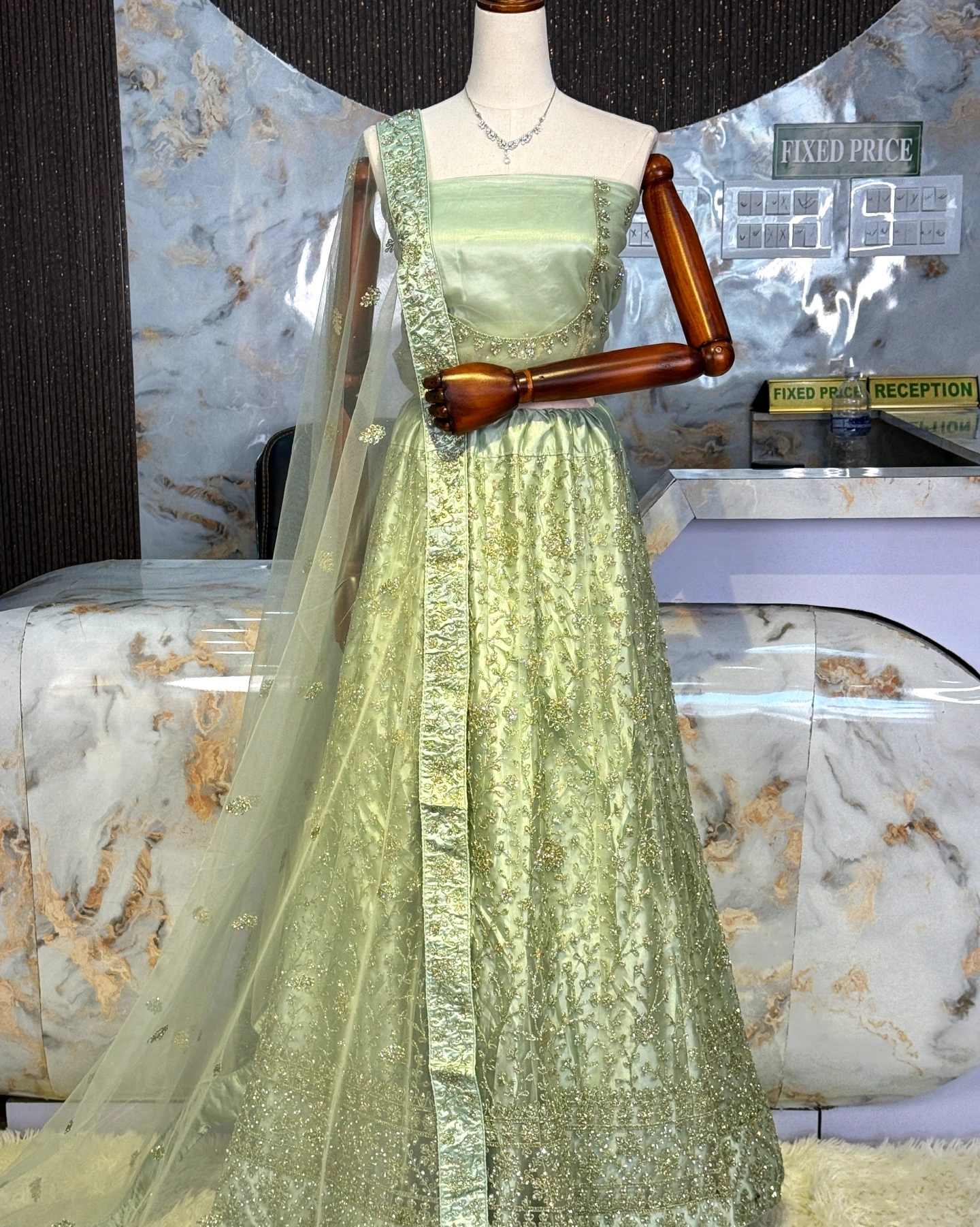 Elegant Pistachio Green Heavy Embroidered Lehenga Set