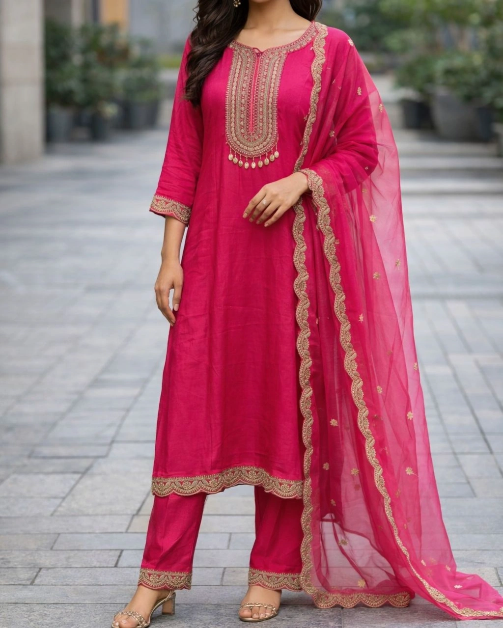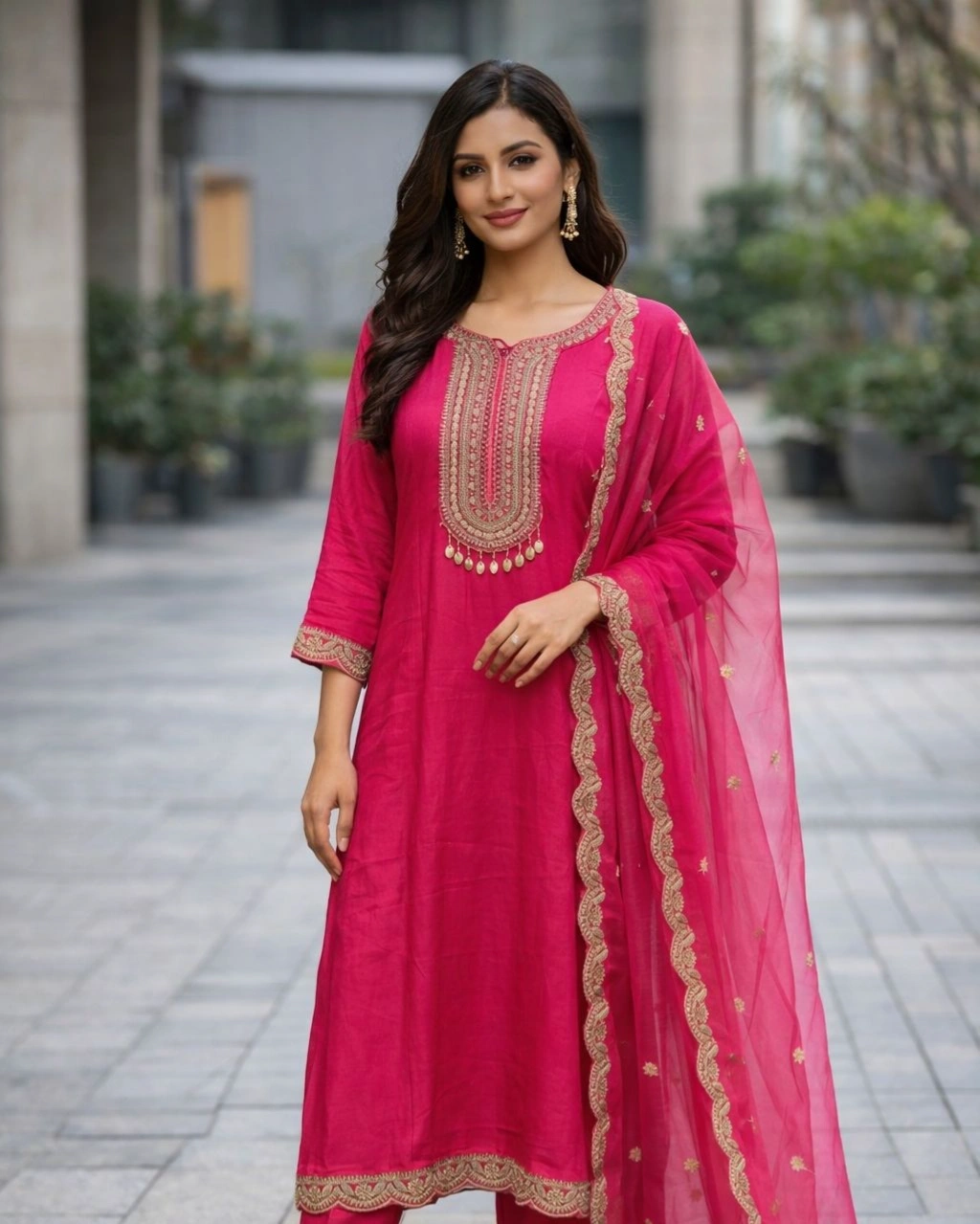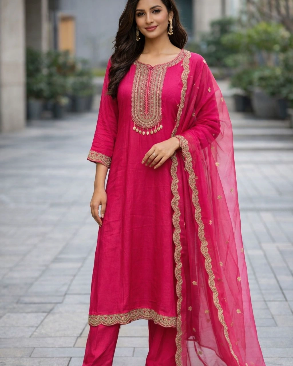 Product Name: Elegant Rani Pink Embroidered Kurta Pant Set with Designer Dupatta
