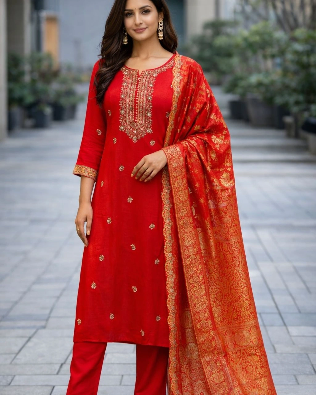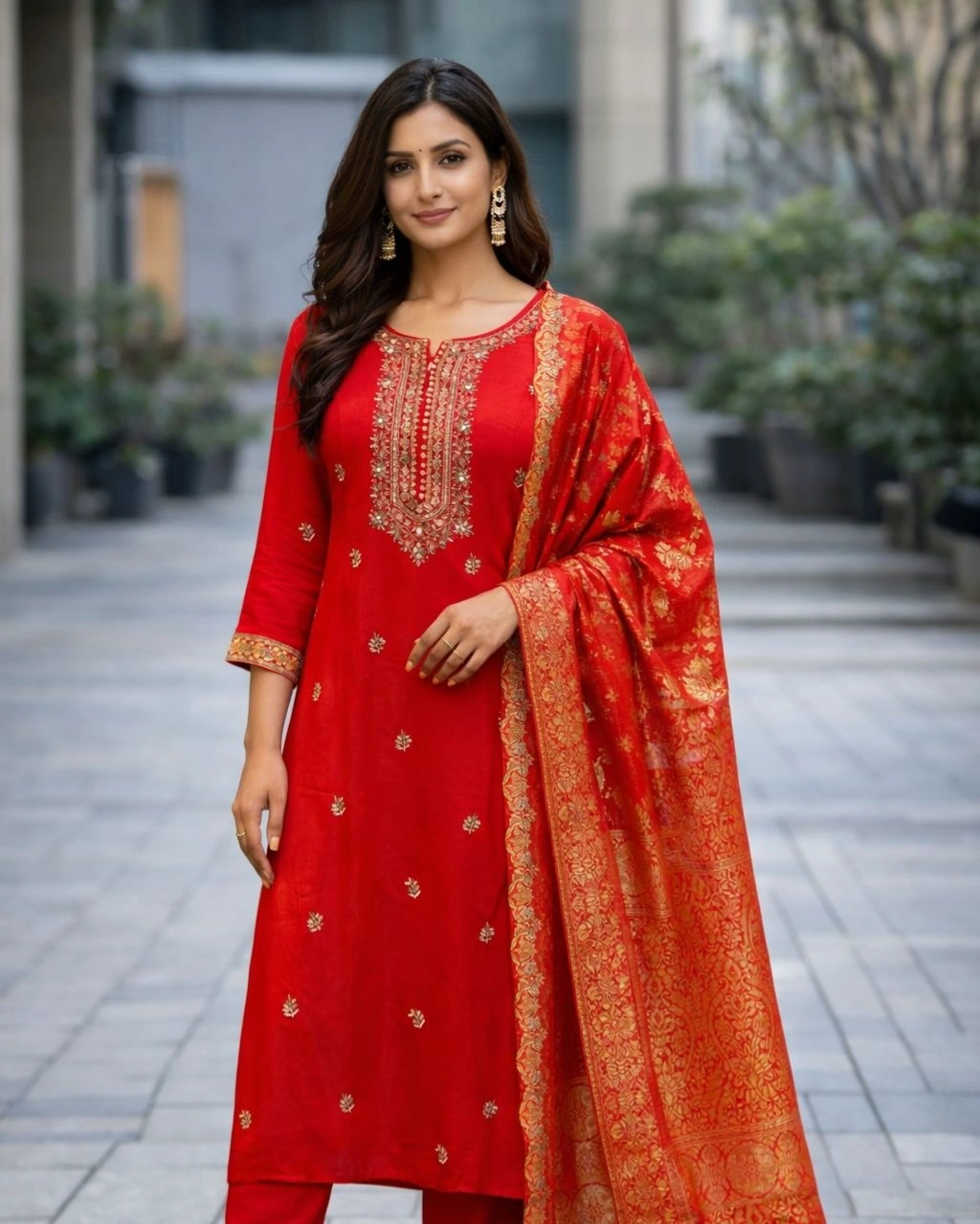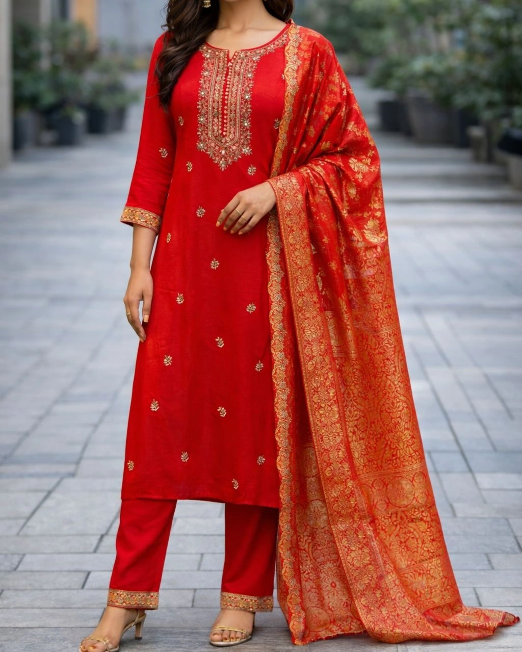 Product Name: Elegant Red & Gold Embroidered Kurta Pant Set with Designer Dupatta
