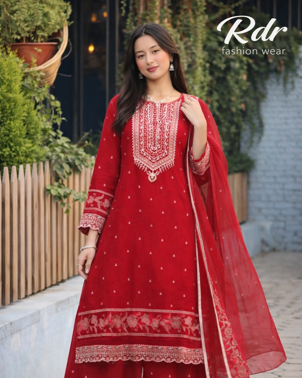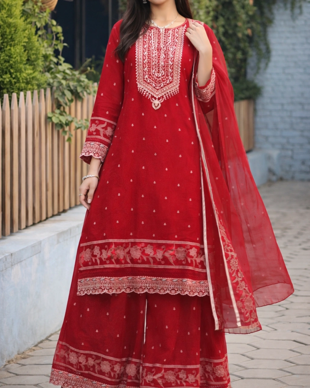 Product Name: Elegant Red Embroidered Kurta Palazzo Set