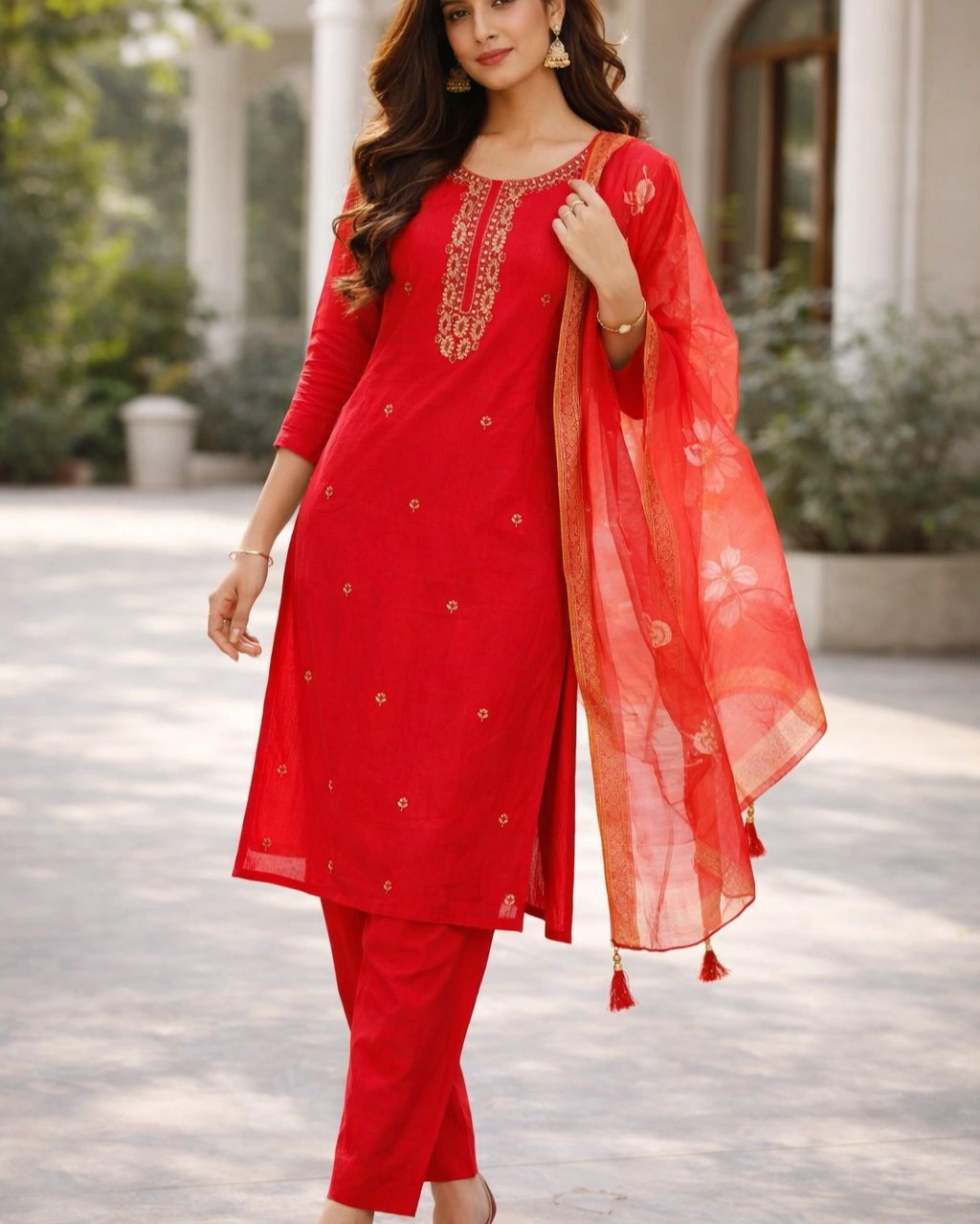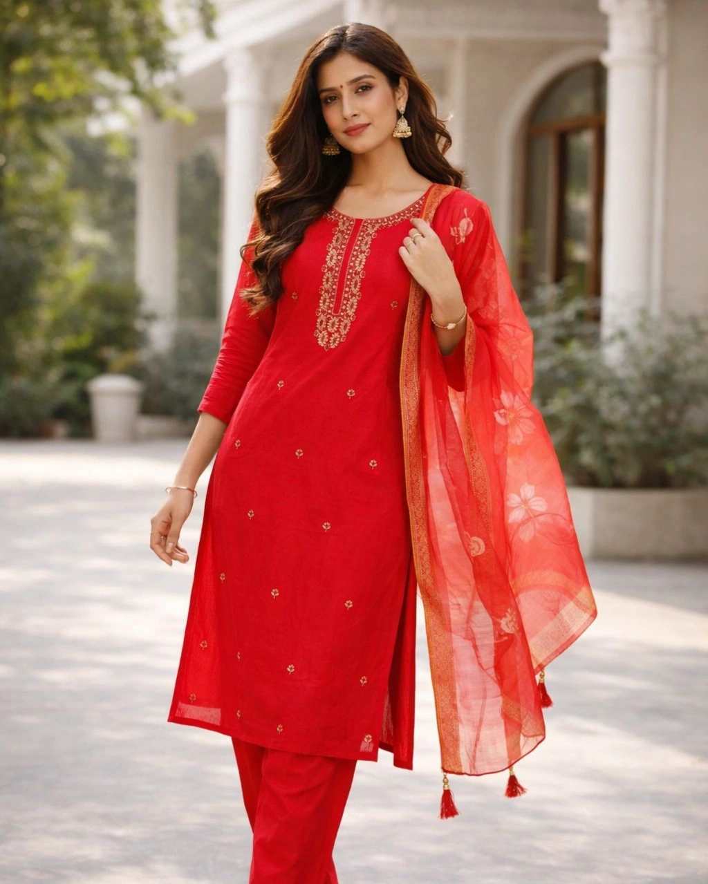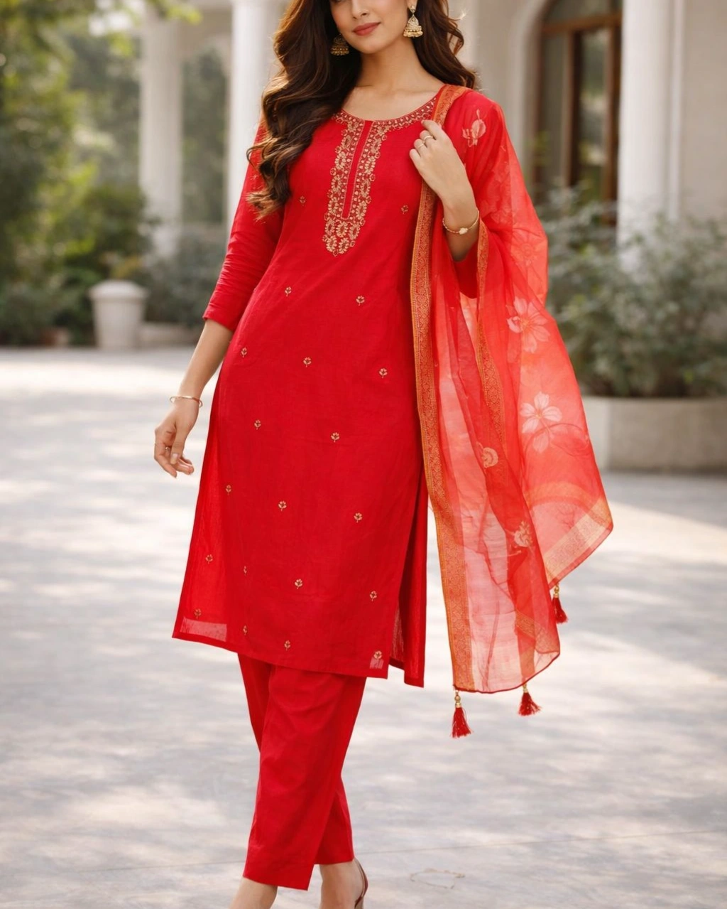 Product Name: Elegant Red Embroidered Kurta Pant Set with Sheer Dupatta
