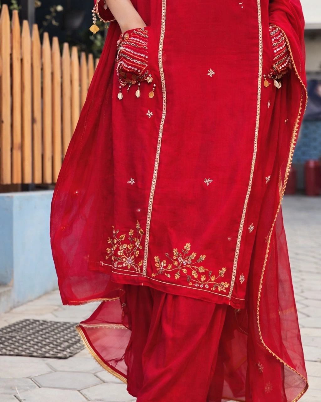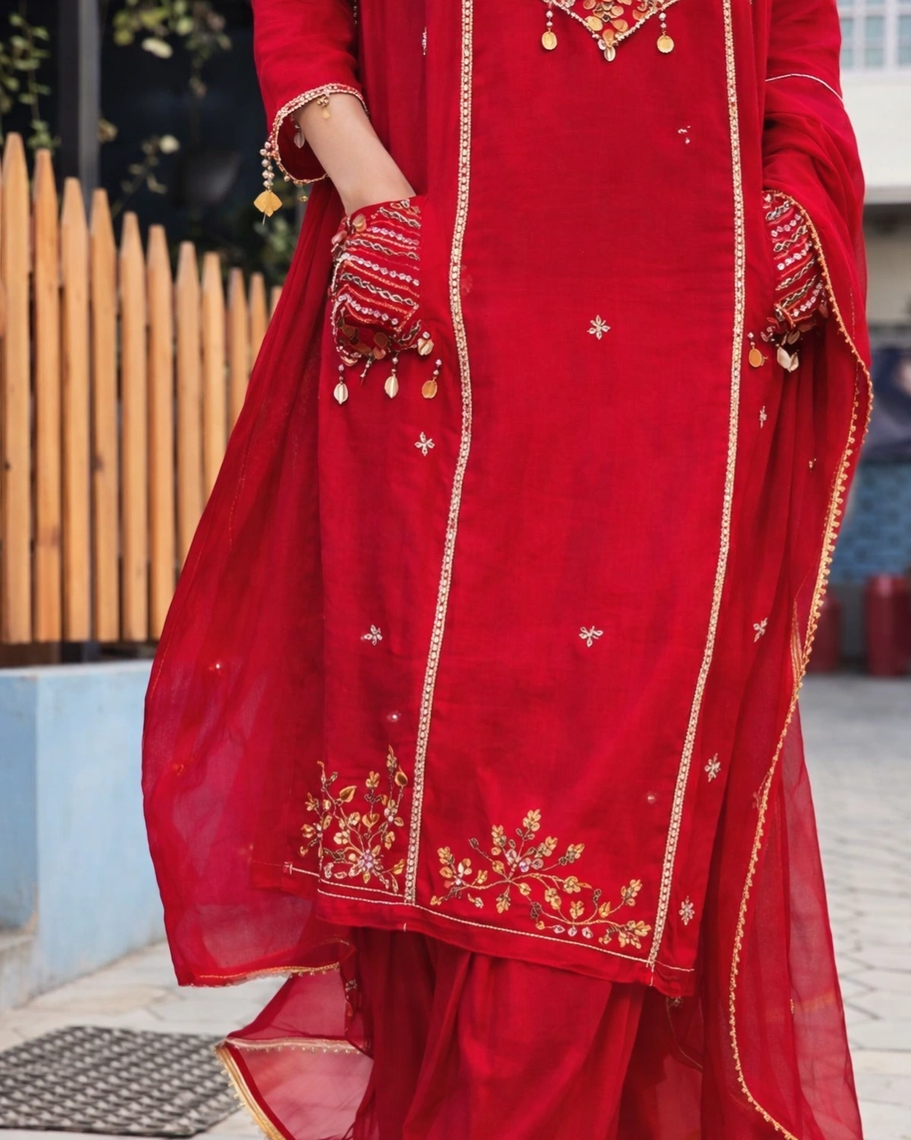 Beautiful heavy embroidery and sequin work on the neckline with intricate golden thread detailing and decorative mirror-style embellishments. The kurta is further enhanced with delicate floral embroidery on the hemline and subtle motifs across the fabric. The lightweight dupatta with golden border adds a rich festive touch.