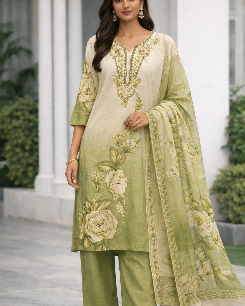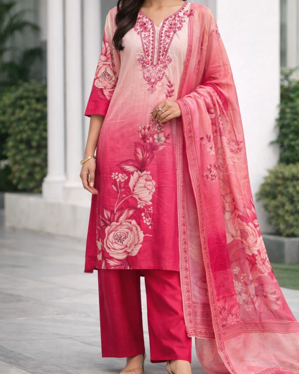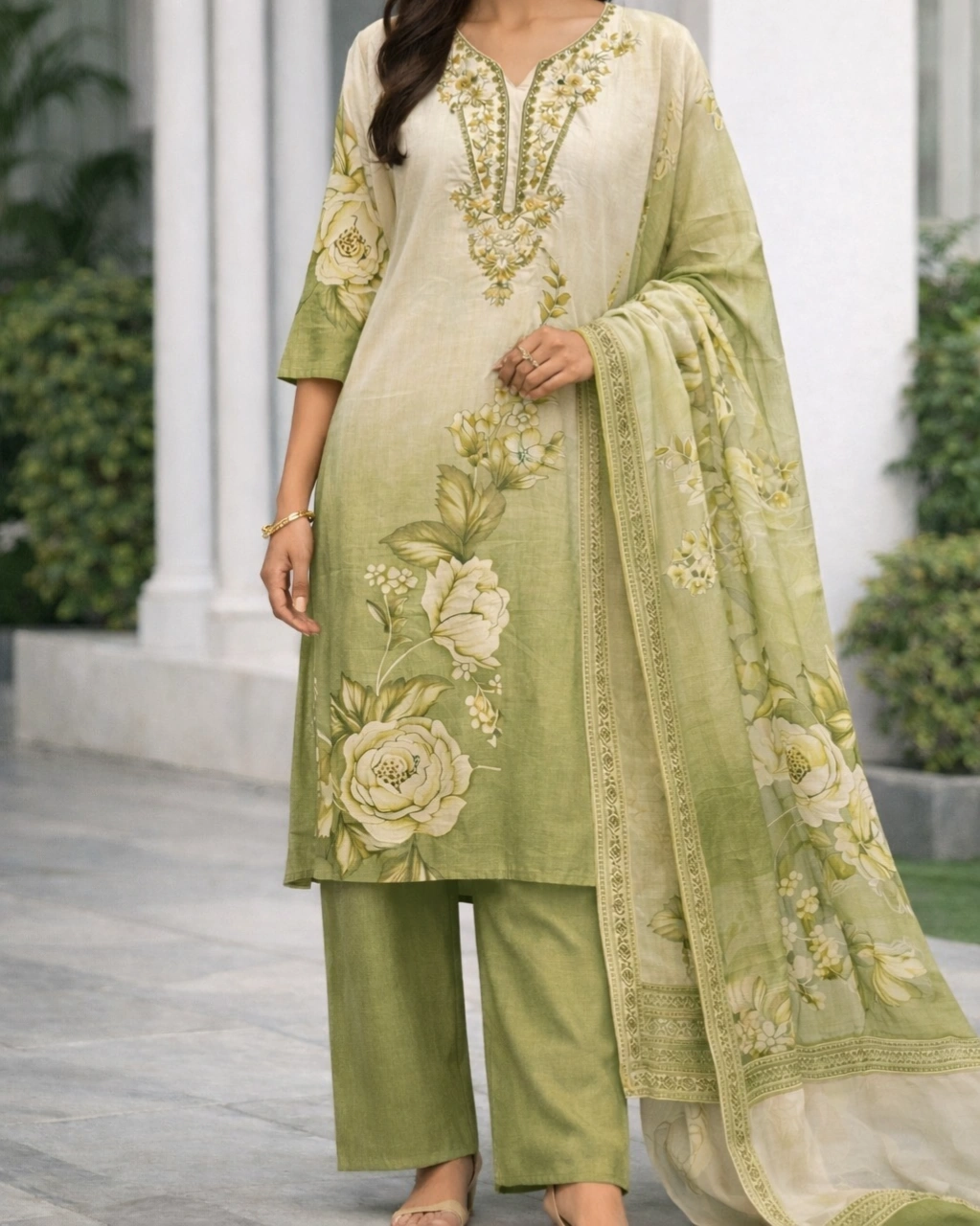 Work: Beautiful floral printed design with soft gradient shading on the kurta, complemented by delicate embroidered detailing on the neckline. The outfit is paired with a graceful printed dupatta featuring coordinated floral motifs and elegant border patterns that enhance the overall traditional charm.