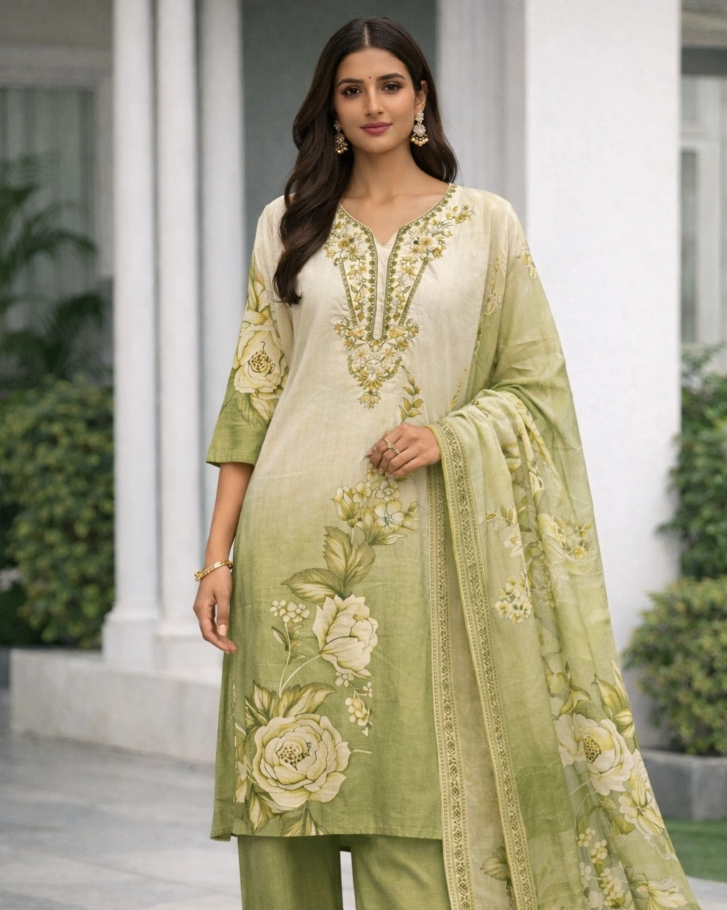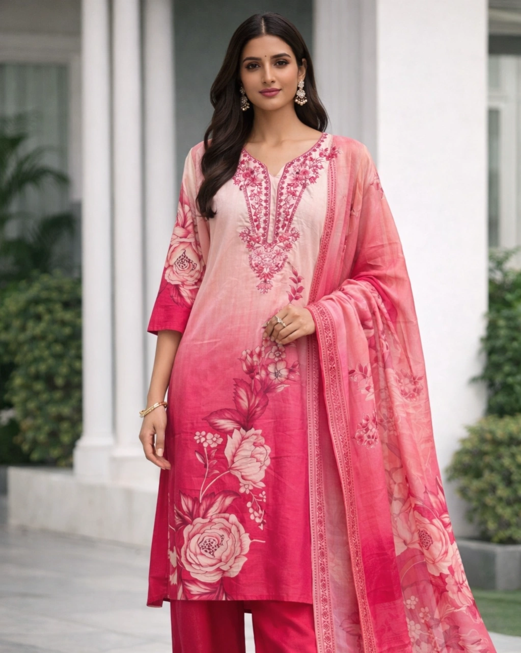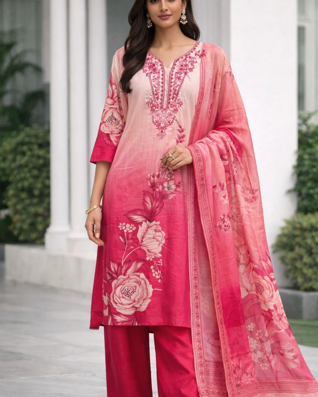 Work: Beautiful floral printed design with soft gradient shading on the kurta, complemented by delicate embroidered detailing on the neckline. The outfit is paired with a graceful printed dupatta featuring coordinated floral motifs and elegant border patterns that enhance the overall traditional charm.