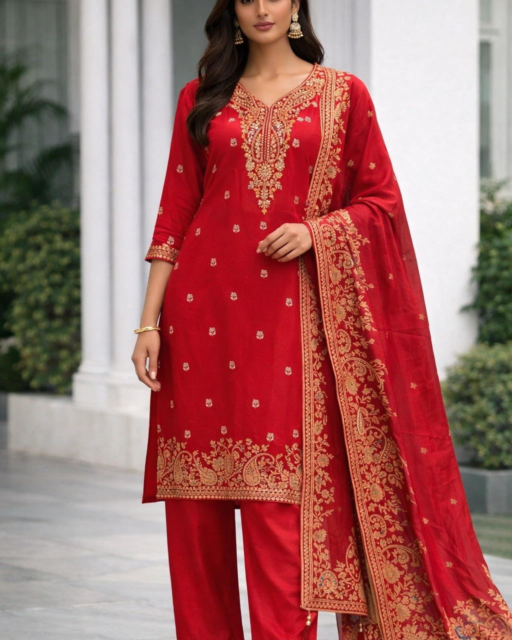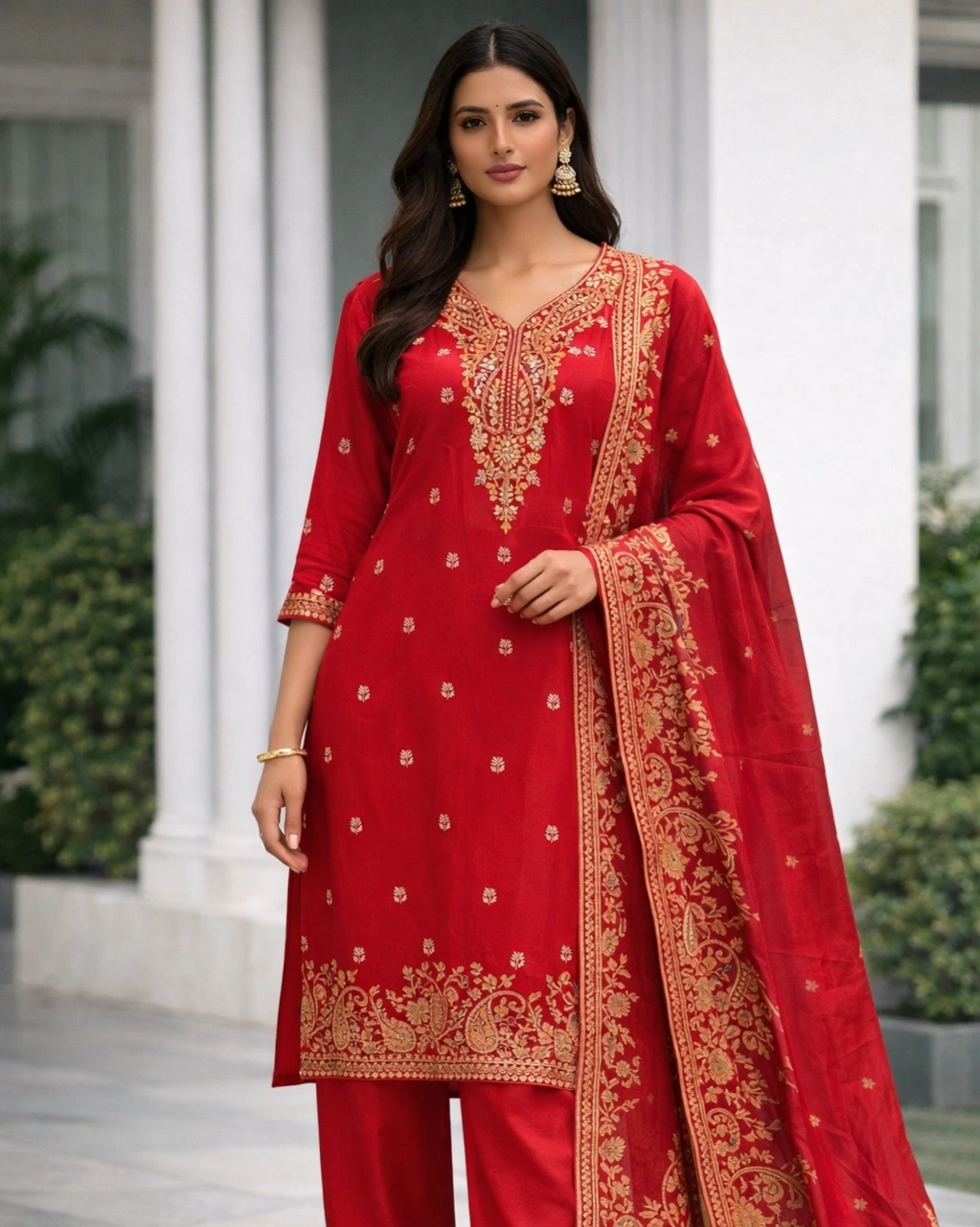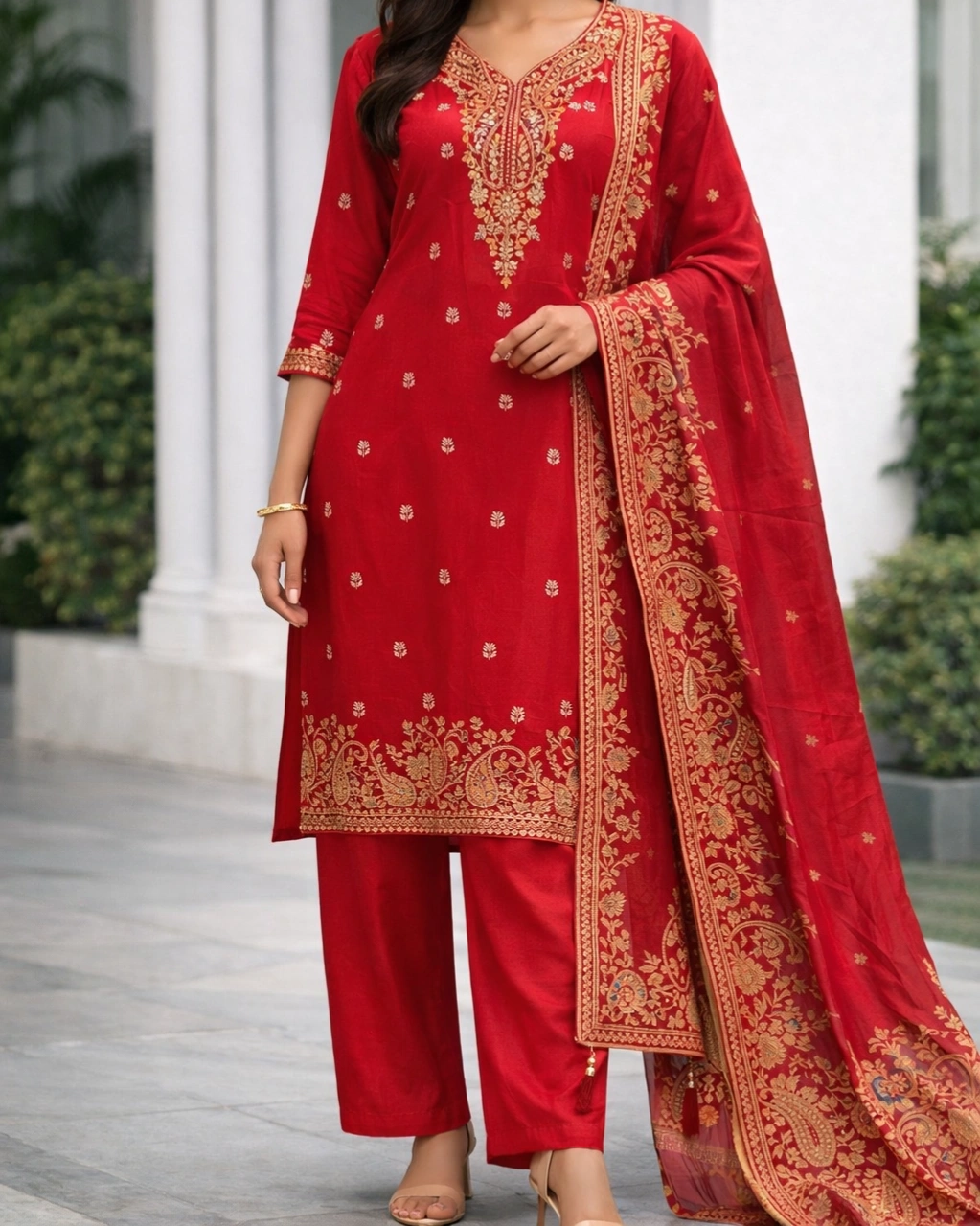 Style: Elegant ethnic outfit perfect for festive occasions, wedding functions, cultural celebrations, and special gatherings. The vibrant royal red shade combined with rich golden embroidery creates a luxurious and timeless traditional look.