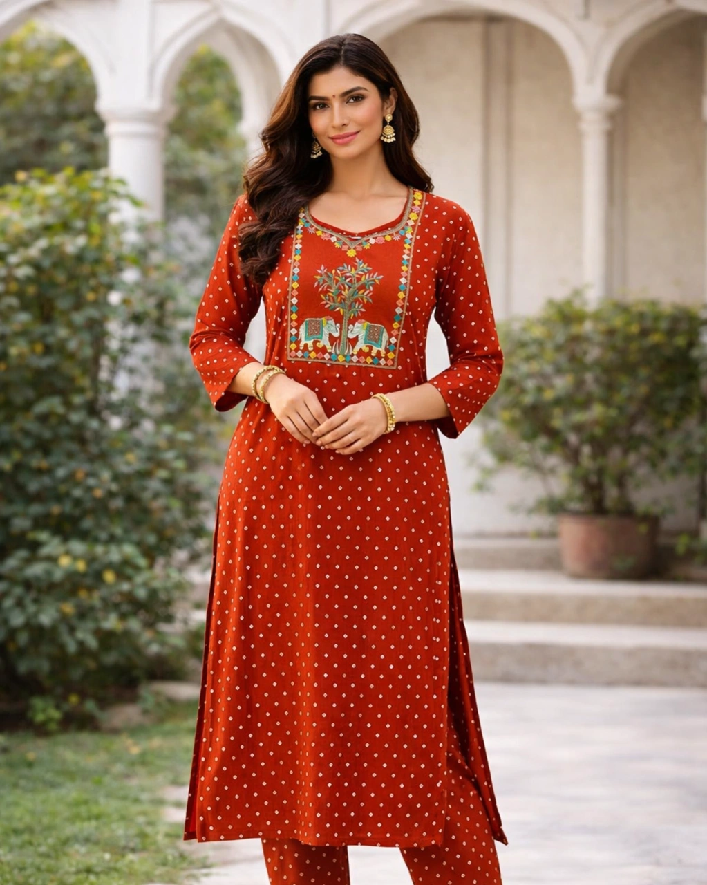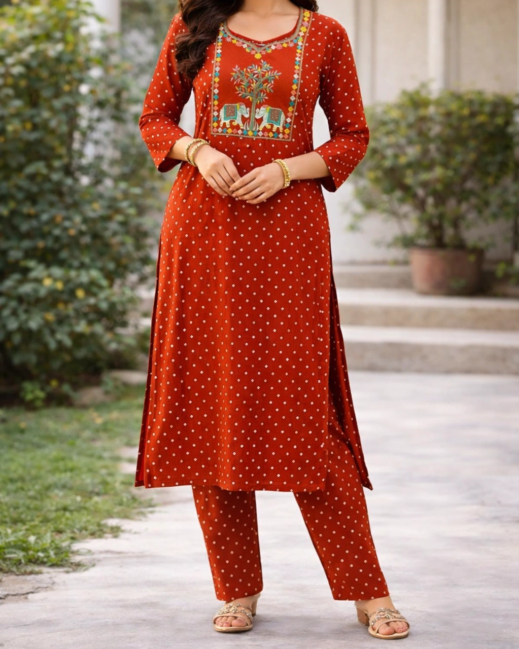 Color: Rust Orange with Multicolor Traditional Print