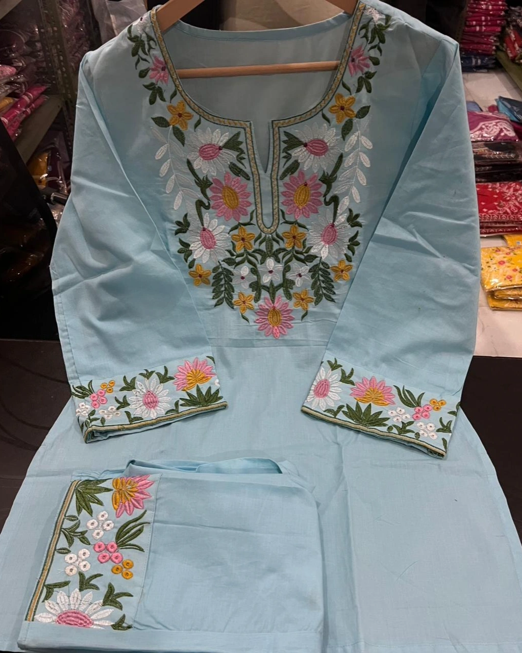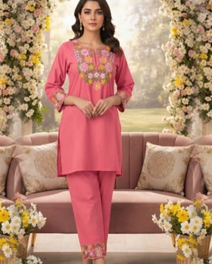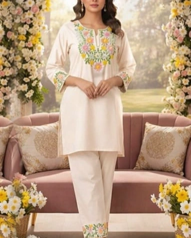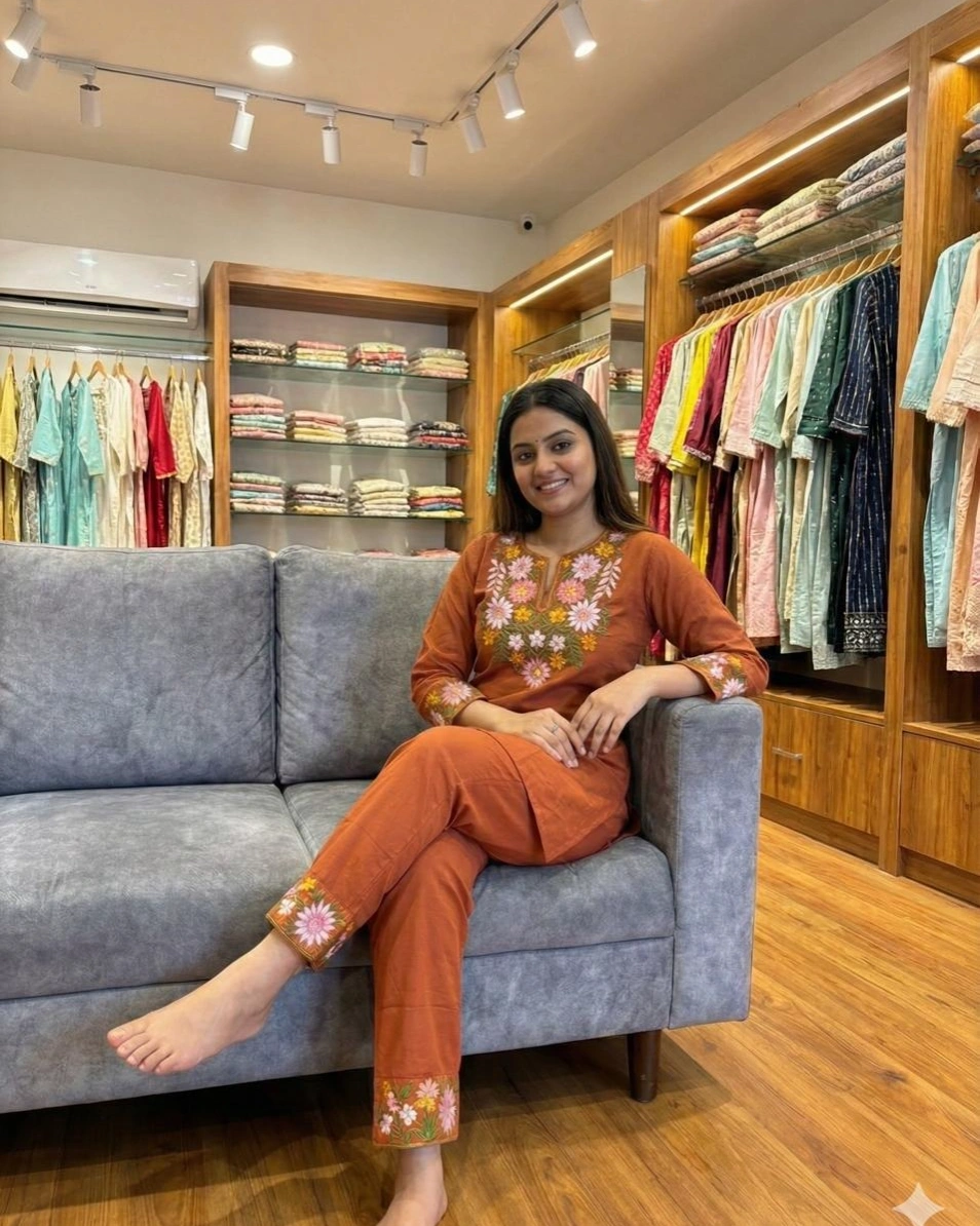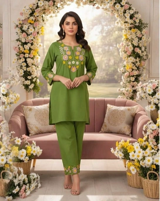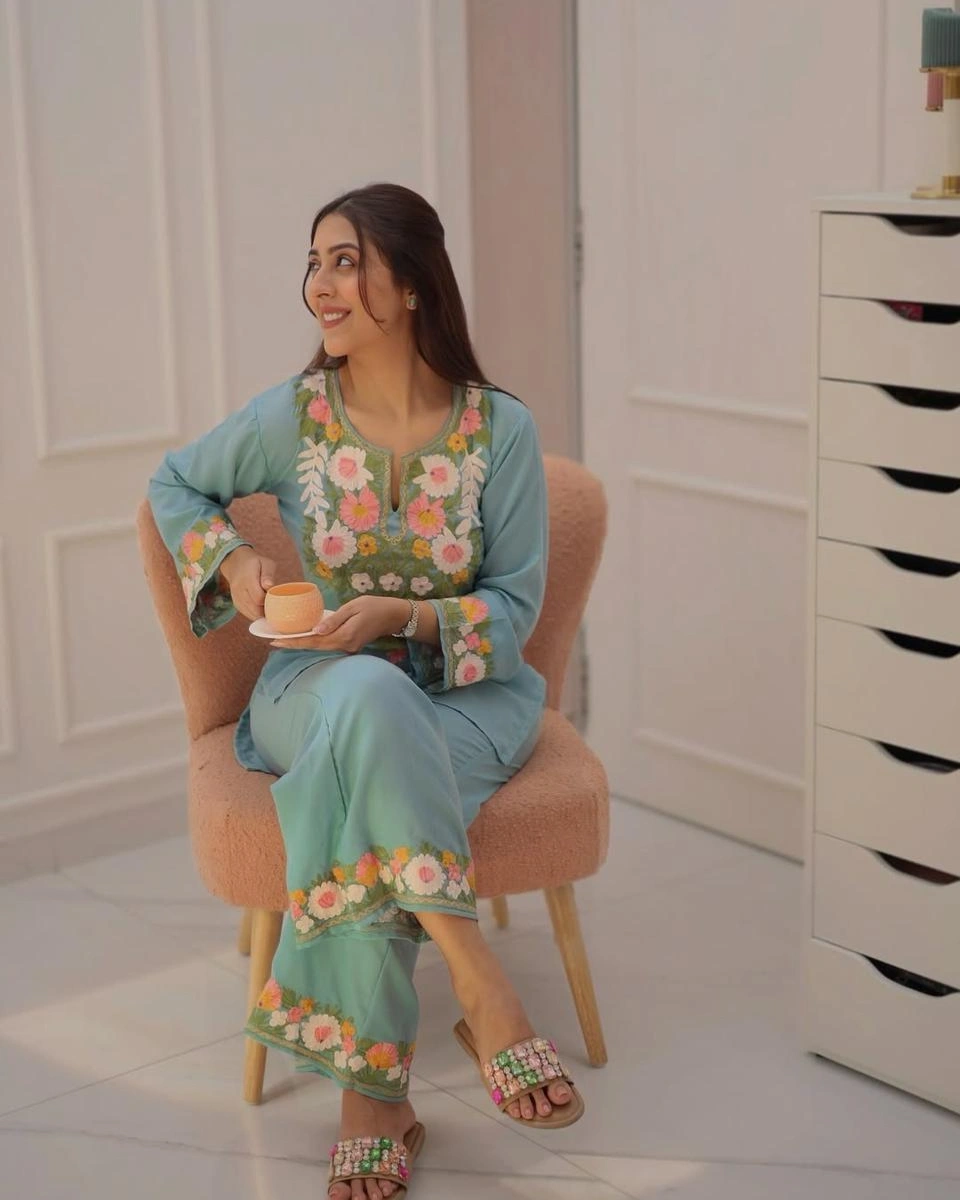 Elevate your ethnic wardrobe with this stunning teal kurta set, beautifully adorned with intricate floral embroidery on the neckline and sleeves. Designed to bring freshness and grace, this outfit is paired with matching pants featuring subtle embroidered detailing. Perfect for festive occasions, daytime events, or elegant casual wear, this set blends sophistication with comfort effortlessly.