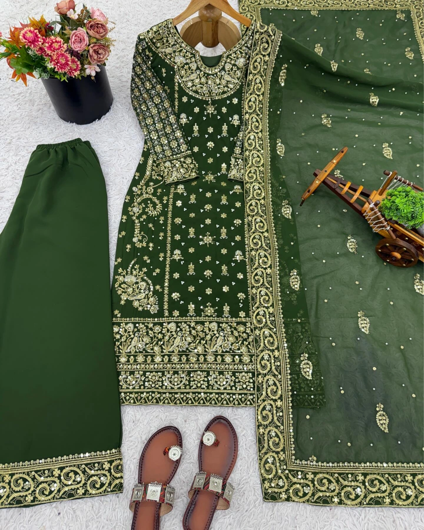Work: Intricate Golden Zari Embroidery with multi-layered border work on the hem, detailed neck embroidery, and beautiful floral boota work all over the body. Includes matching golden sequence and zari borders on the trousers and dupatta.