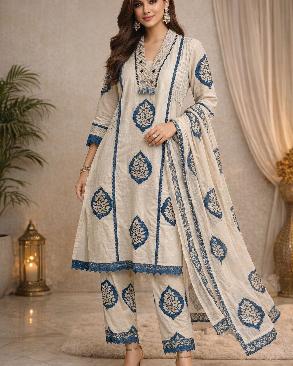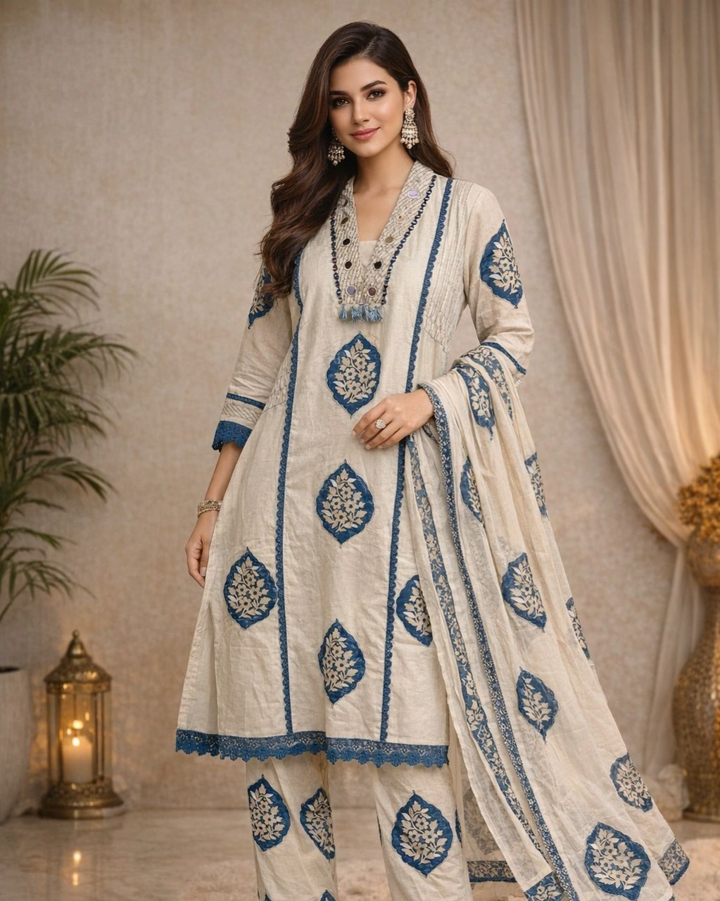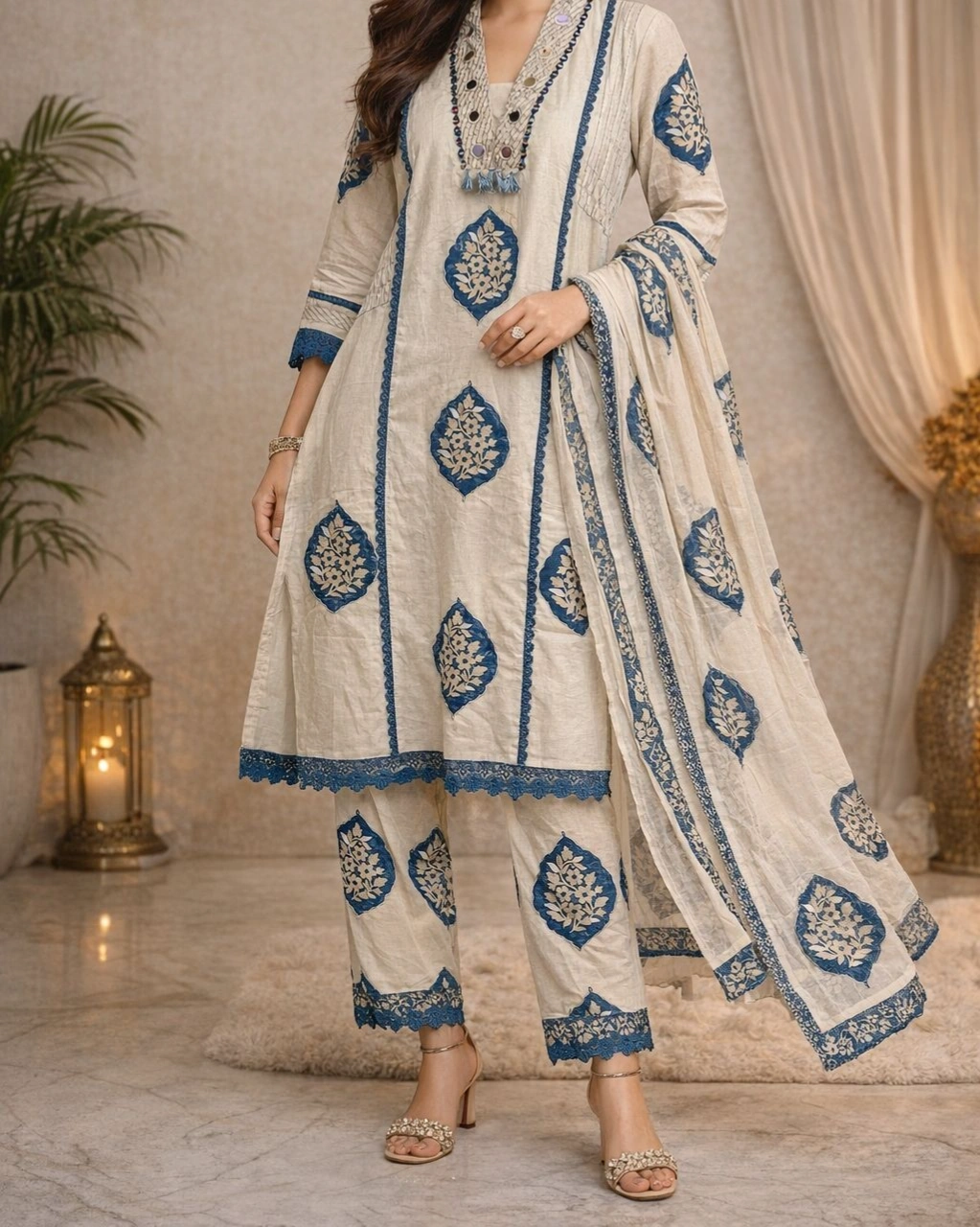 Step into effortless elegance with this beautifully designed ivory kurta set, adorned with graceful blue traditional prints. The soothing color combination and intricate detailing make it perfect for both casual gatherings and festive occasions. Paired with matching bottoms and a lightweight dupatta, this outfit brings together comfort and timeless style in one look.