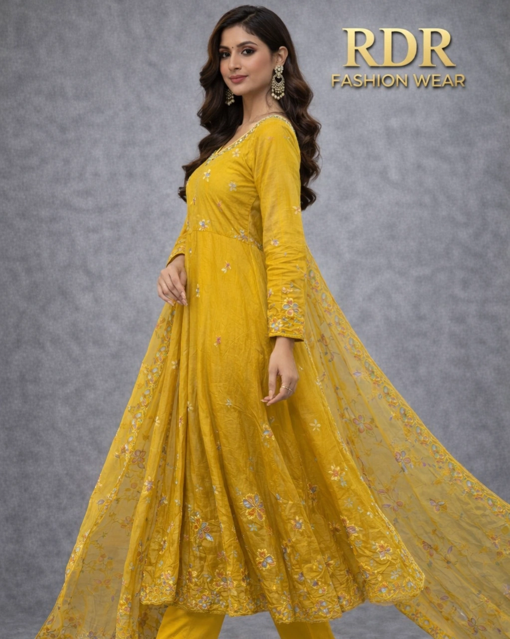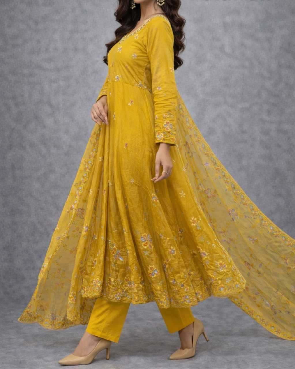 Product Name: Mustard Yellow Floral Embroidered Anarkali Set