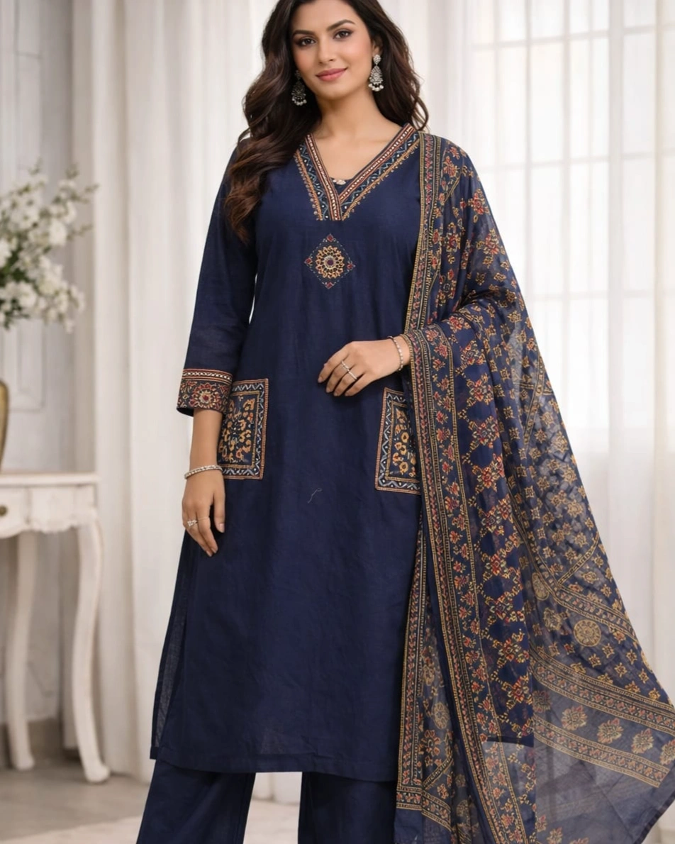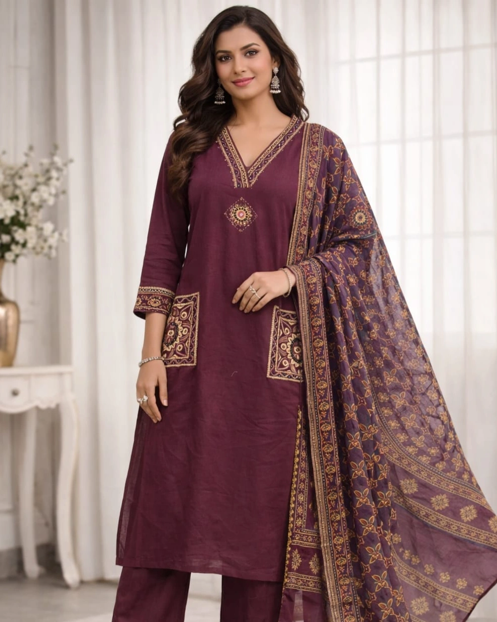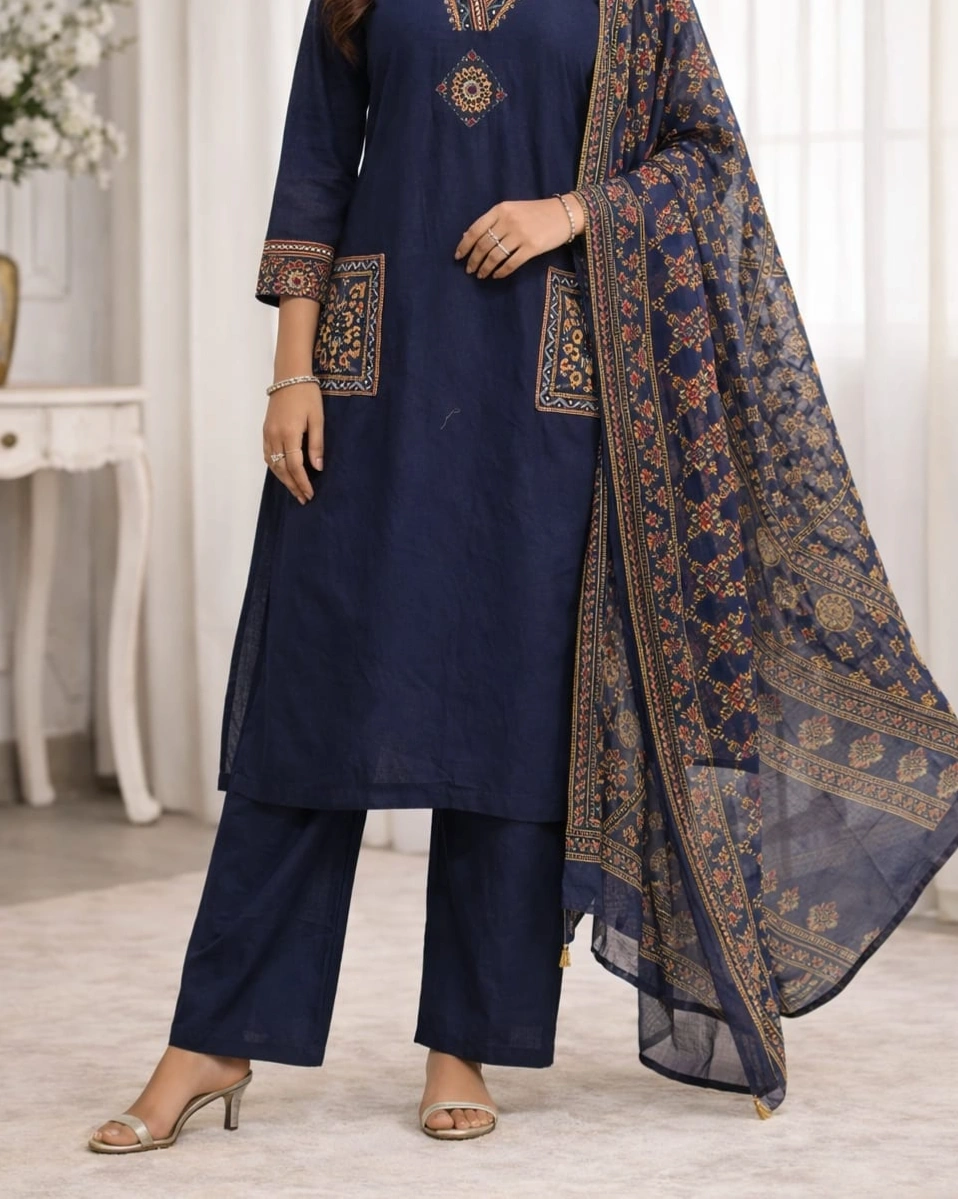 Beautiful ethnic-inspired prints enhance the kurta with a detailed V-neckline design and stylish printed pocket accents, giving it a modern yet traditional touch. The highlight is the rich printed dupatta featuring intricate patterns and elegant borders, adding depth and a luxurious feel to the overall look.