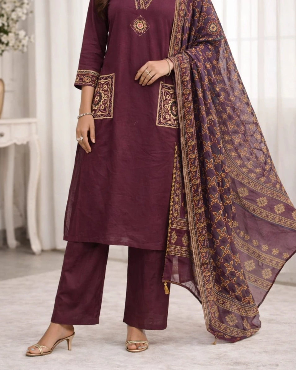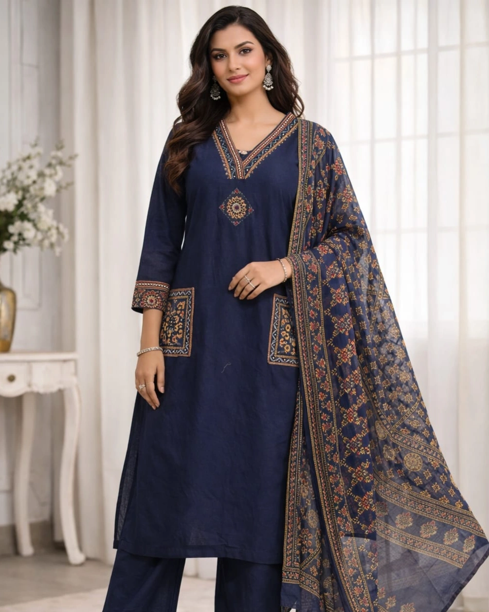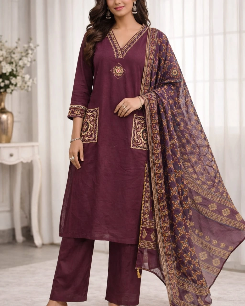 Beautiful ethnic-inspired prints enhance the kurta with a detailed V-neckline design and stylish printed pocket accents, giving it a modern yet traditional touch. The highlight is the rich printed dupatta featuring intricate patterns and elegant borders, adding depth and a luxurious feel to the overall look.
