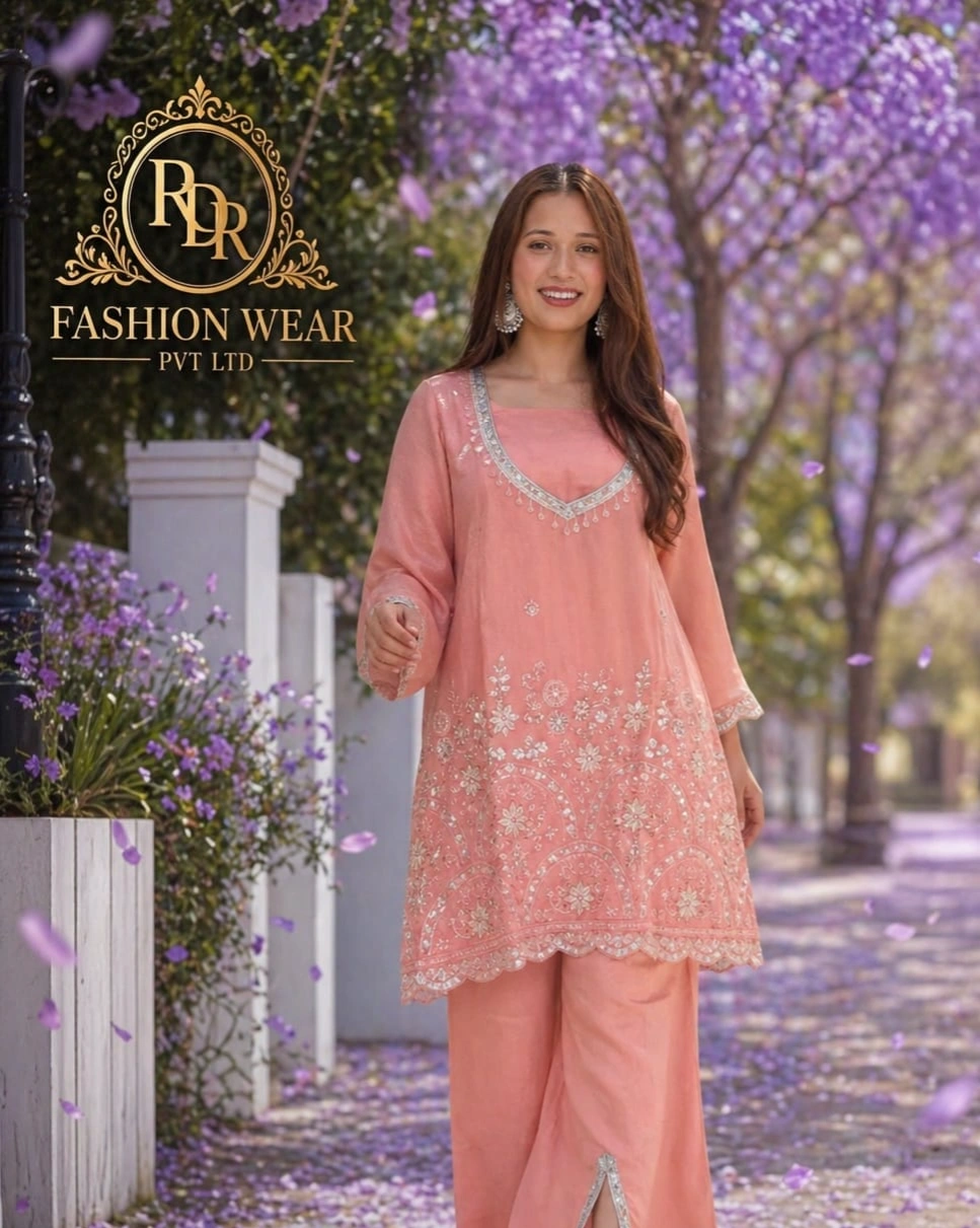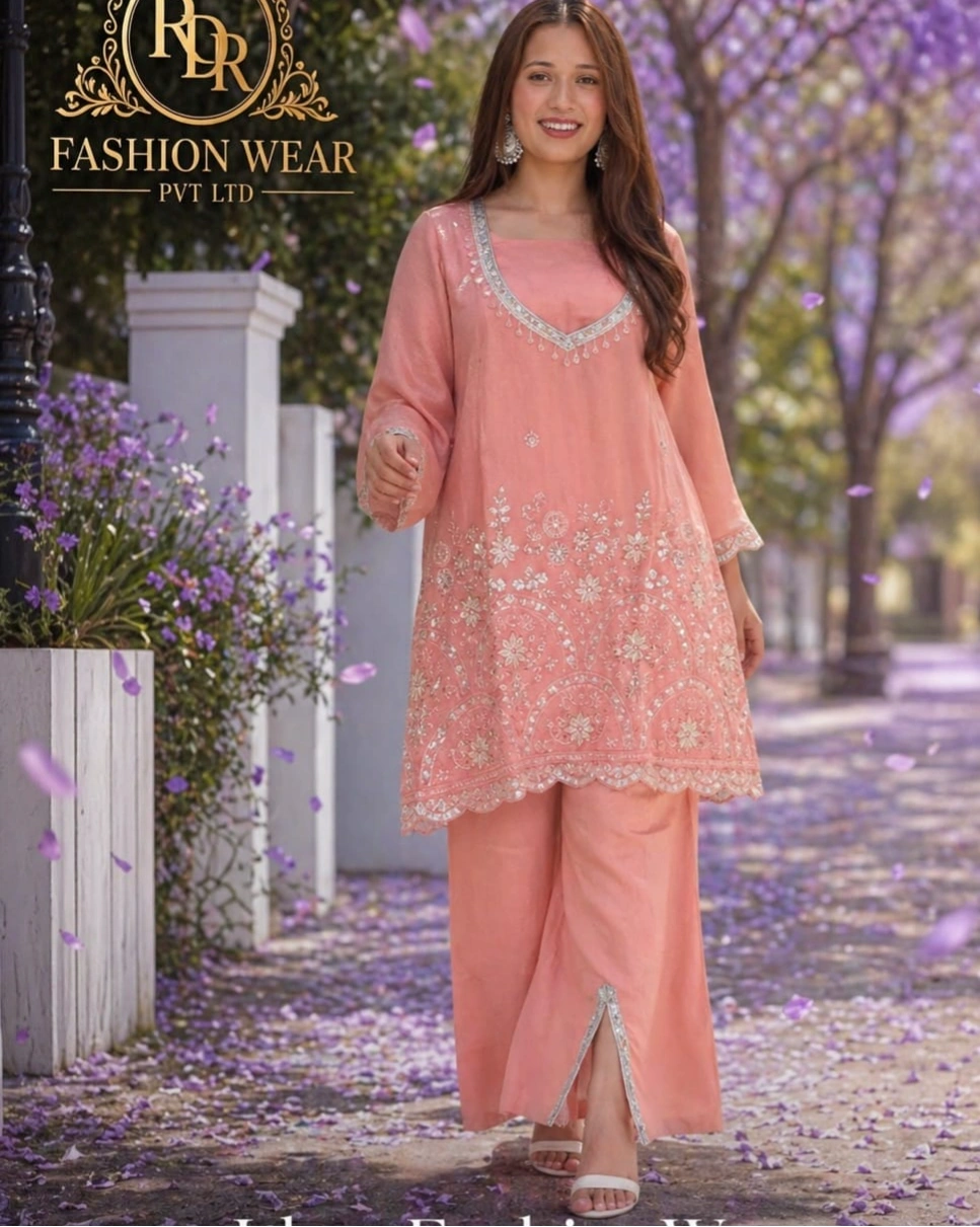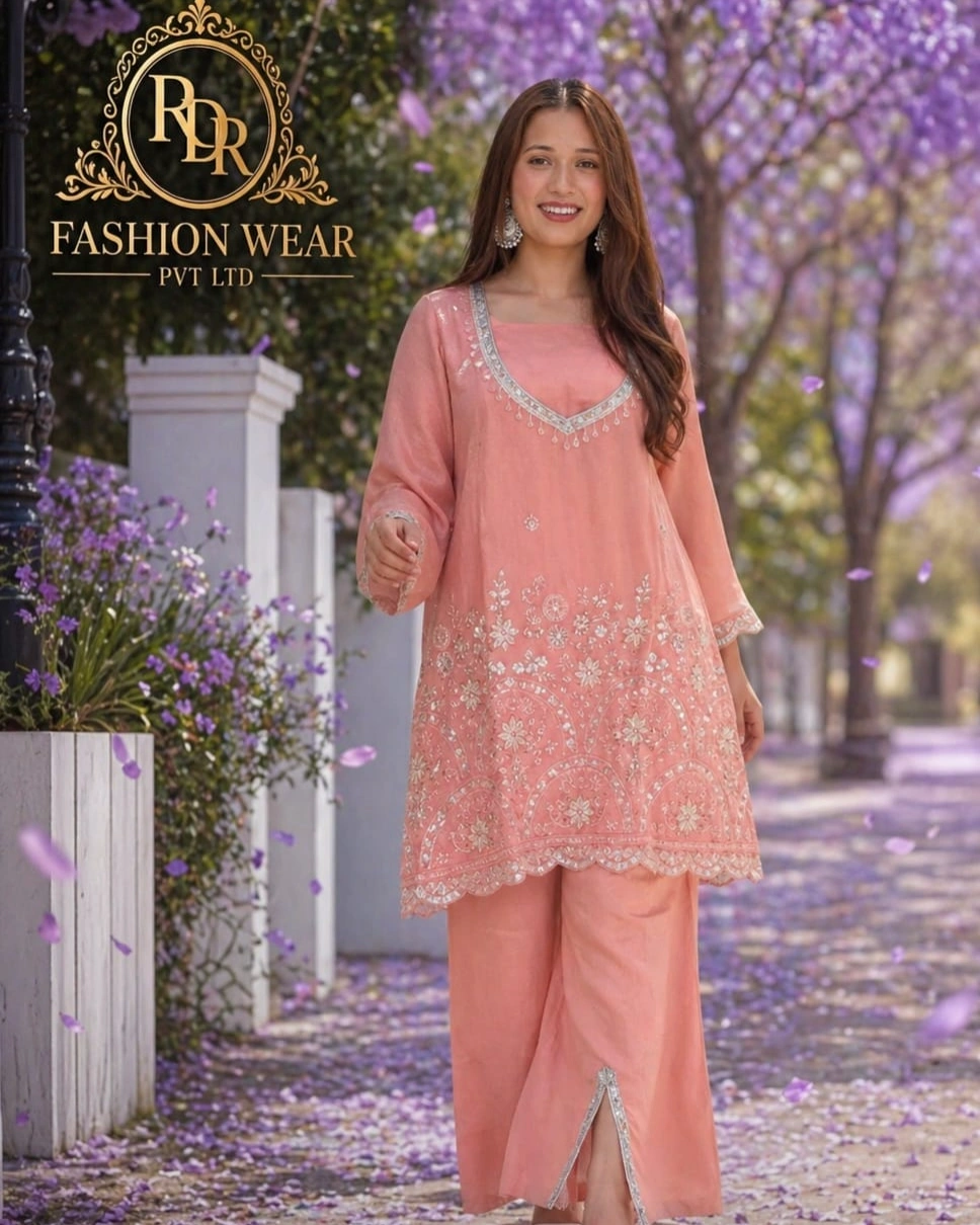 Radiate elegance with this soft peach kurta set, beautifully adorned with intricate embroidery that adds a delicate festive charm. The kurta features a graceful neckline with fine detailing and a slightly flared silhouette, paired with straight-fit pants for a balanced modern look. Perfect for daytime events, festive occasions, and elegant casual wear.