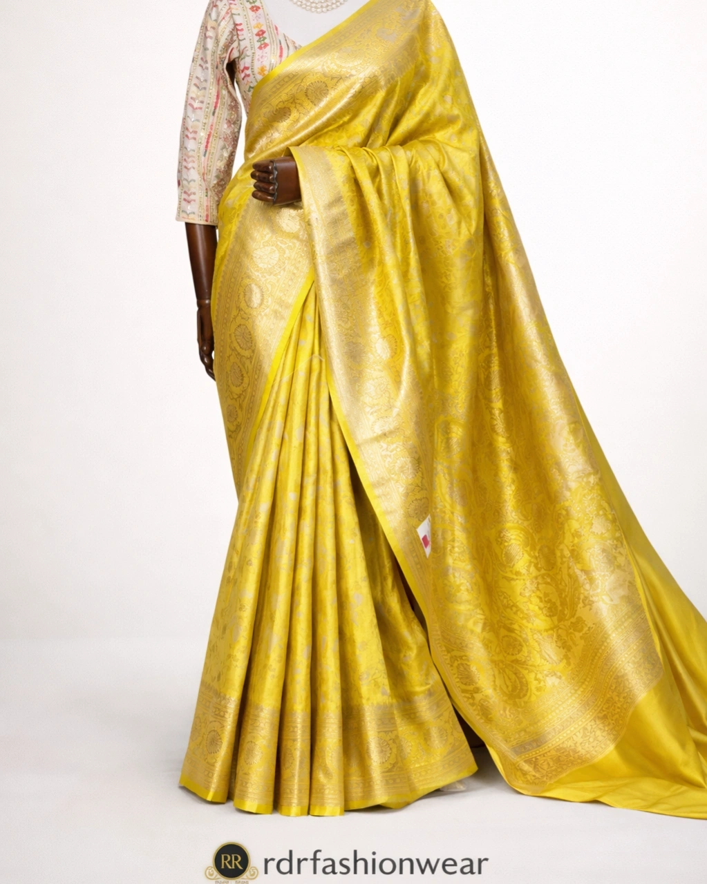 This elegant Banarasi Silk Saree from RDR Fashion Wear features a vibrant royal yellow base beautifully enhanced with intricate gold zari weaving. The saree showcases classic floral and paisley motifs along with a rich zari border that gives it a luxurious and festive appearance. Paired with a stylish embroidered blouse, this saree is an excellent choice for weddings, Dashain, Tihar, and special celebrations.