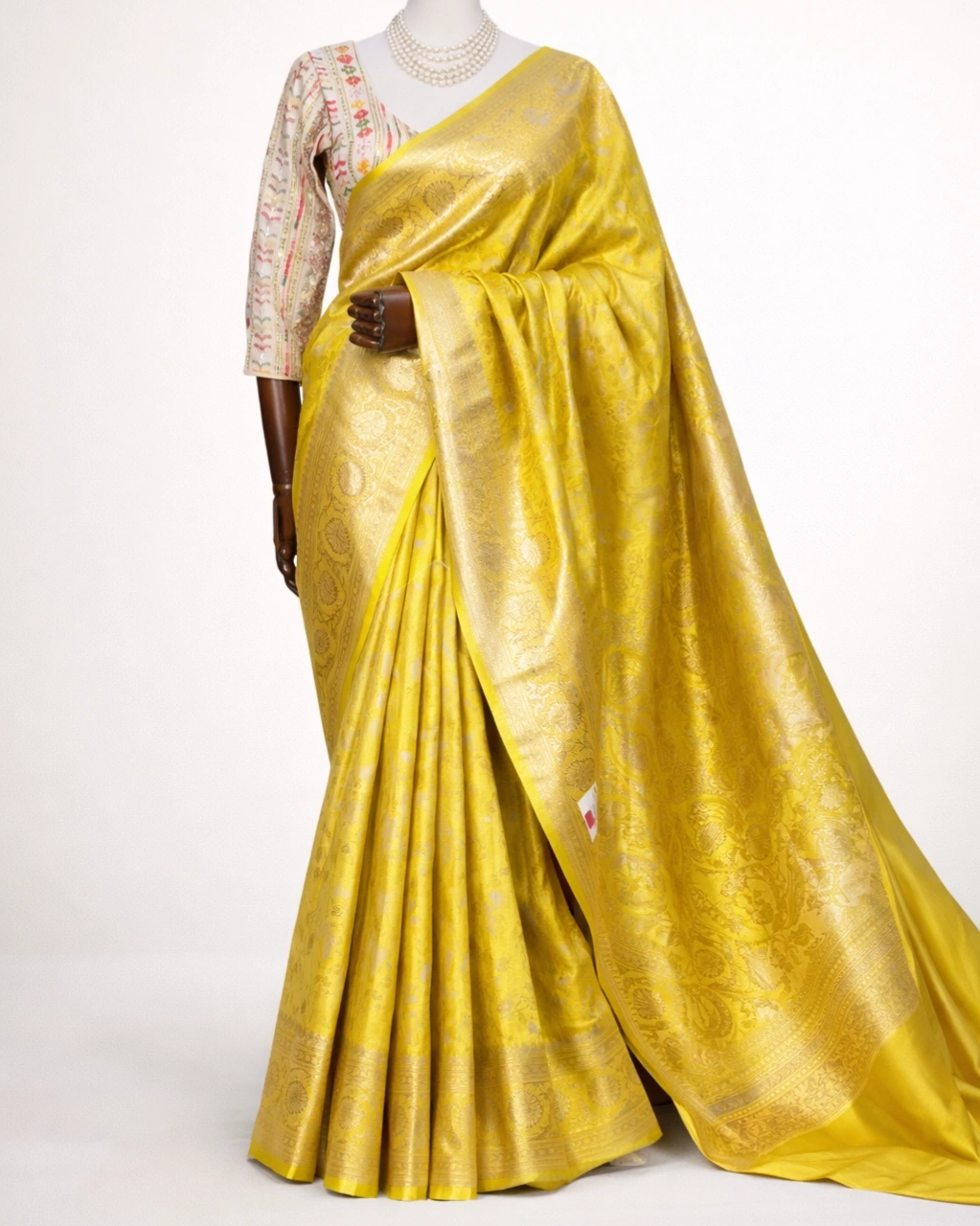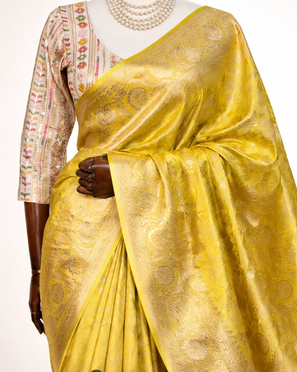 Rich Gold Zari Weaving with Traditional Floral and Paisley Motifs