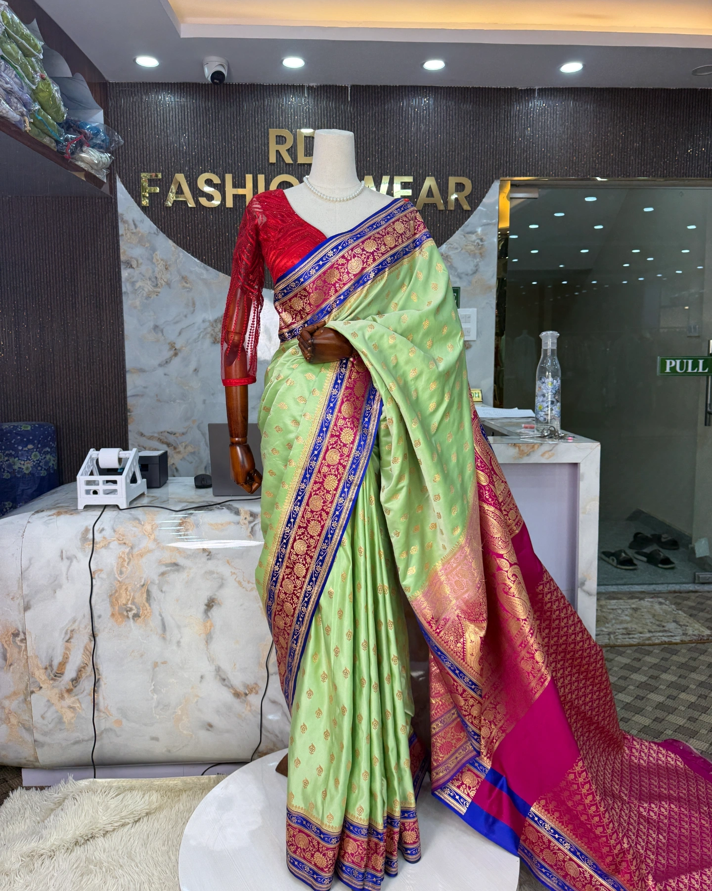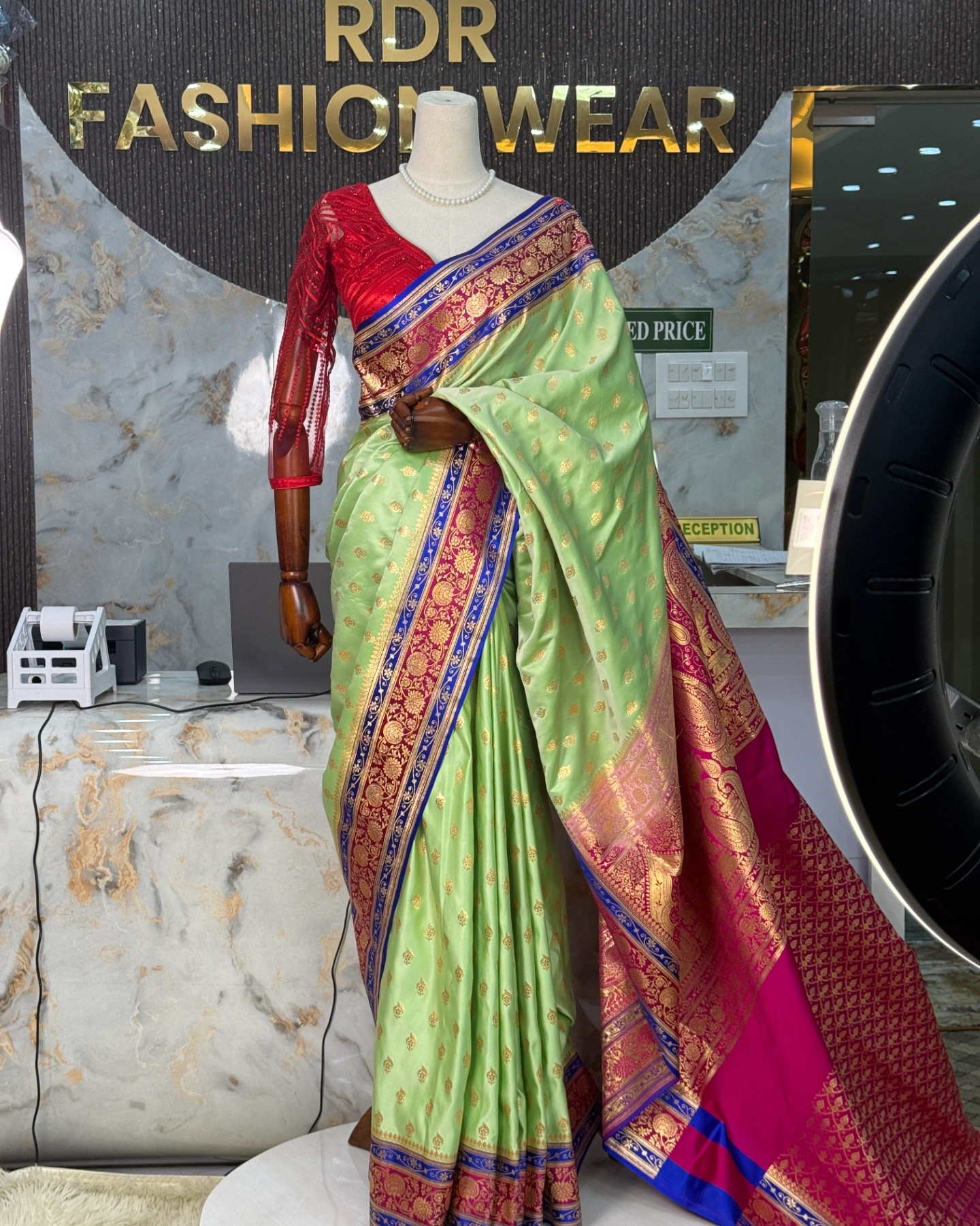 This stunning Banarasi Silk Saree from RDR Fashion Wear features a beautiful pistachio green base decorated with delicate gold zari butta motifs across the saree. The grand royal blue and pink zari border with heavy traditional weaving adds a luxurious and royal appearance. The rich pallu with intricate zari work enhances the elegance, making it an ideal choice for weddings, festive celebrations, and special occasions.