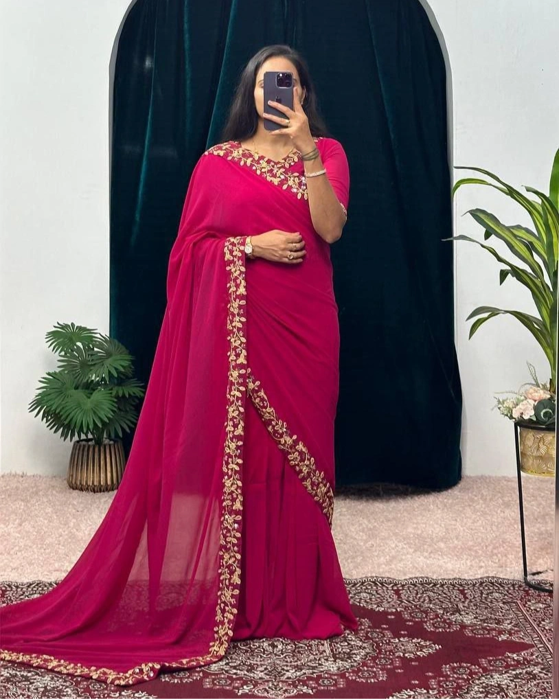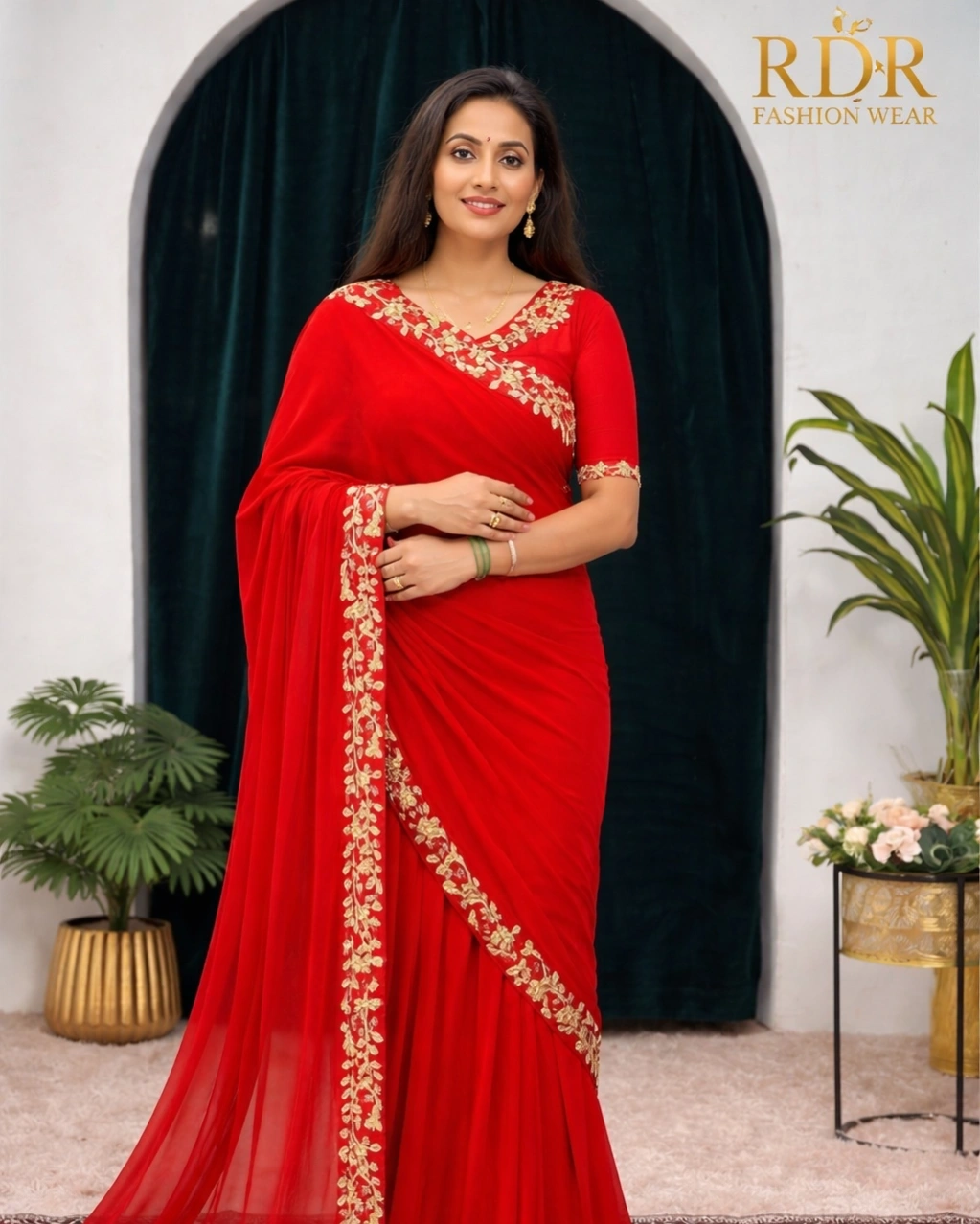 Upgrade your ethnic wardrobe with this stunning red embroidered saree from RDR Fashion Wear. Crafted from premium soft fabric, this saree features elegant golden floral embroidery along the border, giving it a luxurious and festive look. Perfect for weddings, parties, and traditional occasions, this saree offers both comfort and style.